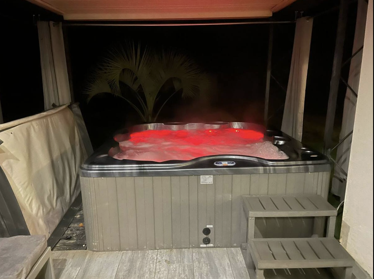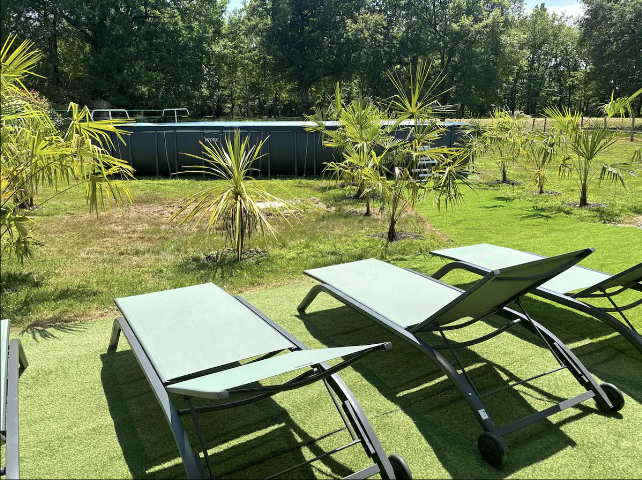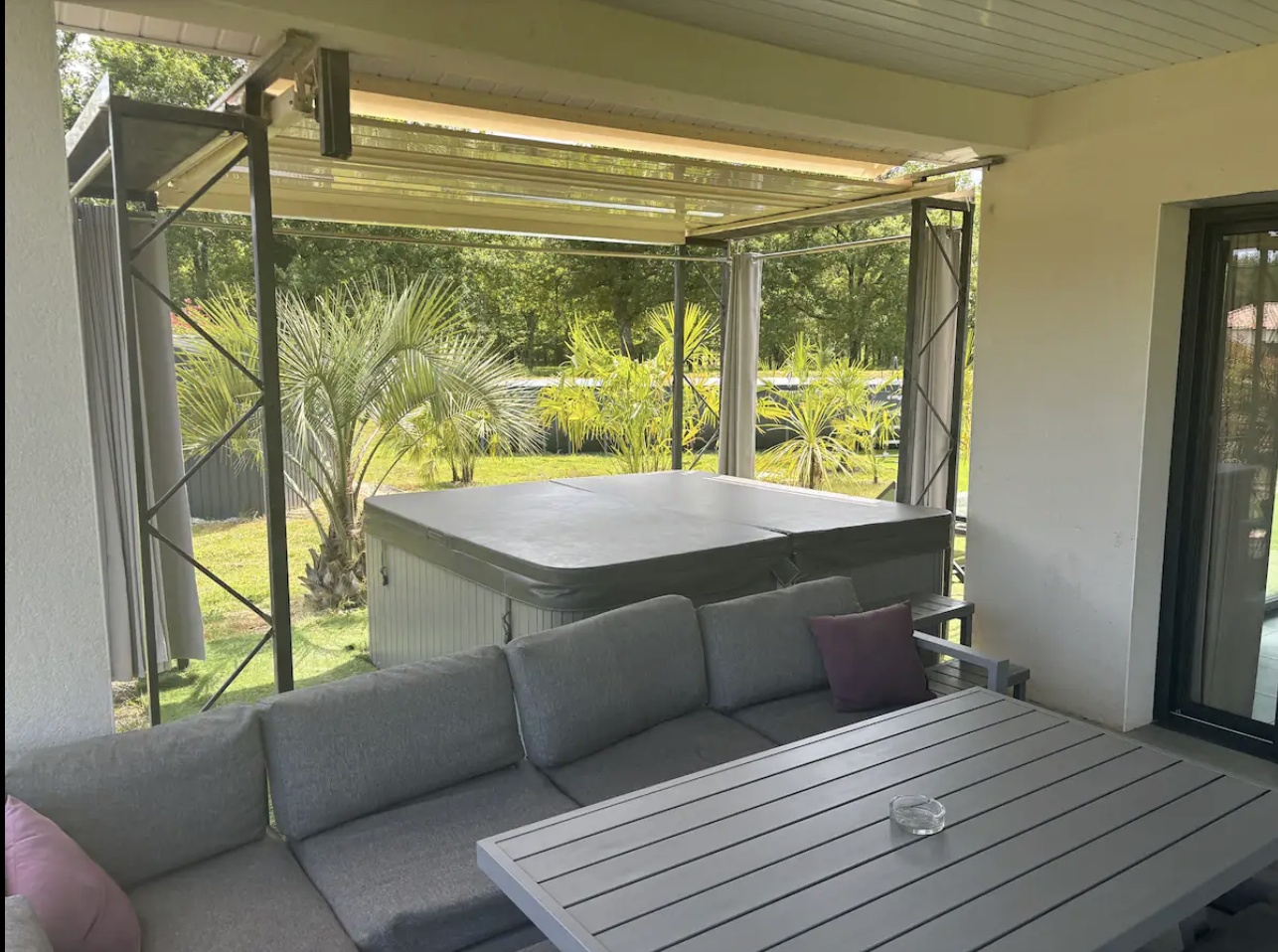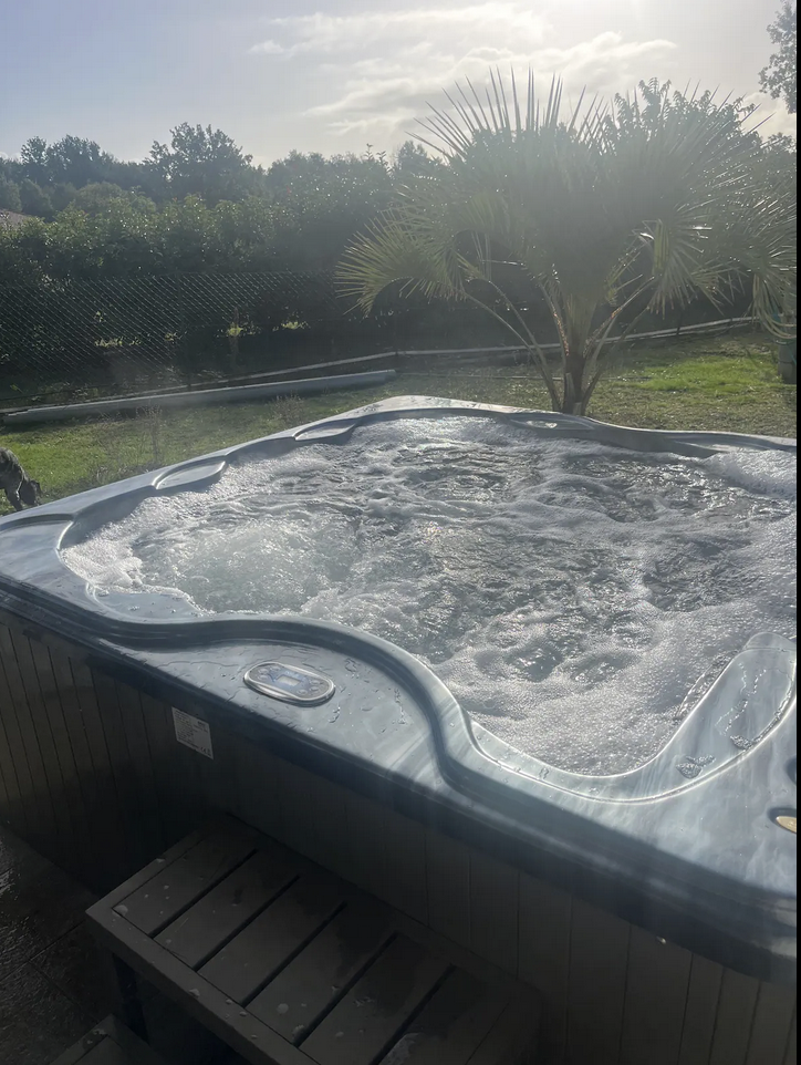 A l’extérieur : terrain privé (200m2) clos, parking privé, terrasse couverte (36 m2) avec jacuzzi 6 personnes, table de ping-pong, baby-foot, piscine hors-sol (10 m x 5 m – profondeur 1.20 m) en fonction du 15 mai au 15 septembre.