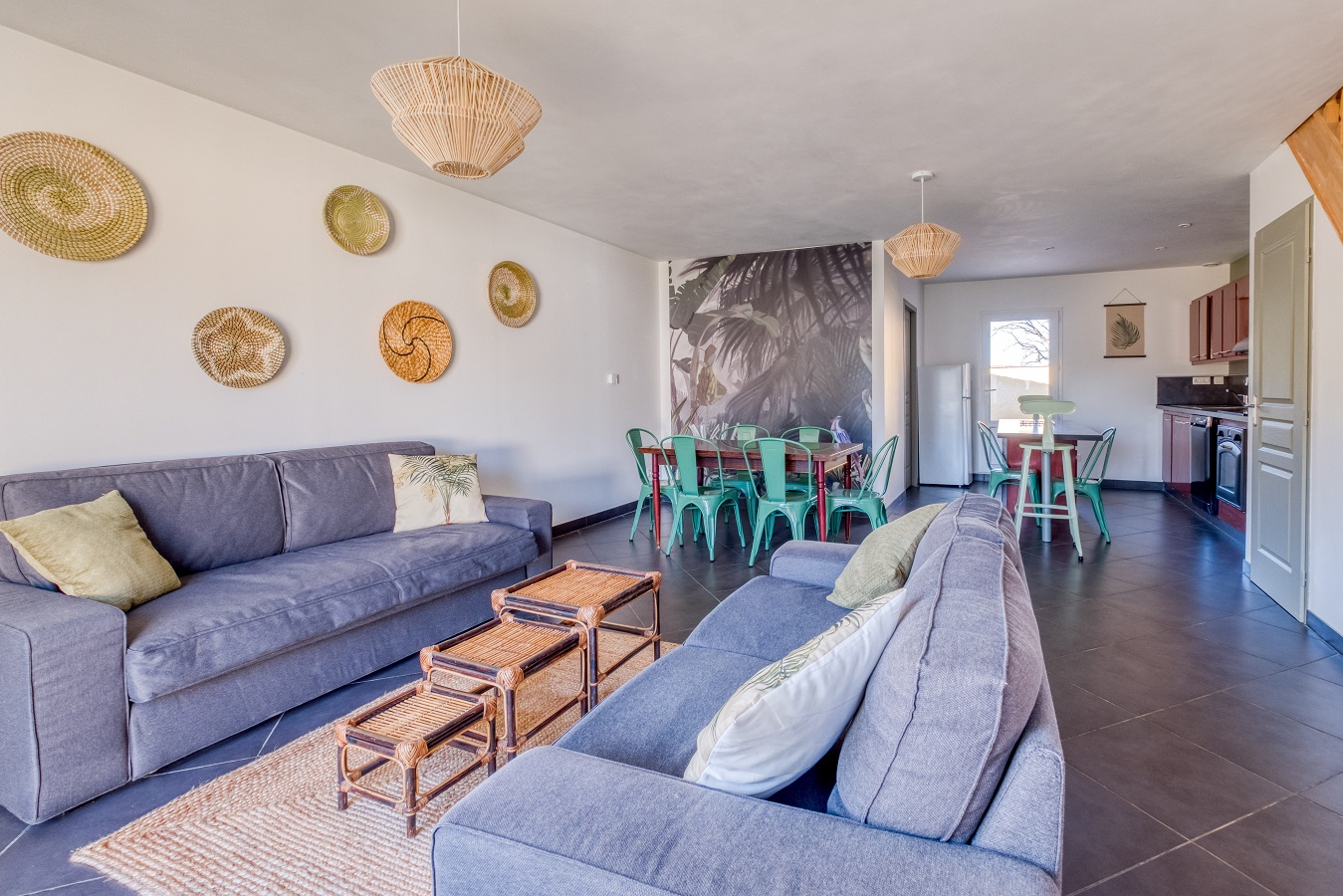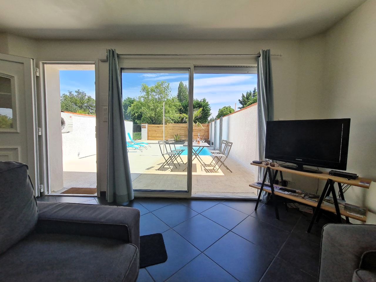 Grâce à sa baie vitrée, la luminosité du grand séjour souligne l’appel au farniente avec deux confortables canapés dont un transformable en lit 155/190 où vous pouvez chaleureusement vous installer pour partager de merveilleux moments conviviaux autour d’une décoration apaisante et agréable. Des équipements tels que la télévision avec + de 200 chaines et la connexion WIFI haut débit sont également disponibles.
