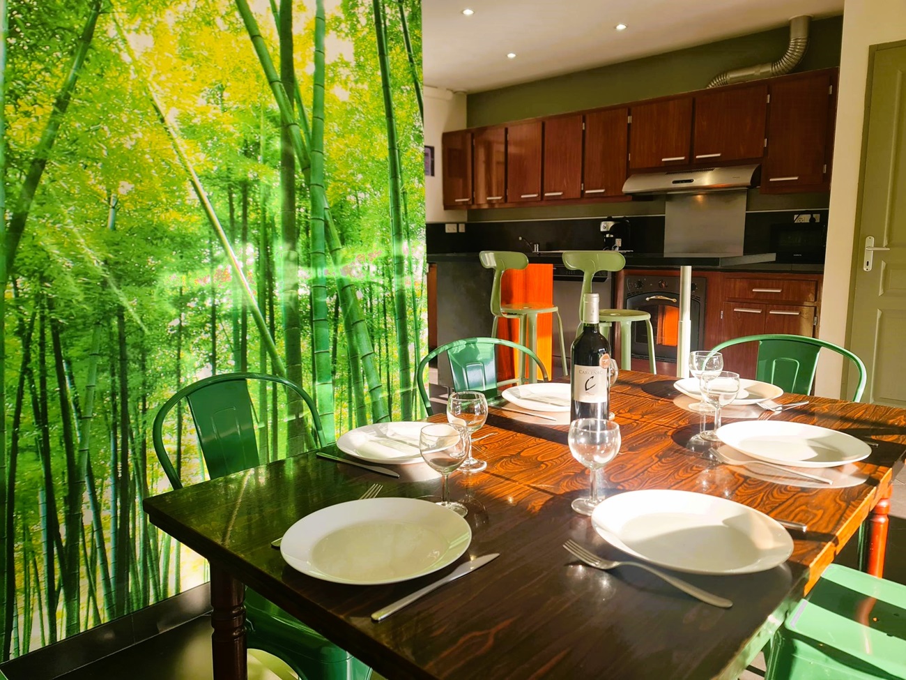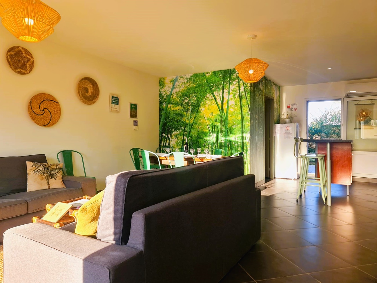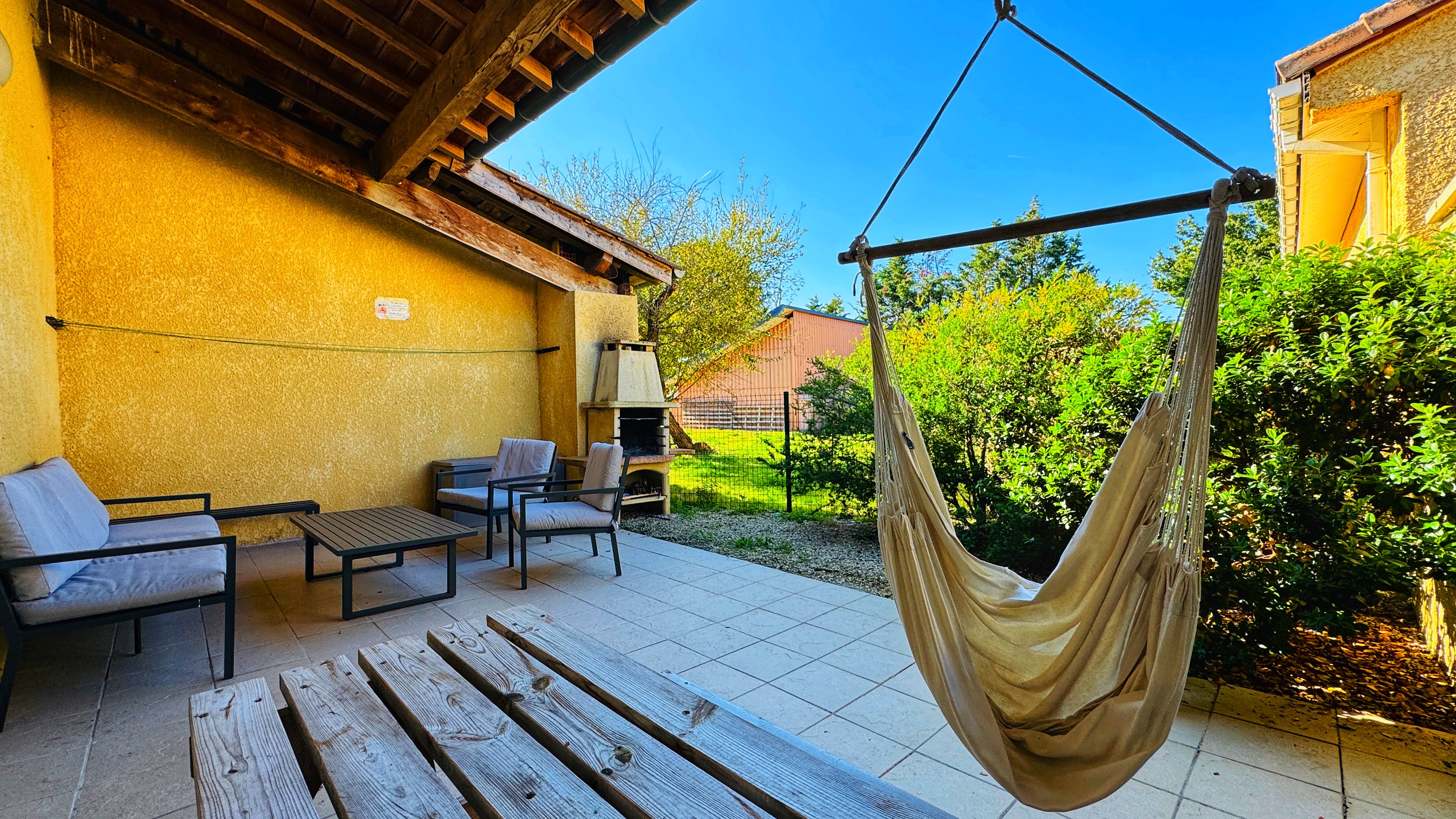 Une spacieuse et jolie cuisine toute équipée vous permettra de préparer vos repas avec tout le confort nécessaire. À côté de l’espace cuisine, la deuxième terrasse semi-couverte vous permet d’apprécier davantage la douceur de la nature grâce à sa vue verdoyante sur le pré. Dans cet espace de quiétude, vous pouvez vous laisser tenter par une lecture, une boisson chaude ou rafraîchissante au cœur d’un hameau de bien-être, accompagné par le chant des tourterelles.