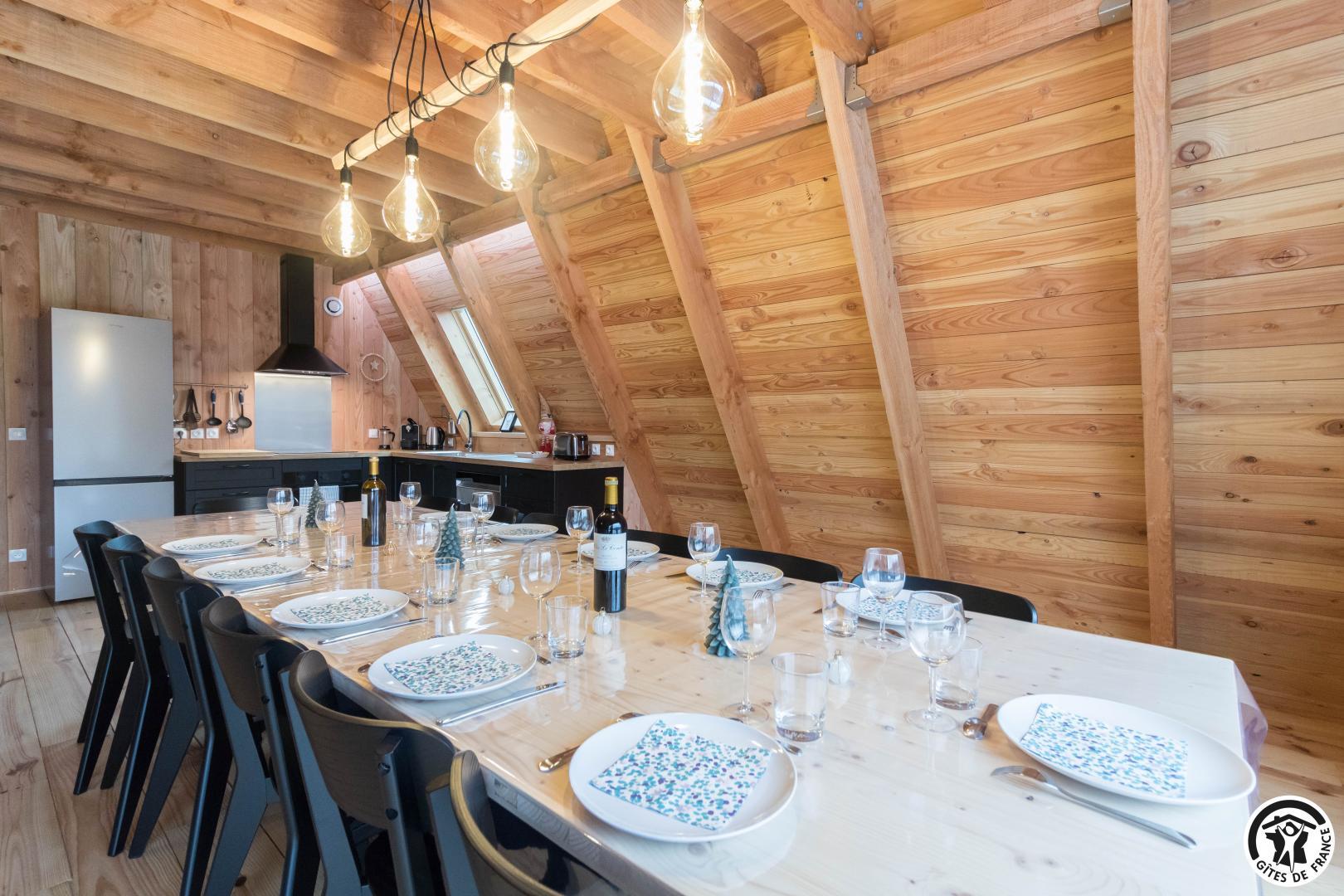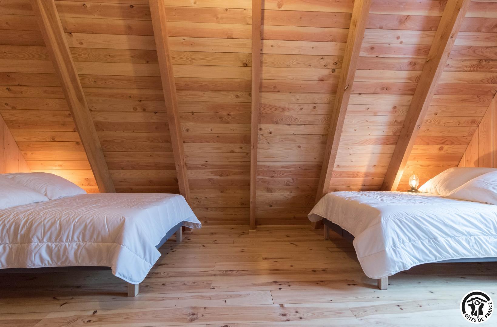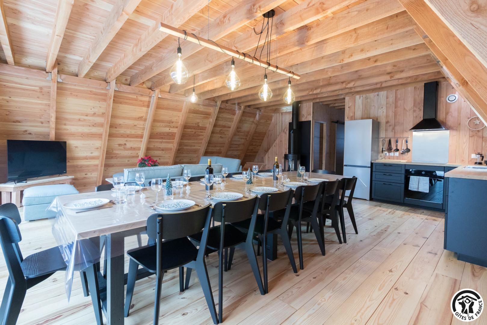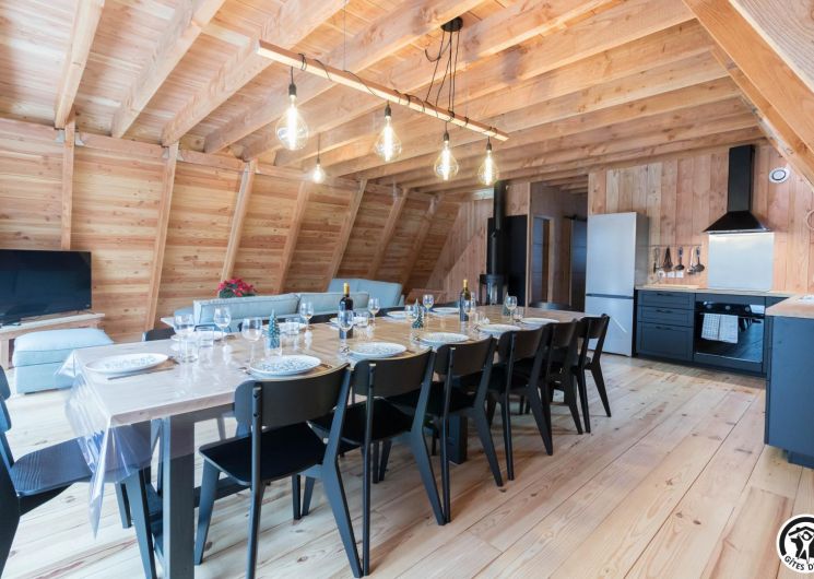 L’agencement a été conçu pour accueillir confortablement jusqu’à 12 personnes. Au rez-de-chaussée, un vaste séjour avec cuisine intégrée, table et 15 chaises et un coin salon, deux chambres accueillantes (1 lit double en 160*200cm chacune, l’une avec un bureau pour télétravailler) permettent une vraie autonomie, complétées par une salle d’eau avec WC. À l’étage, deux autres chambres (1 lit en 160*200cm et 1 lit en 90*200cm)(4 lits en 140*190cm) prolongent l’espace nuit, avec une seconde salle d’eau et WC, garantissant confort et intimité à chacun, que vous soyez en famille, entre amis ou en groupe professionnel.