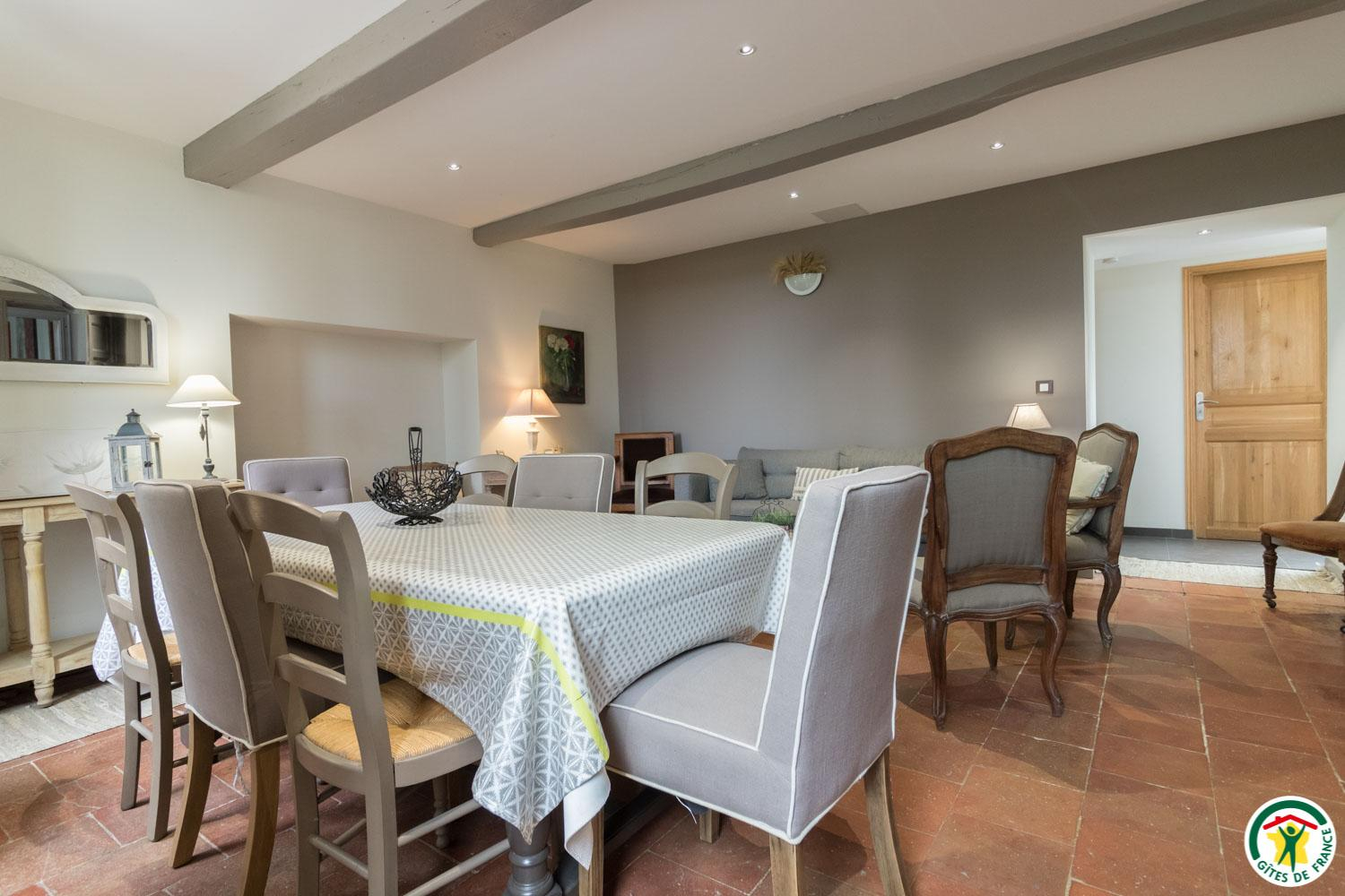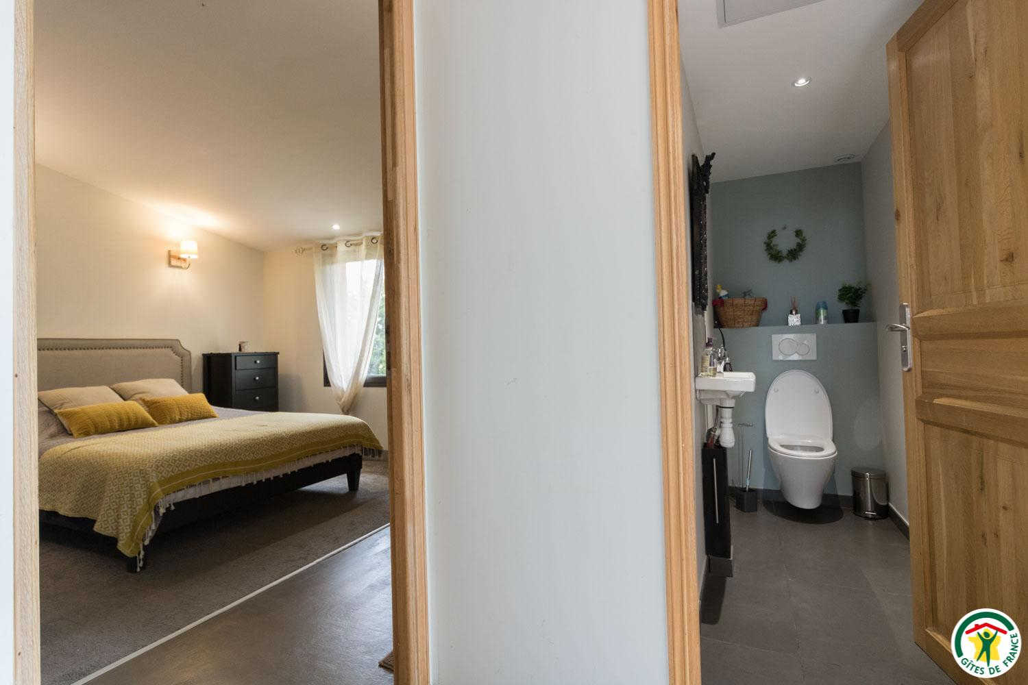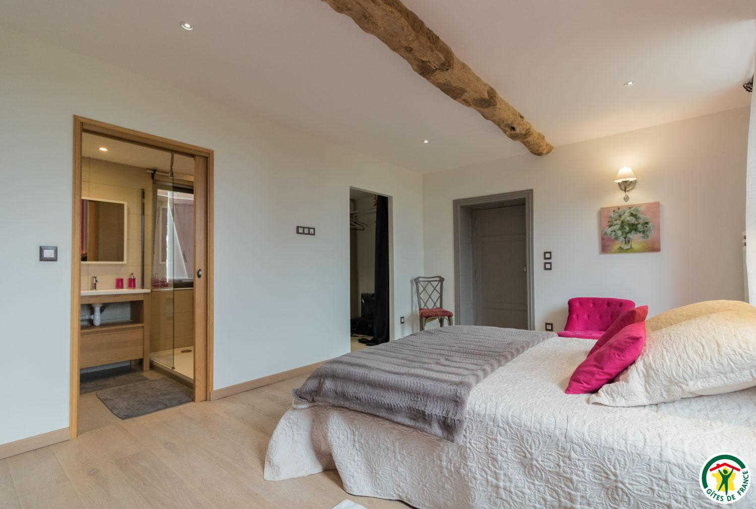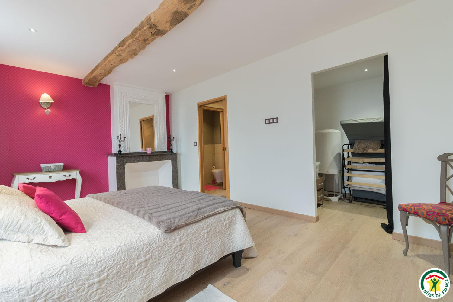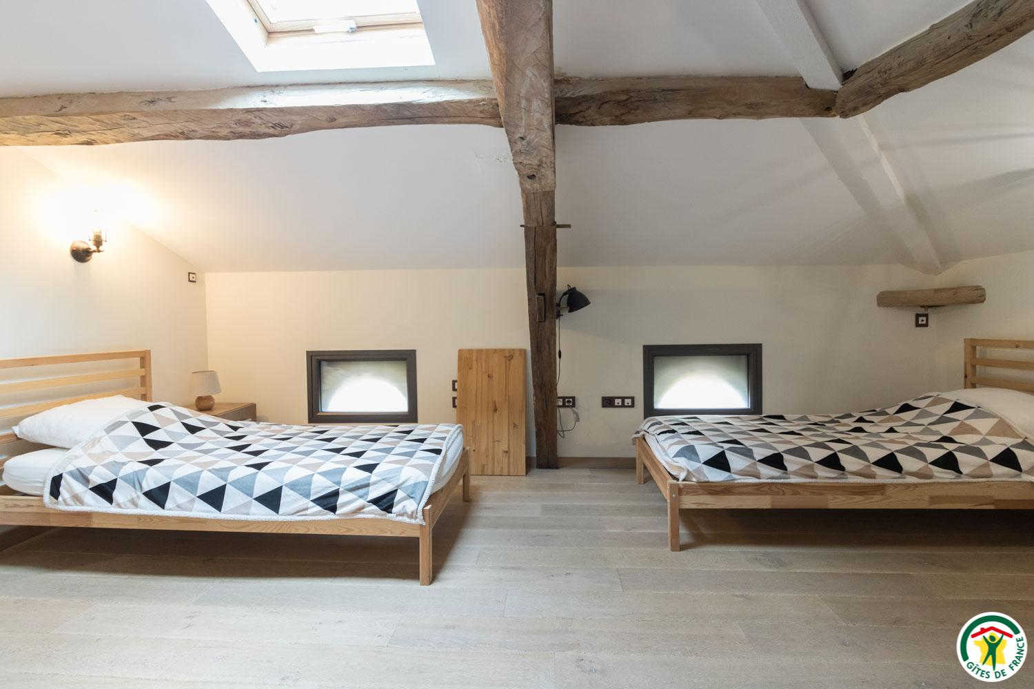 – au deuxième étage sous combles (fermes apparentes) : 2 chambres (1 lit 2 personnes en 160*200cm + 2 lits simple en 90*200cm) (1 lit double en 160*200cm + 1 lit simple en 90*200cm + salle d’eau ouverte), WC indépendant.