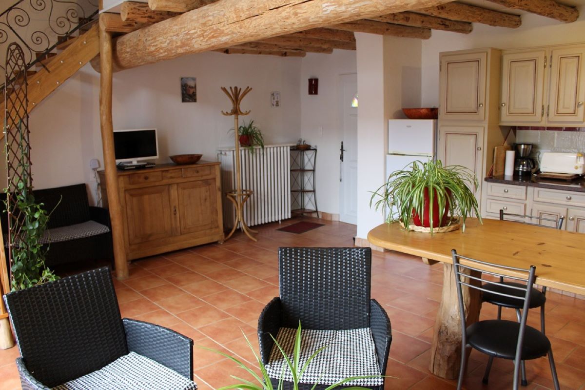 Agréable logis de style simple et campagnard, 50m², 3-4 Personnes (+ un bébé) Pièce principale à vivre de 30m², 1 salle de douche avec WC, petit dressing et balcon au sud de 6m², mezzanine 2 chambres et 2 lits doubles (140 et 120)