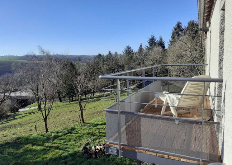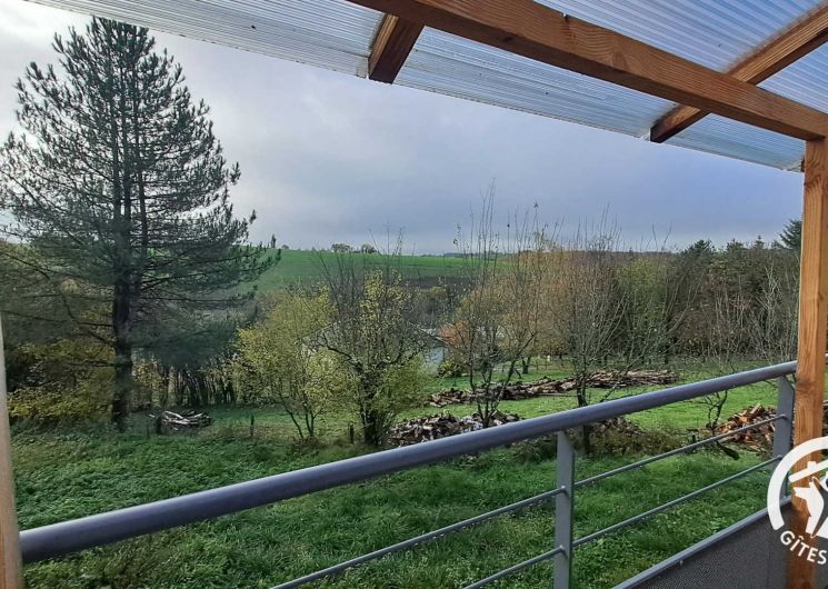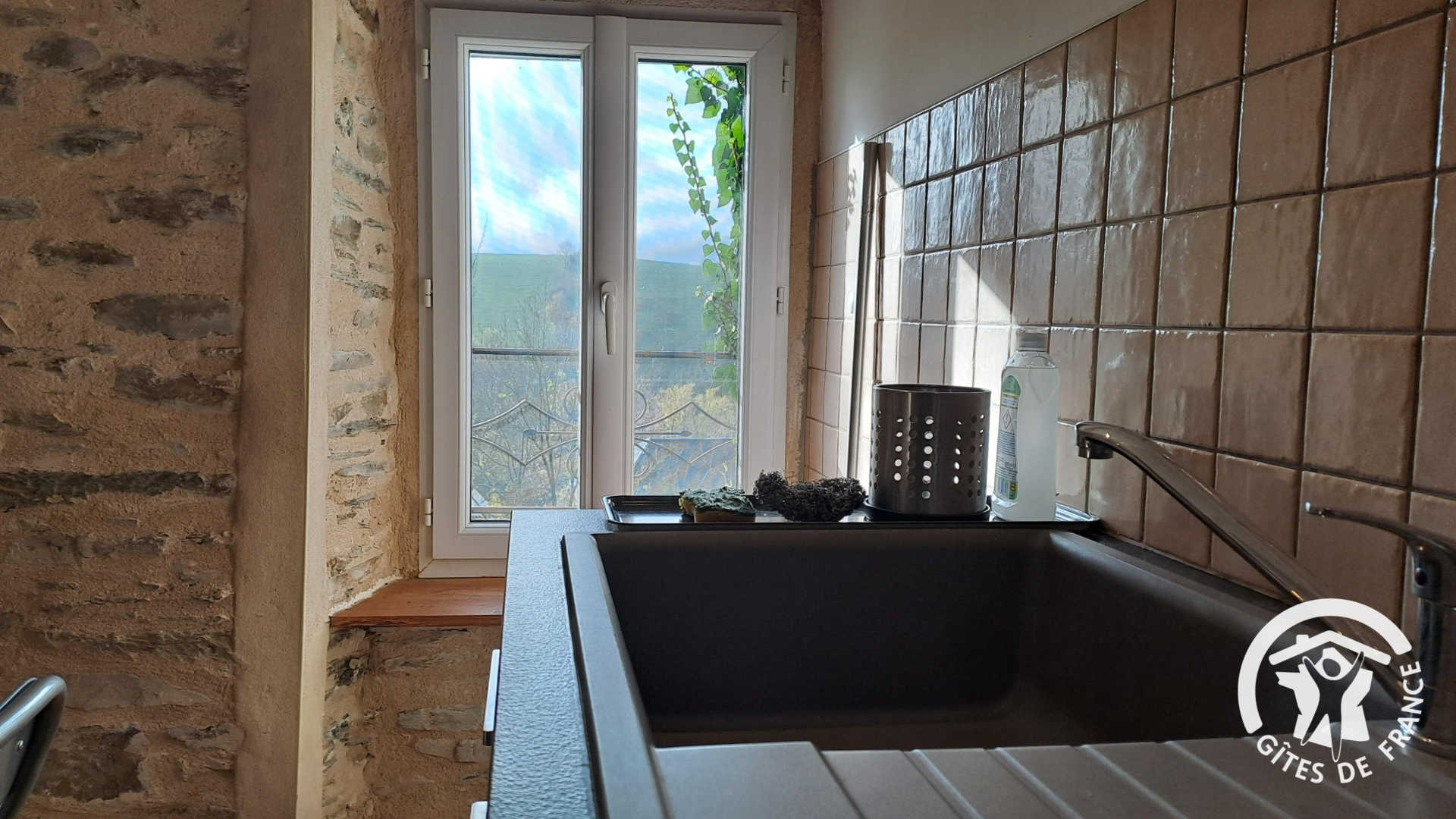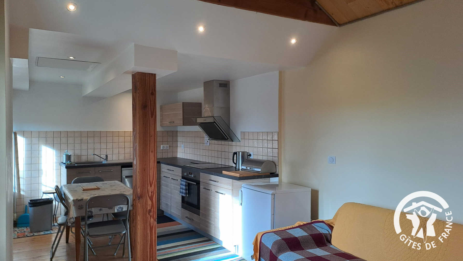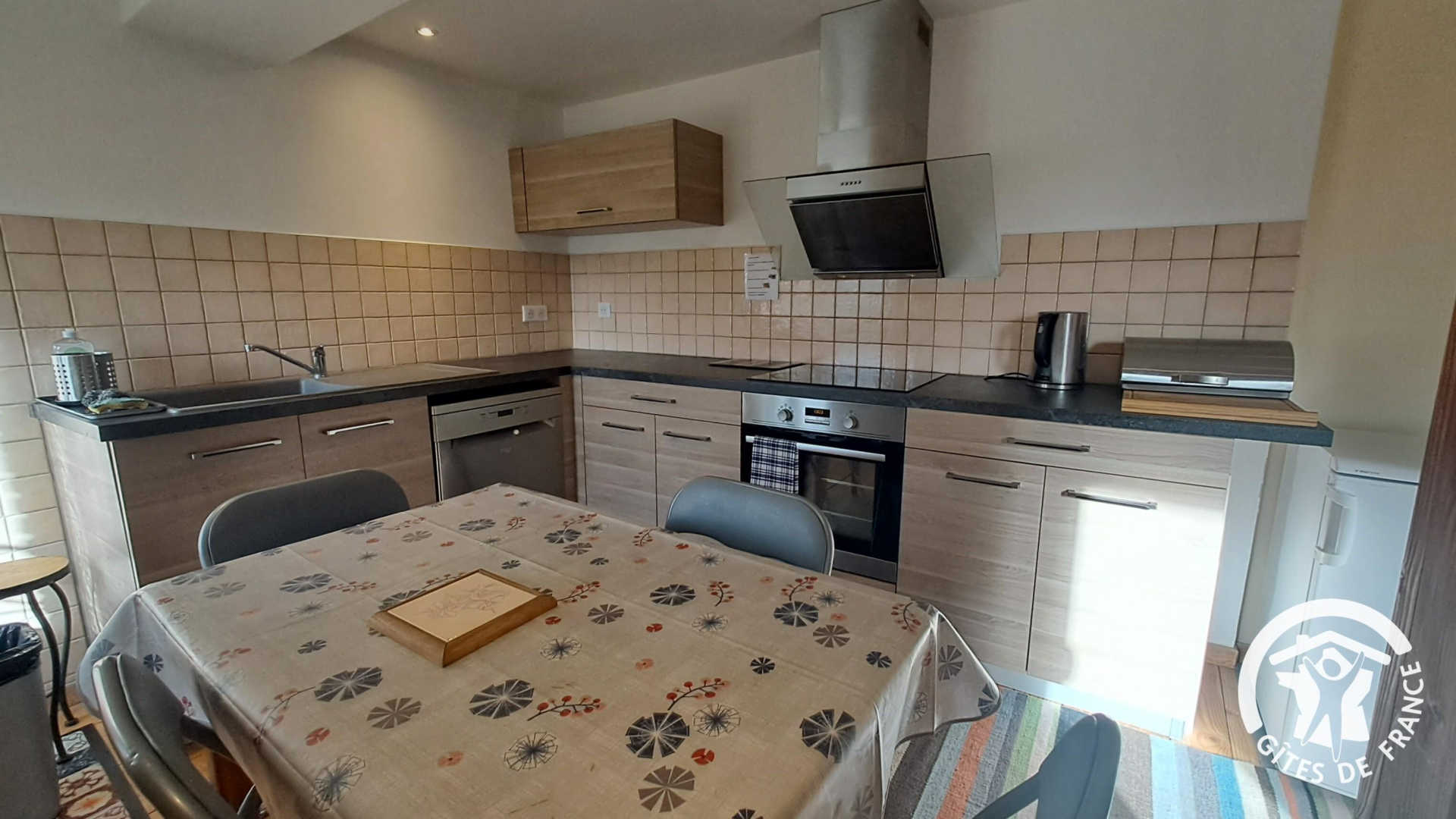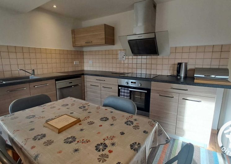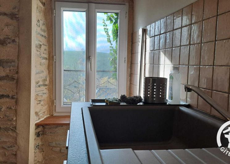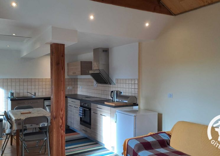 Gîte avec entrée indépendante donnant sur le séjour comprenant une cuisine simple (réfrigérateur top, four, lave-vaisselle, grille-pain, bouilloire et cafetière à piston) ouverte sur la table à manger et l’espace salon. Depuis la pièce de vie principale, vous accédez au balcon couvert avec vue dégagée sur la colline verdoyante pour pleinement profiter du cadre bucolique.