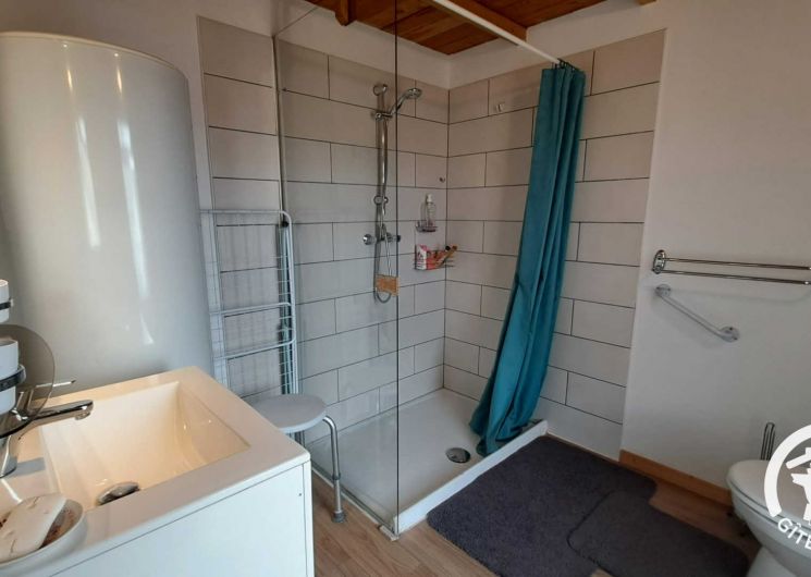 Depuis le séjour, accès à la salle d’eau avec grande douche, vasque et wc. Deuxième accès au balcon depuis la salle d’eau avec porte vitrée.