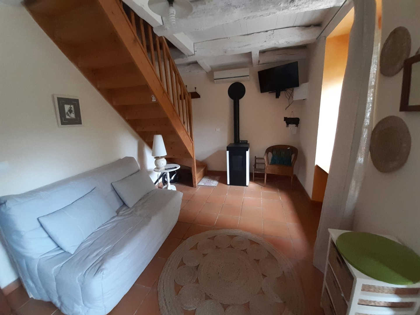 Gîte indépendant, aménagé dans une aile de la ferme, à proximité de l’habitation des propriétaires. Rez-de-chaussée : séjour/coin cuisine. A l’étage : deux chambres (un lit double 140x190cm, un lit simple 90x190cm), salle d’eau avec wc. Climatisation réversible. Draps et linge de maison sont fournis, les lits sont faits à votre arrivée.
