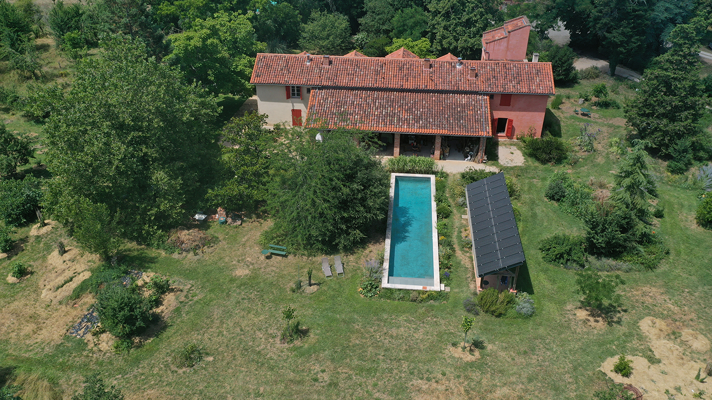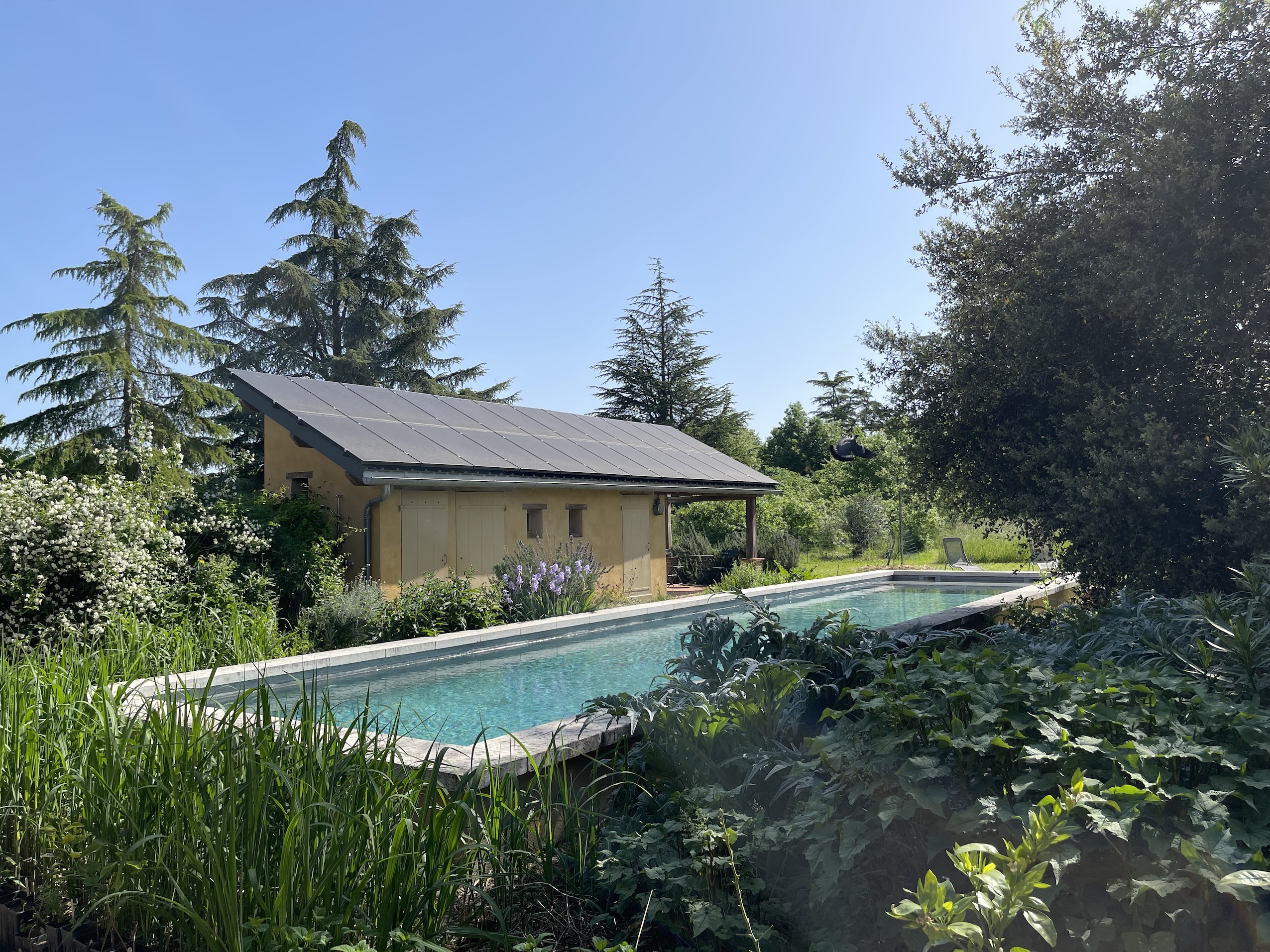 La piscine extérieure de 16m de long, dont 1m de pataugeoire, s’installe dans un environnement très naturel et peut être chauffée en juin et septembre. Un volet roulant en assure la sécurité. Le toit du local technique avoisinant est recouvert de panneaux photovoltaïque qui fournissent l’énergie nécessaire à l’entretien de la piscine. Elle a été automatisée dans sa conception ce qui évite la présence de robot nettoyeur dans l’eau.