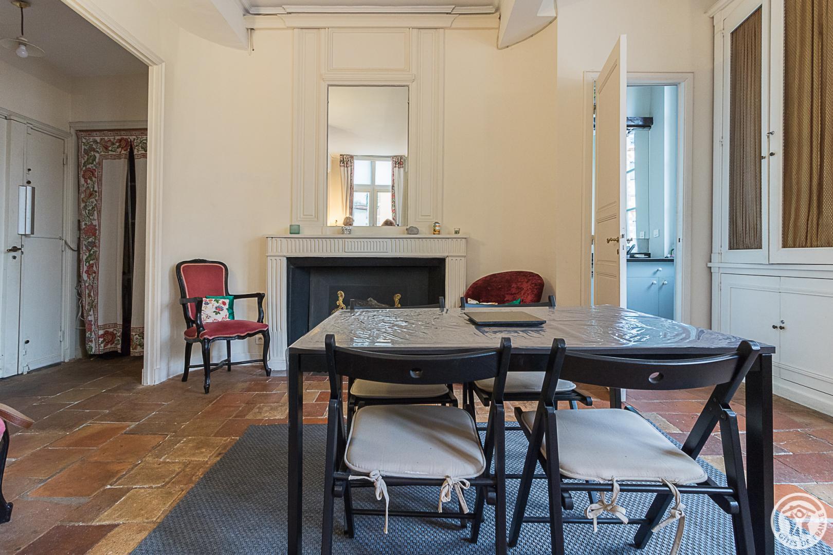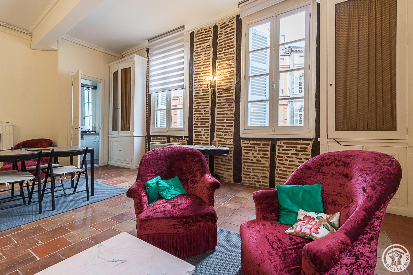Aménagé au 1er étage d’une maison datée du XVIème siècle, au-dessus du restaurant L’Occitalie, il bénéficie grâce à ses grandes fenêtres d’une belle luminosité et du charme indéniable de la brique qui a donné son nom à la Ville Rose ! A proximité de la ligne B du métro (stations Carmes ou François Verdier à 500m) et des parkings surveillés de Saint-Etienne (300m), Carmes (500m) ou Esquirol (600m), il invite à poser sa voiture pour profiter à pied de l’animation du coeur de ville. Ruelles moyenâgeuses, petits restaurants et boutiques, musées, c’est en flânant que vous découvrirez Toulouse sous son aspect le plus authentique !