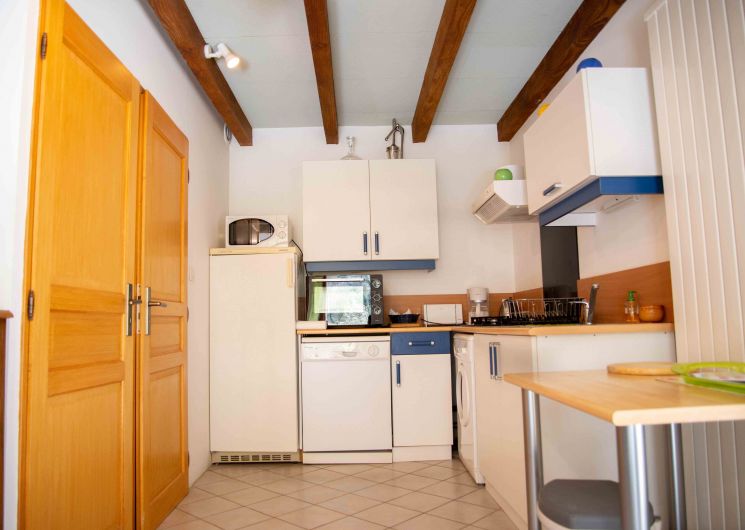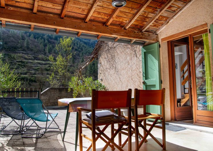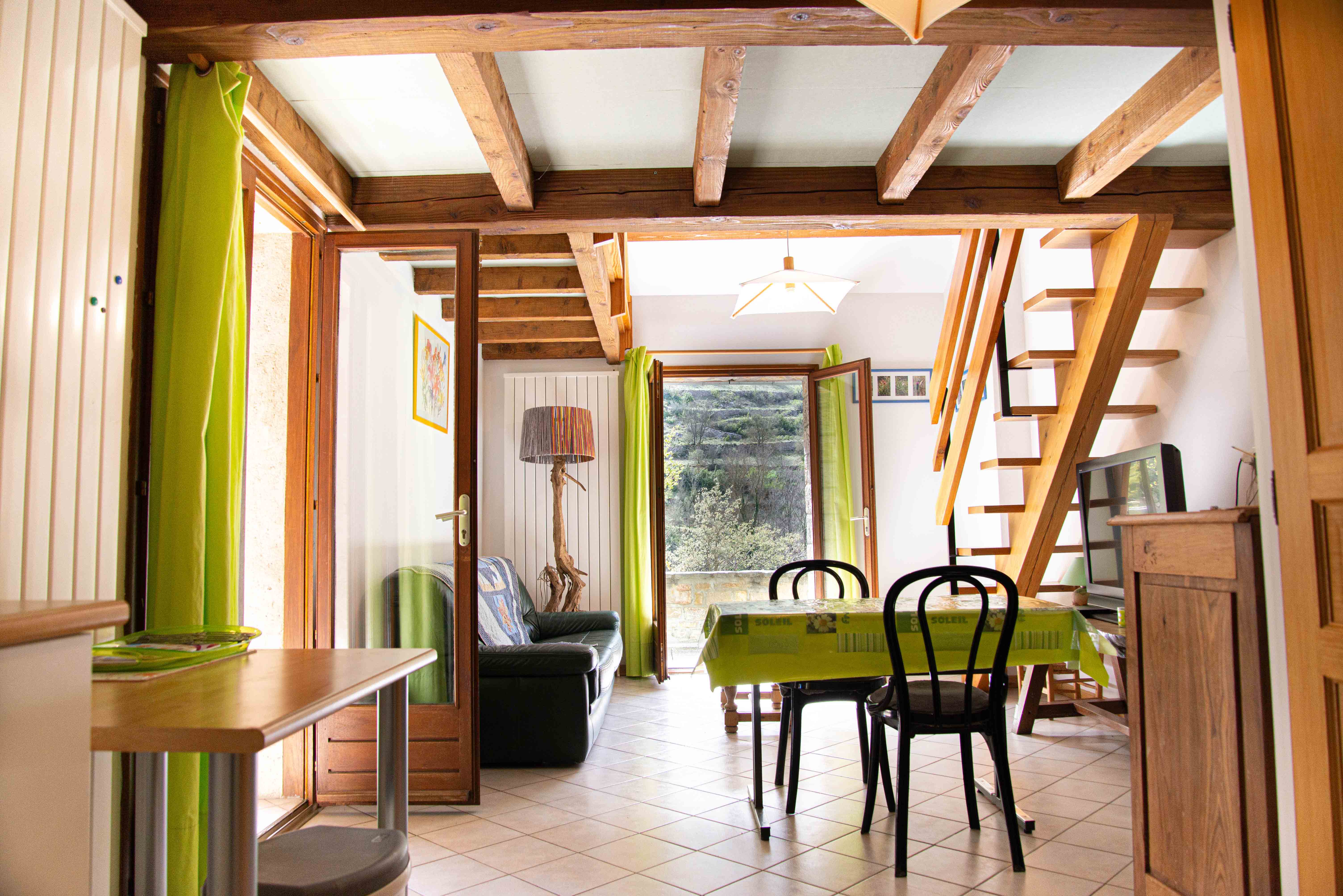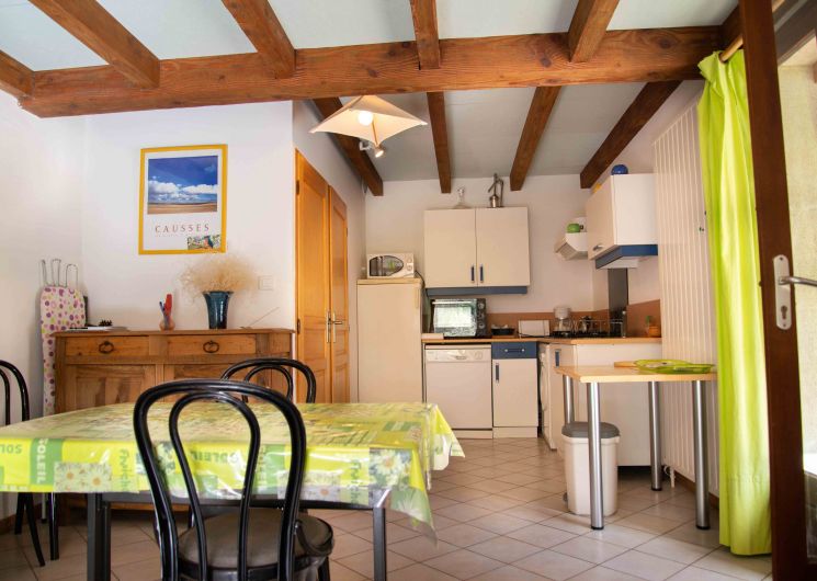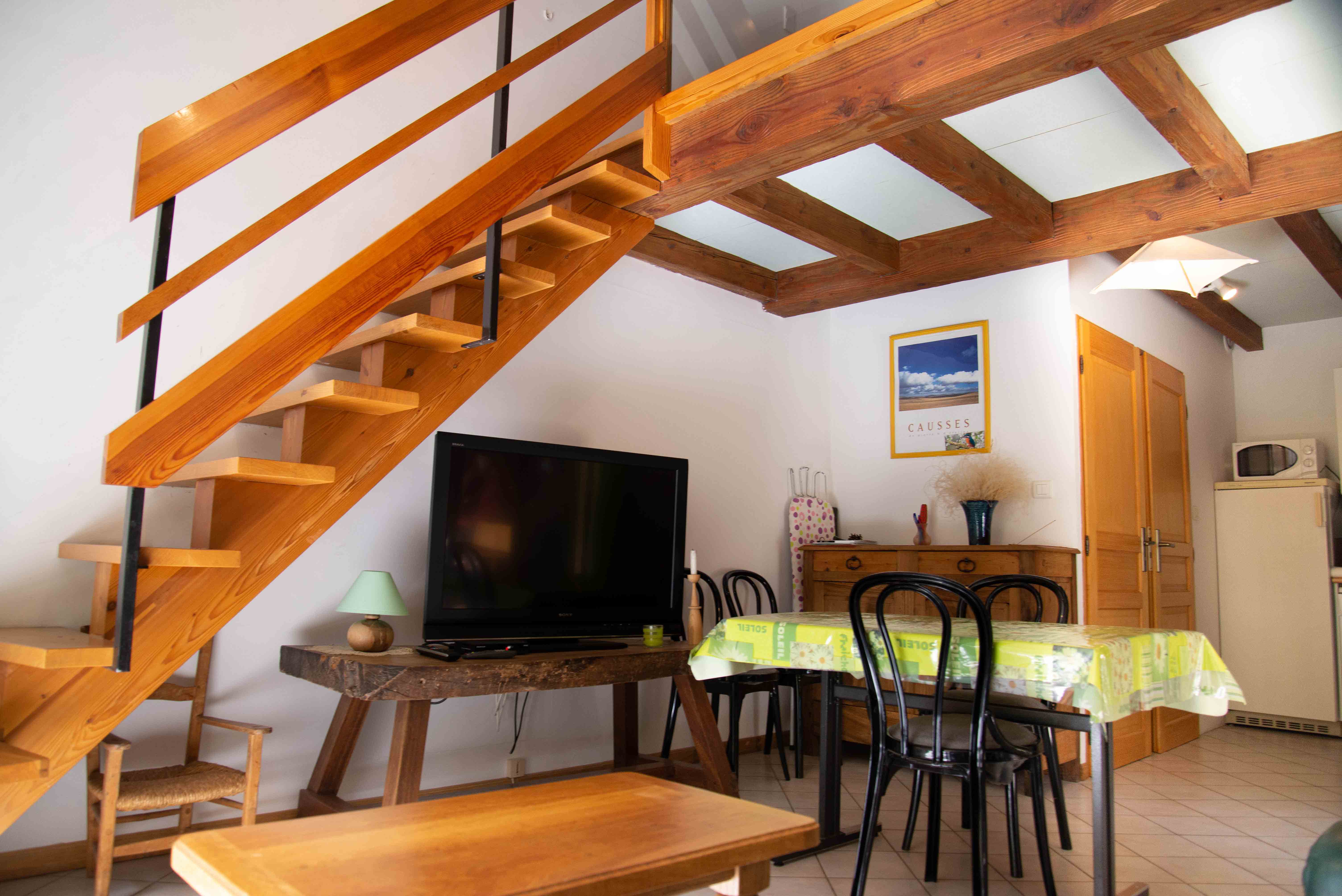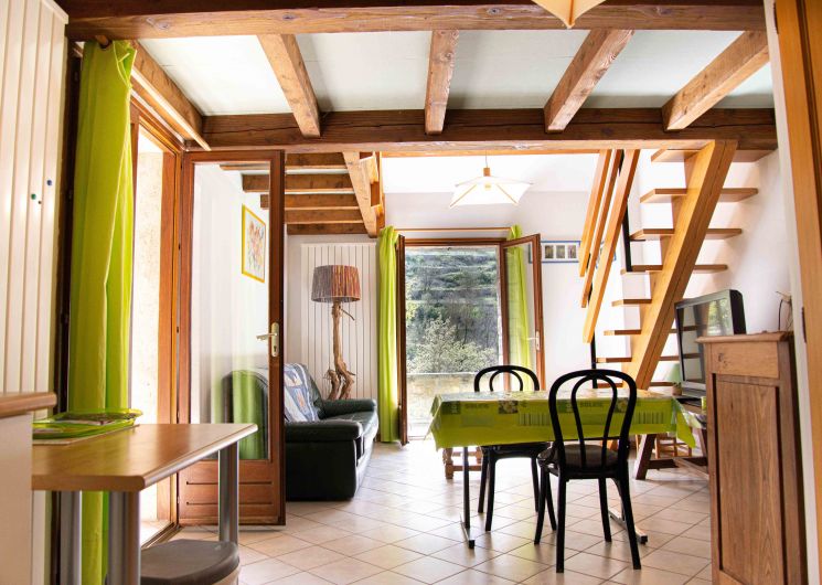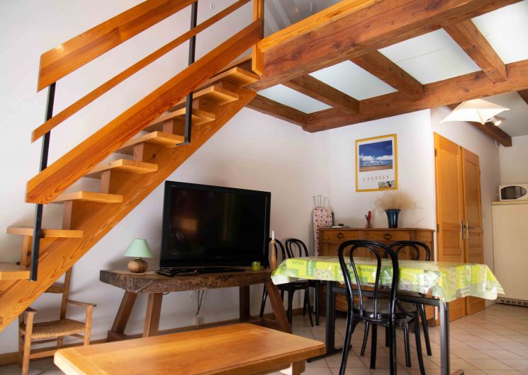 Gîte Martin-Pêcheur. Location mitoyenne au 1er étage (duplex), d’une maison récente située à 500m de Sainte-Enimie. En entrant depuis une terrasse, séjour/cuisine de 30 m2, canapé cuir. Salle d’eau (douche et lavabo) et WC indépendant. A l’étage, mezzanine 8m2 (1 lit 1 place), une chambre de 12m2 ( lit de 2 places) Terrasse couverte et ouverte, 20 m2