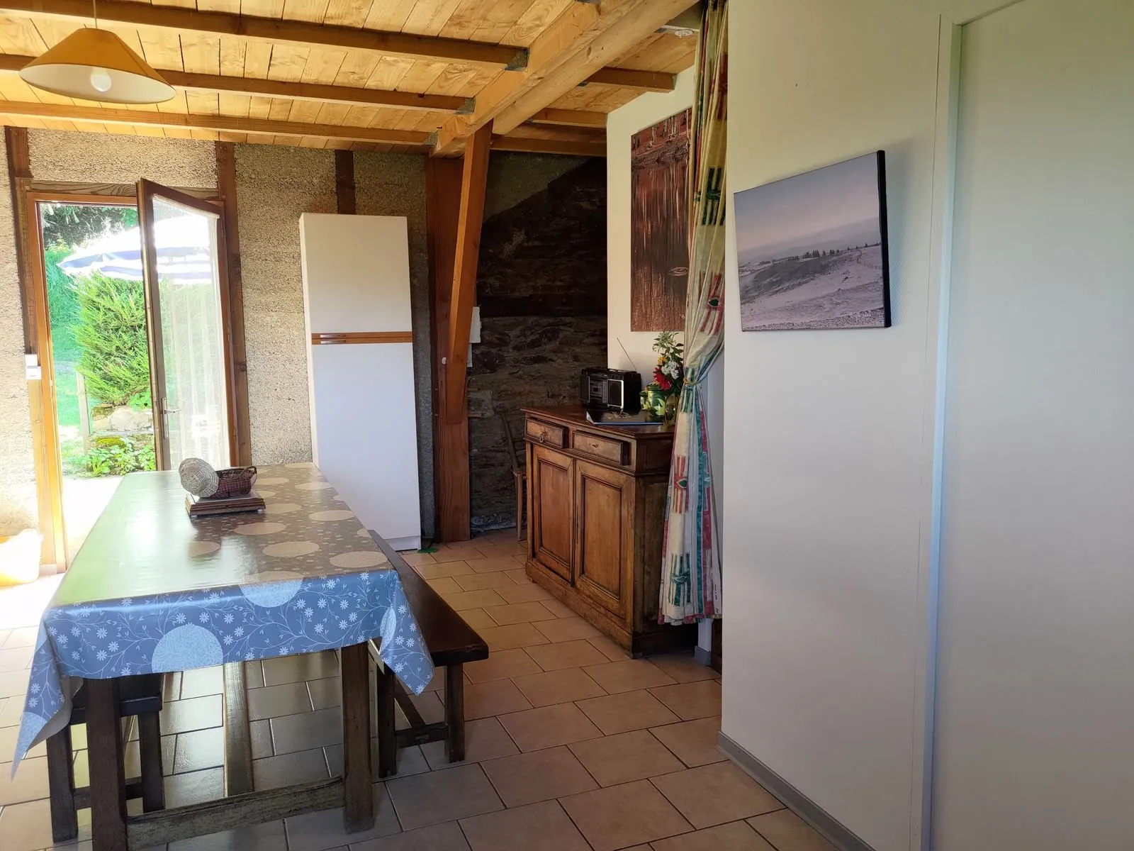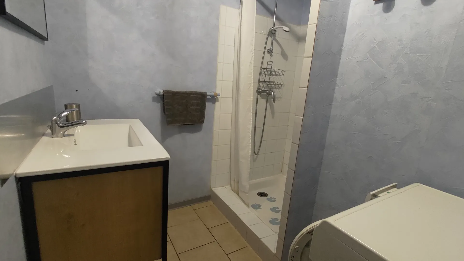 2 chambres (1 lit en 140, 2 lits en 90), salle d’eau (lave-linge), séjour (canapé) avec coin cuisine, chauffage complet électrique. Terrasse privée non close (15 m²), salon de jardin. Location de draps.