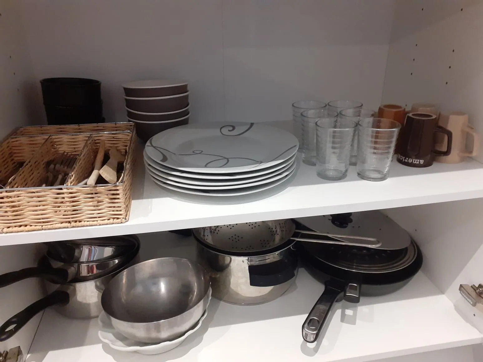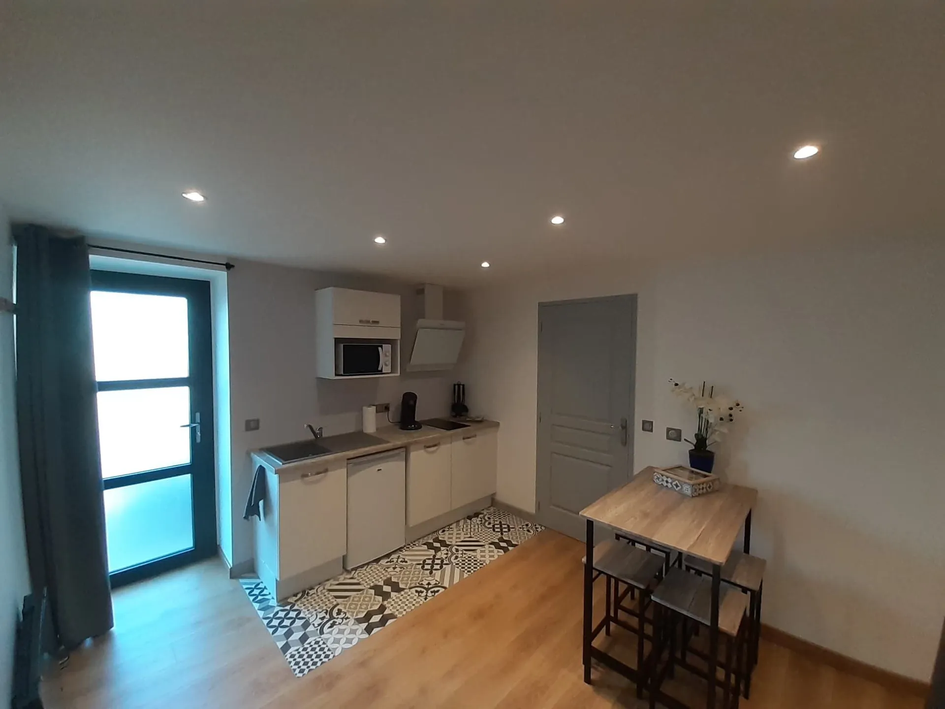 1 coin cuisine équipée : micro-onde/grill, frigo-congélateur, plaque induction/hotte, cafetière Senseo, bouilloire, toaster, 1 table et 4 tabourets