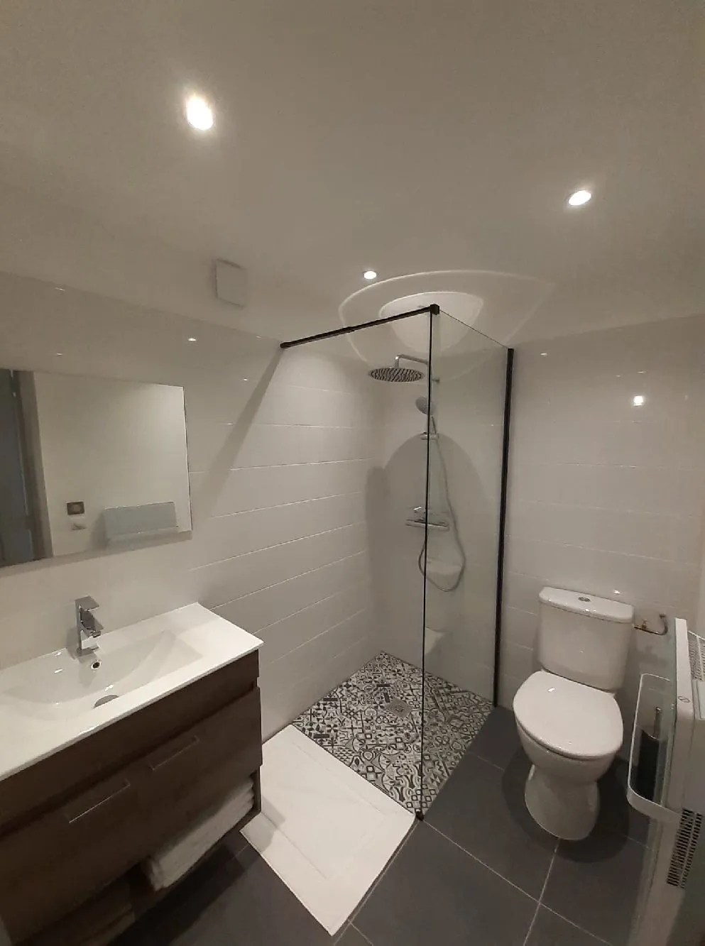 1 salle d’eau avec douche à l’italienne, wc, meuble vasque et rangements, sèche-cheveux