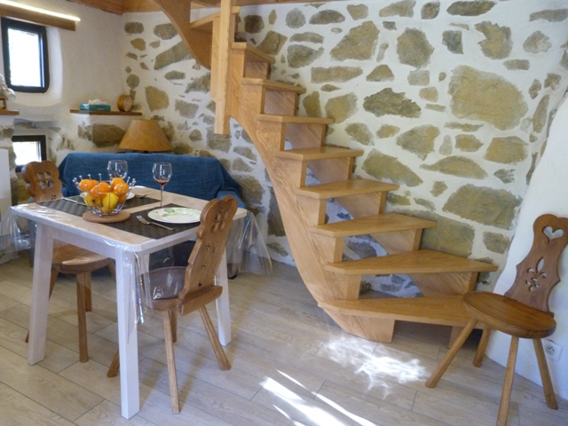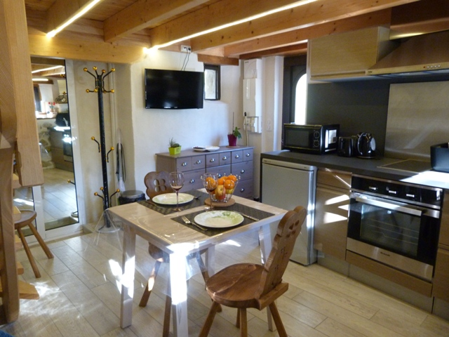 Maison de 25 m² comprenant : Une cuisine ouverte sur séjour, un coin chambre sous pente (1 lit en 140), une salle d’eau (douche) avec WC. La location bénéficie d’un local à skis/vélos et d’une terrasse pour profiter d’un bel environnement de montagne verdoyant et non clos pour cet ancien moulin assis le long d’un petit ruisseau.