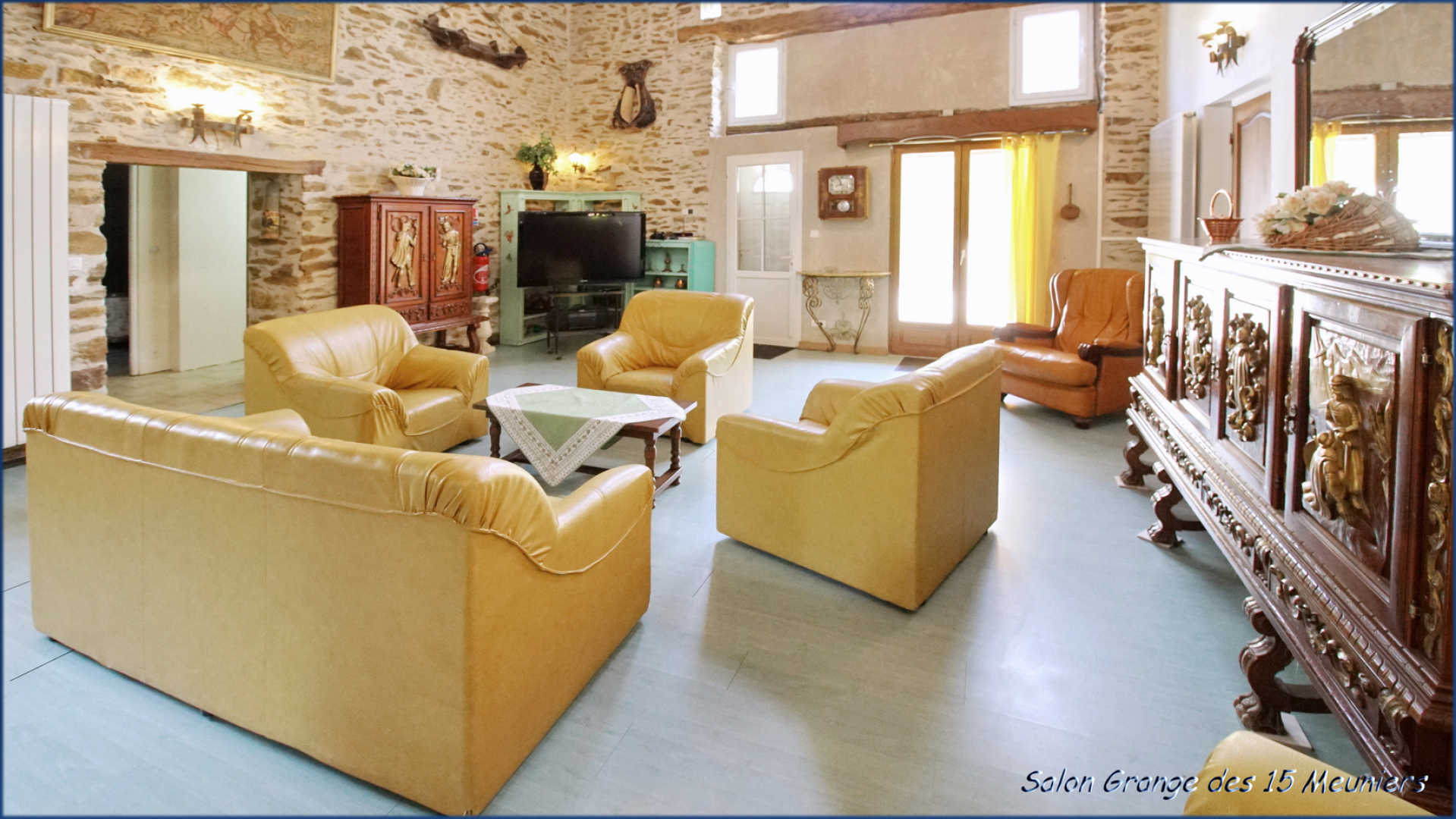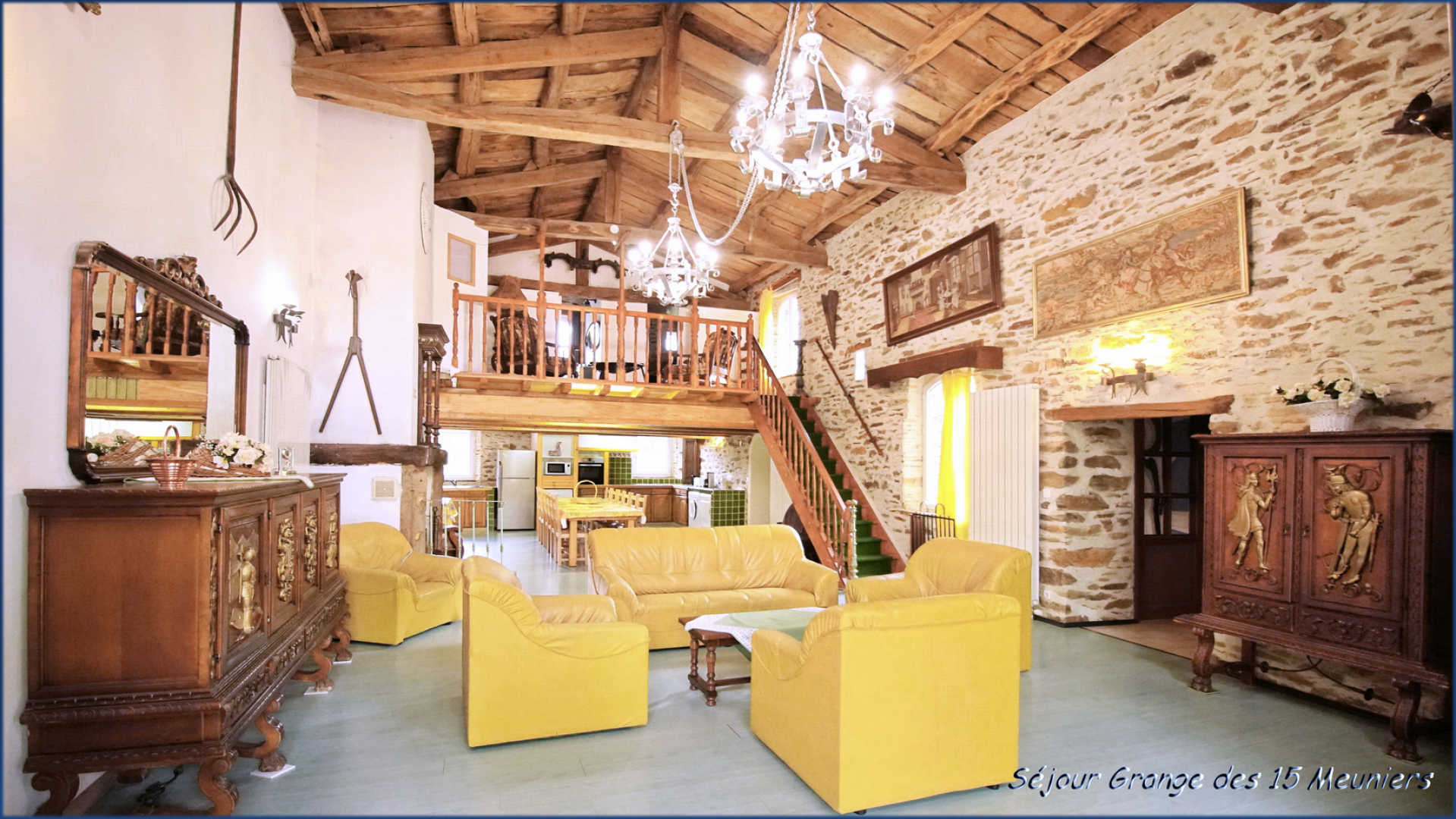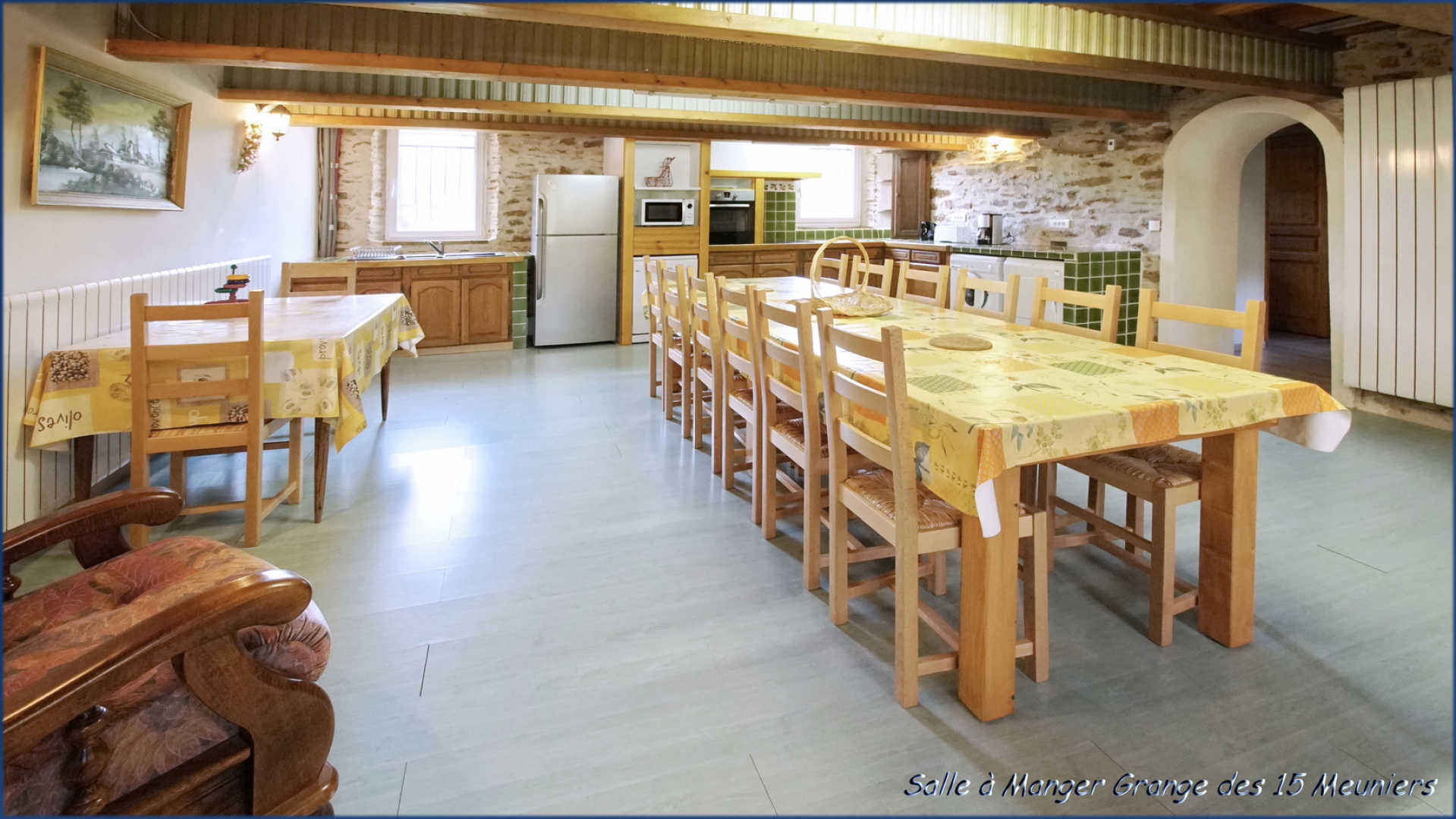 • Gîte des 15 Meuniers : grande pièce à vivre avec cuisine ouverte équipée (four, micro-ondes, lave-vaisselle, réfrigérateur-congélateur, plaque vitrocéramique, cafetière filtre), espace repas et salon avec cheminée et télévision.