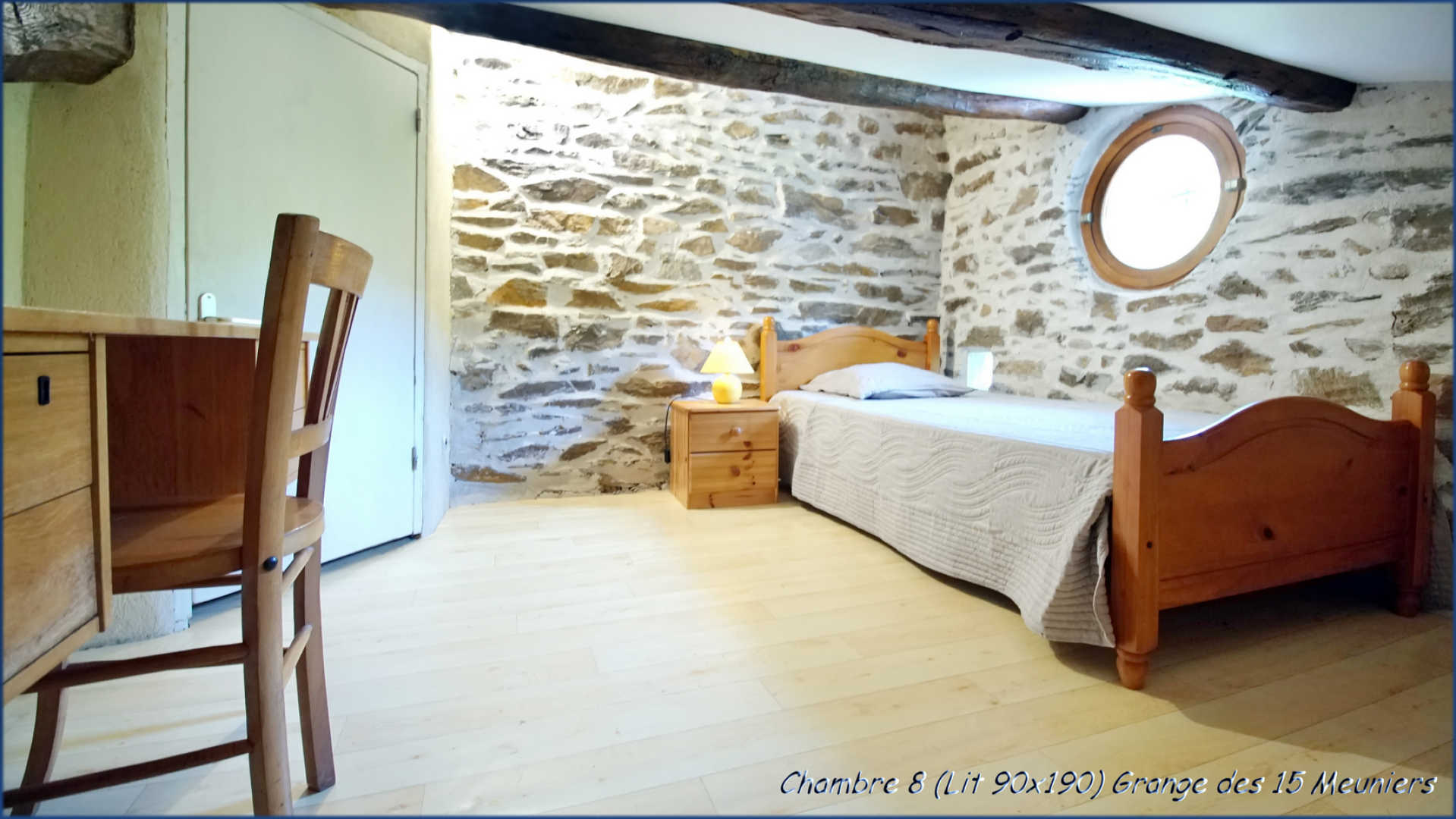 • Gîte des 8 Meuniers : pièce à vivre de 40 m² avec cuisine ouverte (four, micro-ondes, lave-vaisselle, réfrigérateur-congélateur, plaque gaz, cafetière filtre), espace repas et salon avec cheminée et télévision.