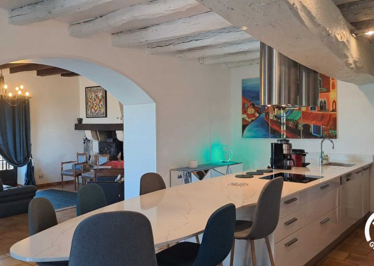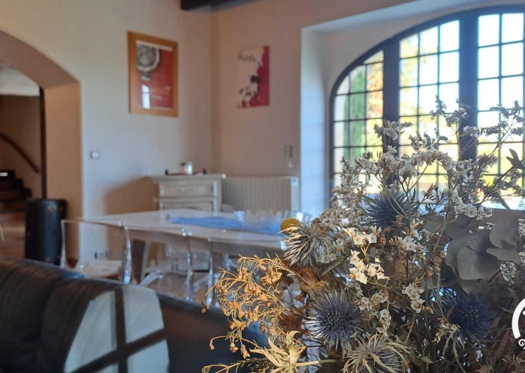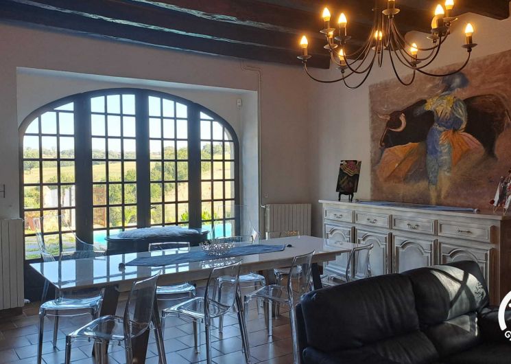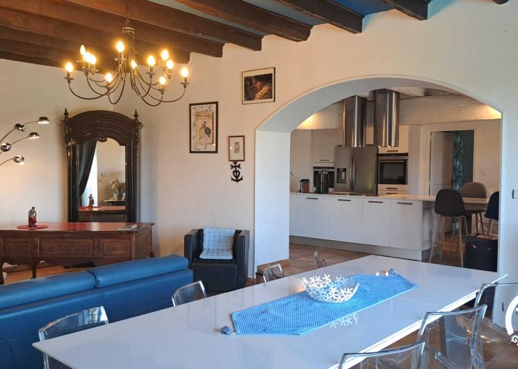 Belle maison de vacances, de plein pied, grand espace de vie lumineux avec cuisine dînatoire, salon / salle à manger donnant sur la terrasse et la piscine à débordement. Belle chambre parentale, dressing et buanderie.