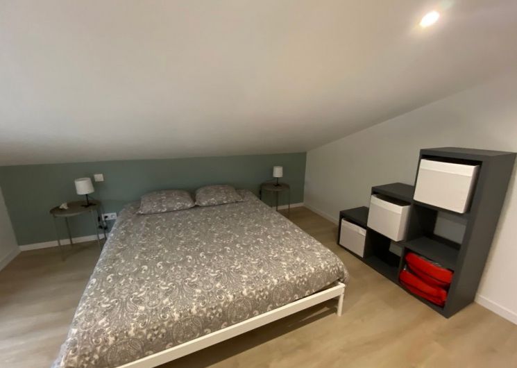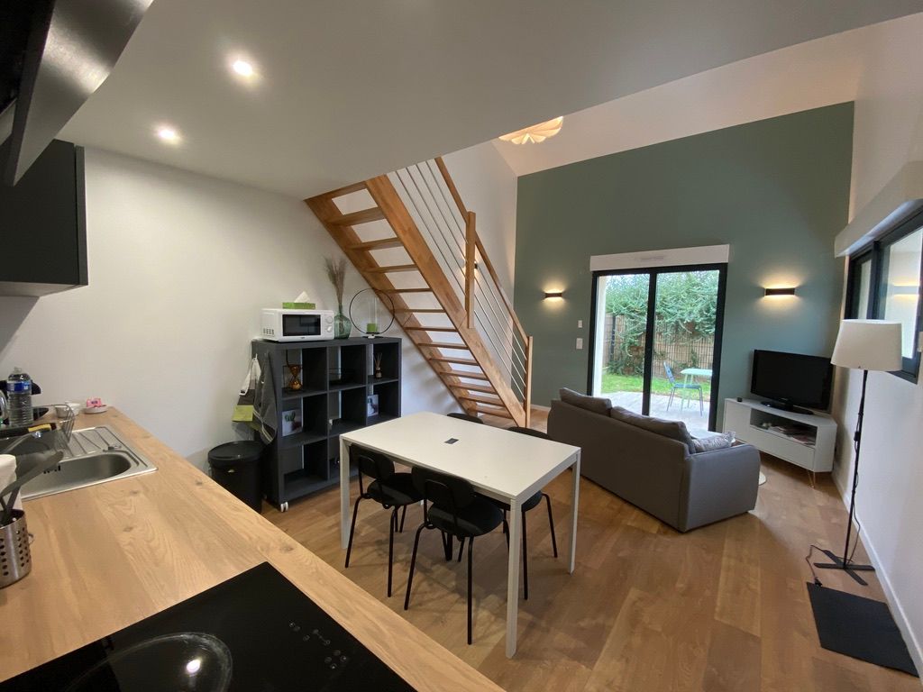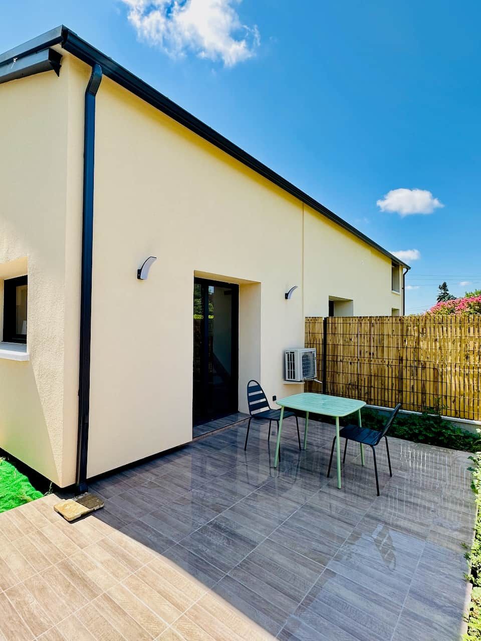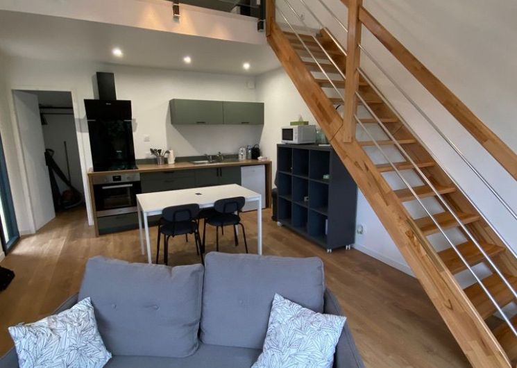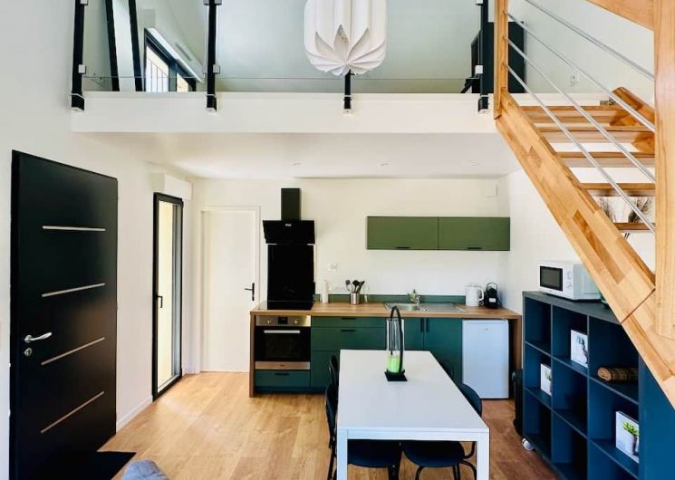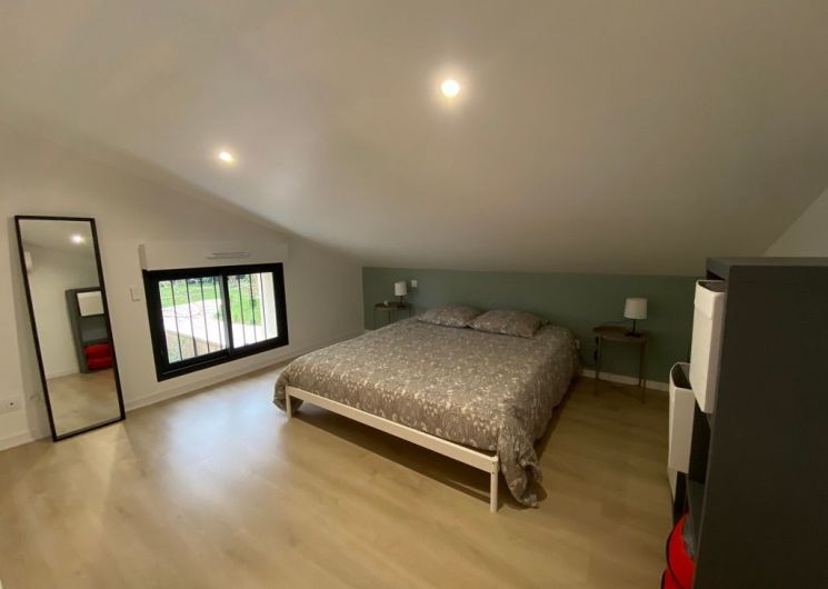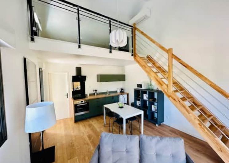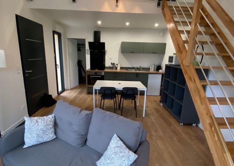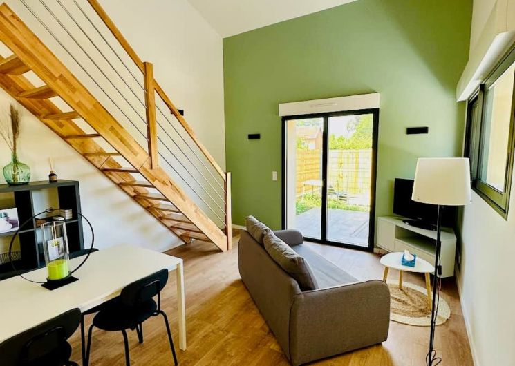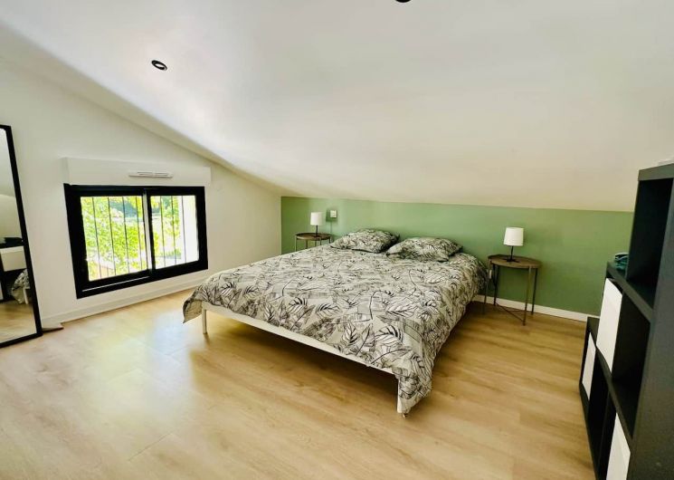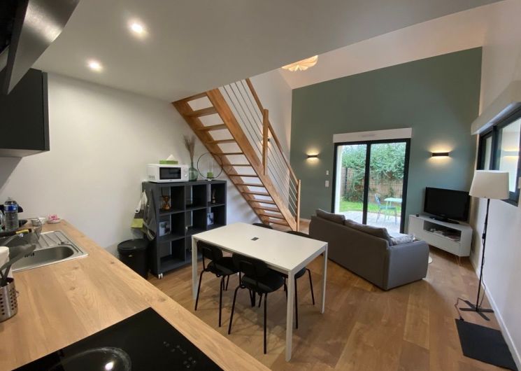 Après la terrasse clôturée où se trouve le salon de jardin, découvrez le rez-de-chaussée aux douces tonalité de vert tendre, avec la présence de bois pour une ambiance chaleureuse et reposante. La pièce à vivre comprend un espace salon avec un canapé, TV, puis l’espace repas (table avec chaises) et les éléments de cuisine de type intégrés (équipements complets four, micro-ondes, réfrigérateur avec conservateur, plaques, hotte). Un cellier avec le lave-linge puis une salle d’eau avec wc. A l’étage en mezzanine non fermée donnant sur le séjour, une chambre très mansardée (1 lit 160). Linge de lit, de toilette et de maison fourni compris dans le prix. Wifi dans tout le logement. Netflix compris. Parking privatif sur place. Entièrement climatisé. Terrasse privée de 20 m2 avec salon de jardin.