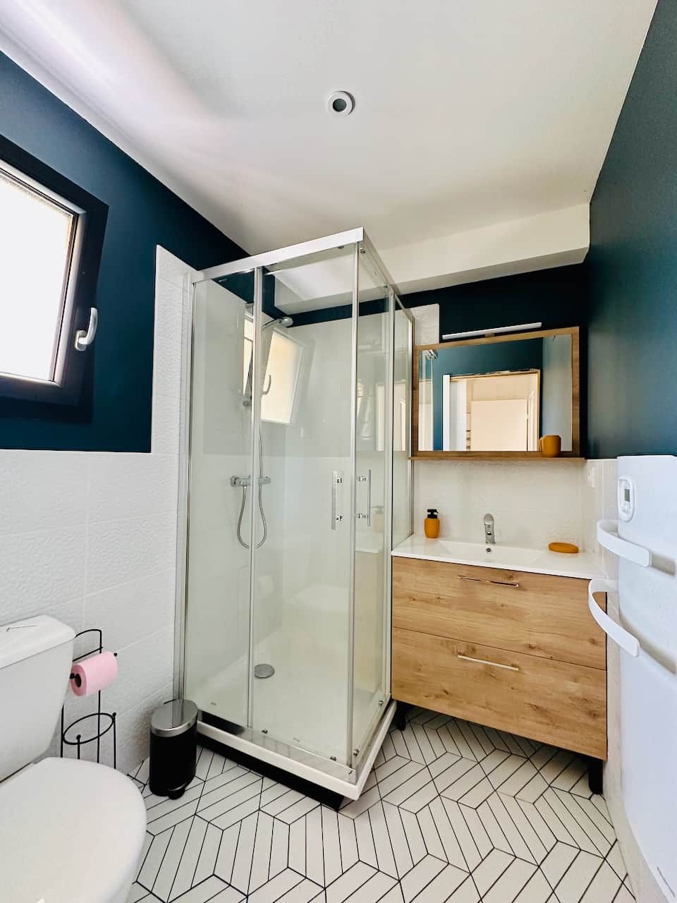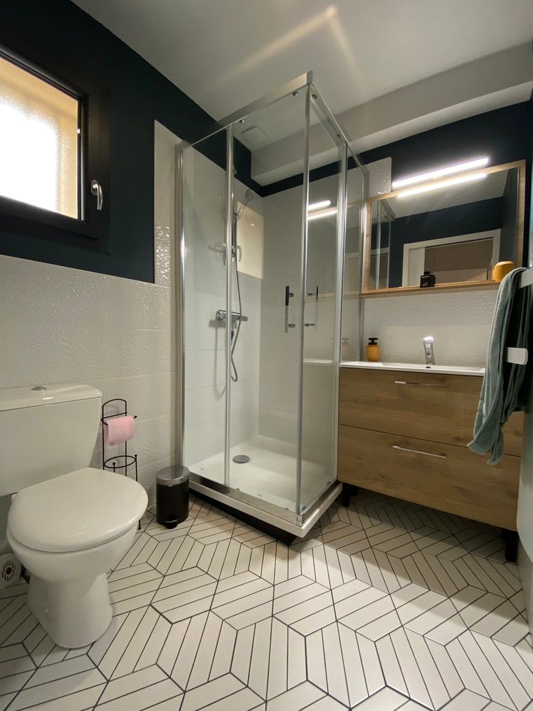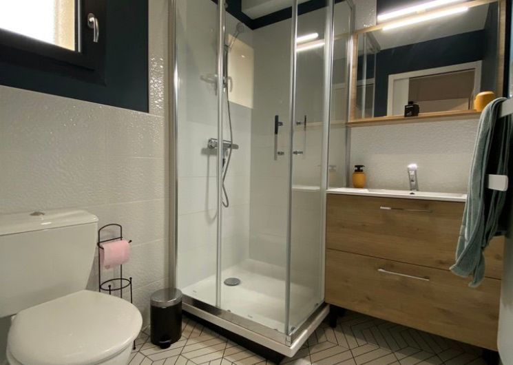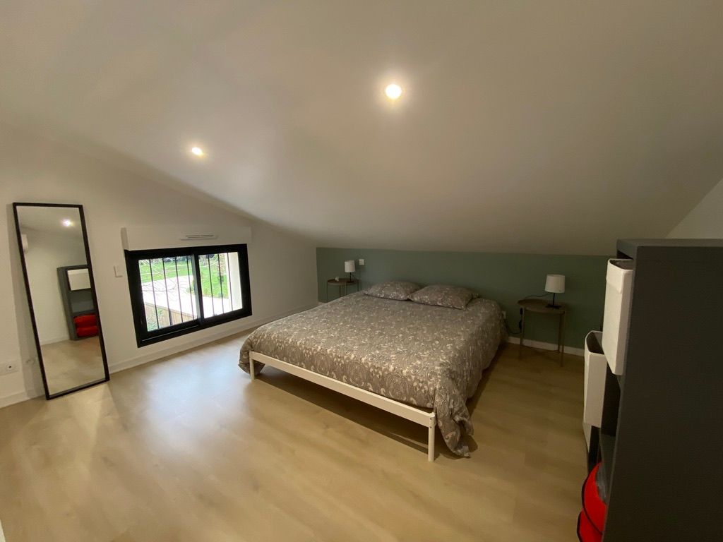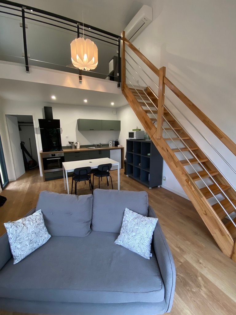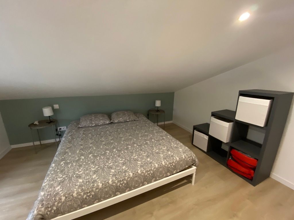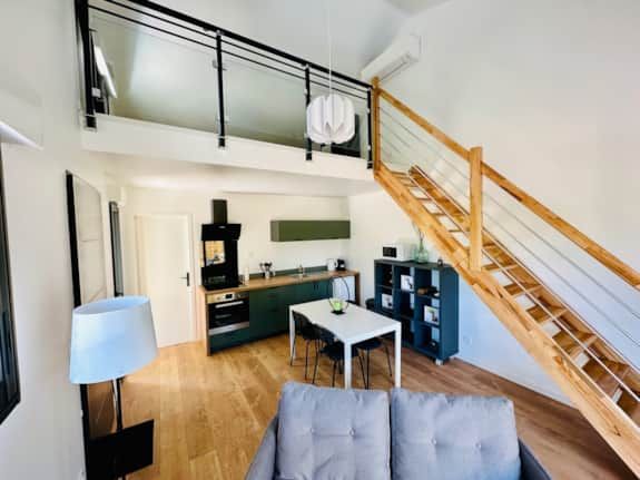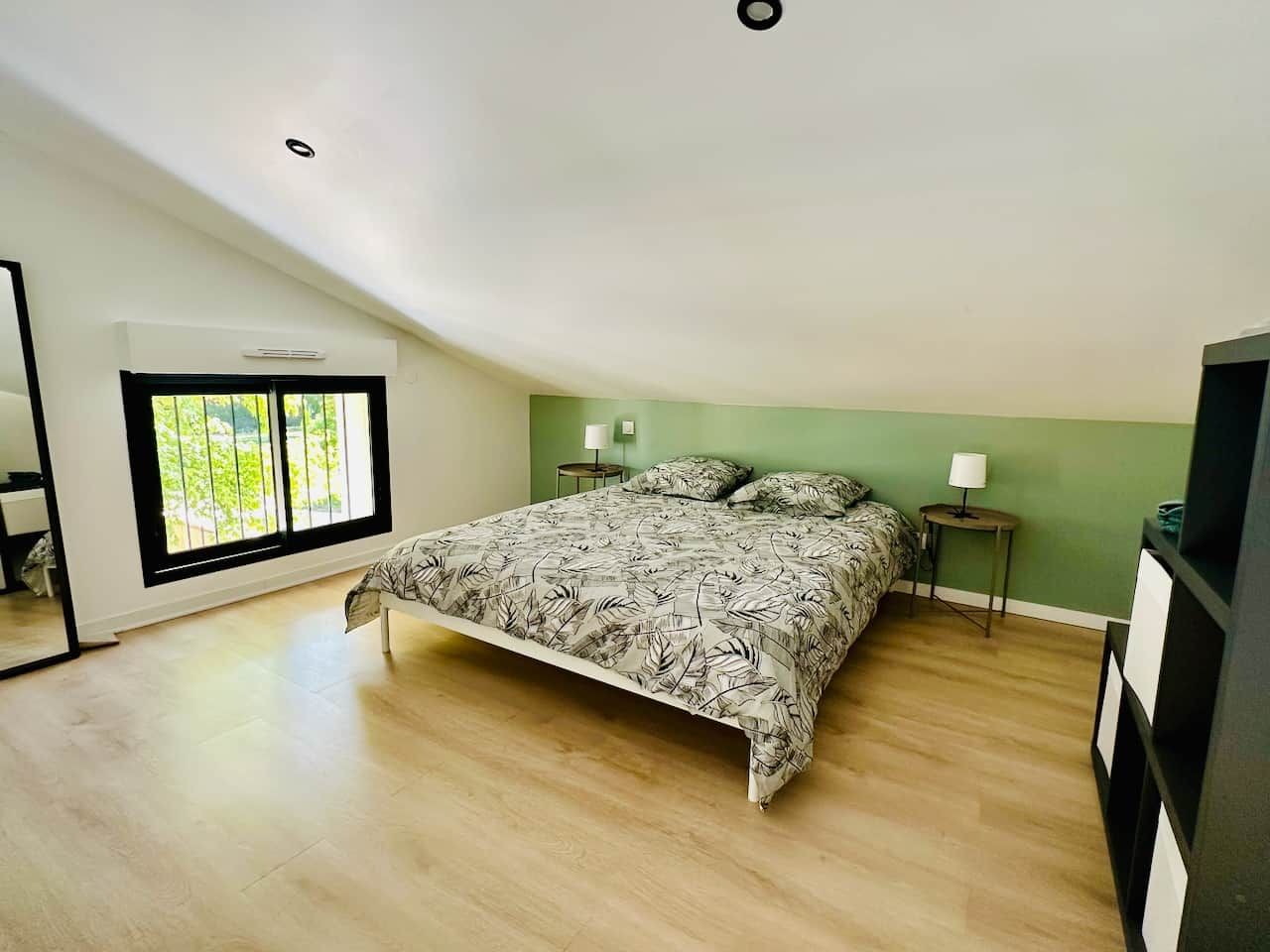 Après la terrasse clôturée où se trouve le salon de jardin, découvrez le rez-de-chaussée aux douces tonalité de vert tendre, avec la présence de bois pour une ambiance chaleureuse et reposante. La pièce à vivre comprend un espace salon avec un canapé, TV, puis l’espace repas (table avec chaises) et les éléments de cuisine de type intégrés (équipements complets four, micro-ondes, réfrigérateur avec conservateur, plaques, hotte). Un cellier avec le lave-linge puis une salle d’eau avec wc. A l’étage en mezzanine non fermée donnant sur le séjour, une chambre très mansardée (1 lit 160). Linge de lit, de toilette et de maison fourni compris dans le prix. Wifi dans tout le logement. Netflix compris. Parking privatif sur place. Entièrement climatisé. Terrasse privée de 20 m2 avec salon de jardin.