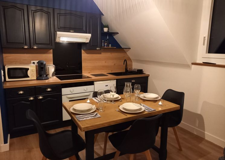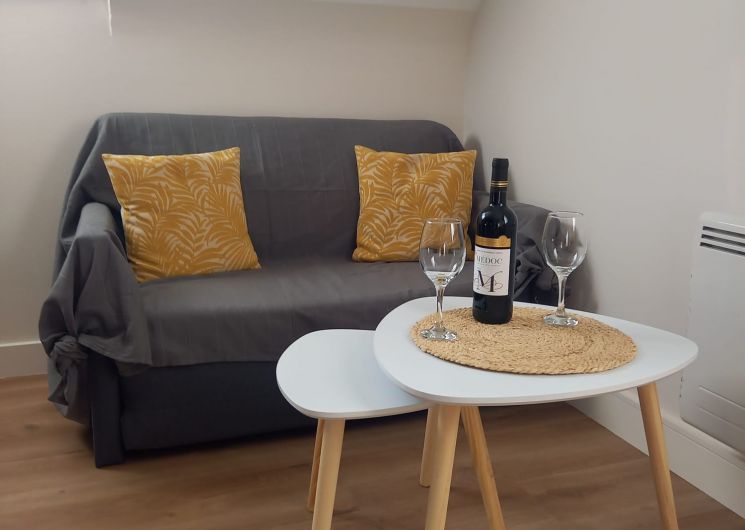 Appartement au 1er étage (rénové 2024) comprenant : 1 couloir, 1 chambre avec lit 140, 1 salle d’eau (douche), 1 WC indépendant, 1 coin séjour et cuisine équipée de 12 m². Parking gratuit à proximité. Petite cour intérieure devant la maison (clôturée).