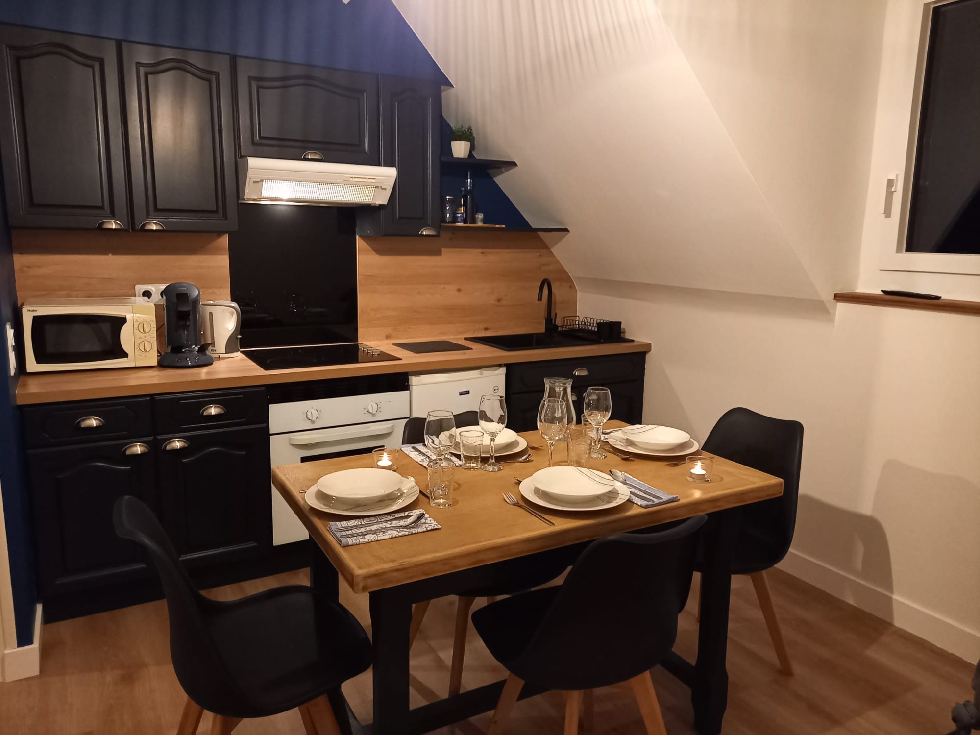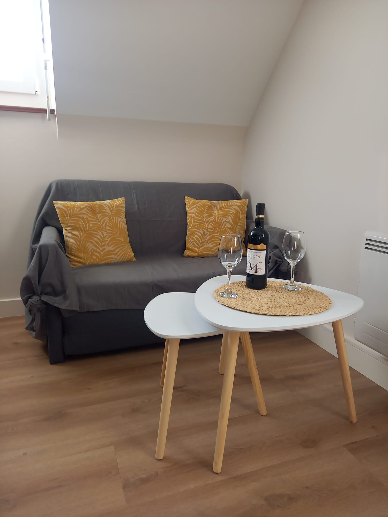 Appartement au 1er étage (rénové 2024) comprenant : 1 couloir, 1 chambre avec lit 140, 1 salle d’eau (douche), 1 WC indépendant, 1 coin séjour et cuisine équipée de 12 m². Parking gratuit à proximité. Petite cour intérieure devant la maison (clôturée).