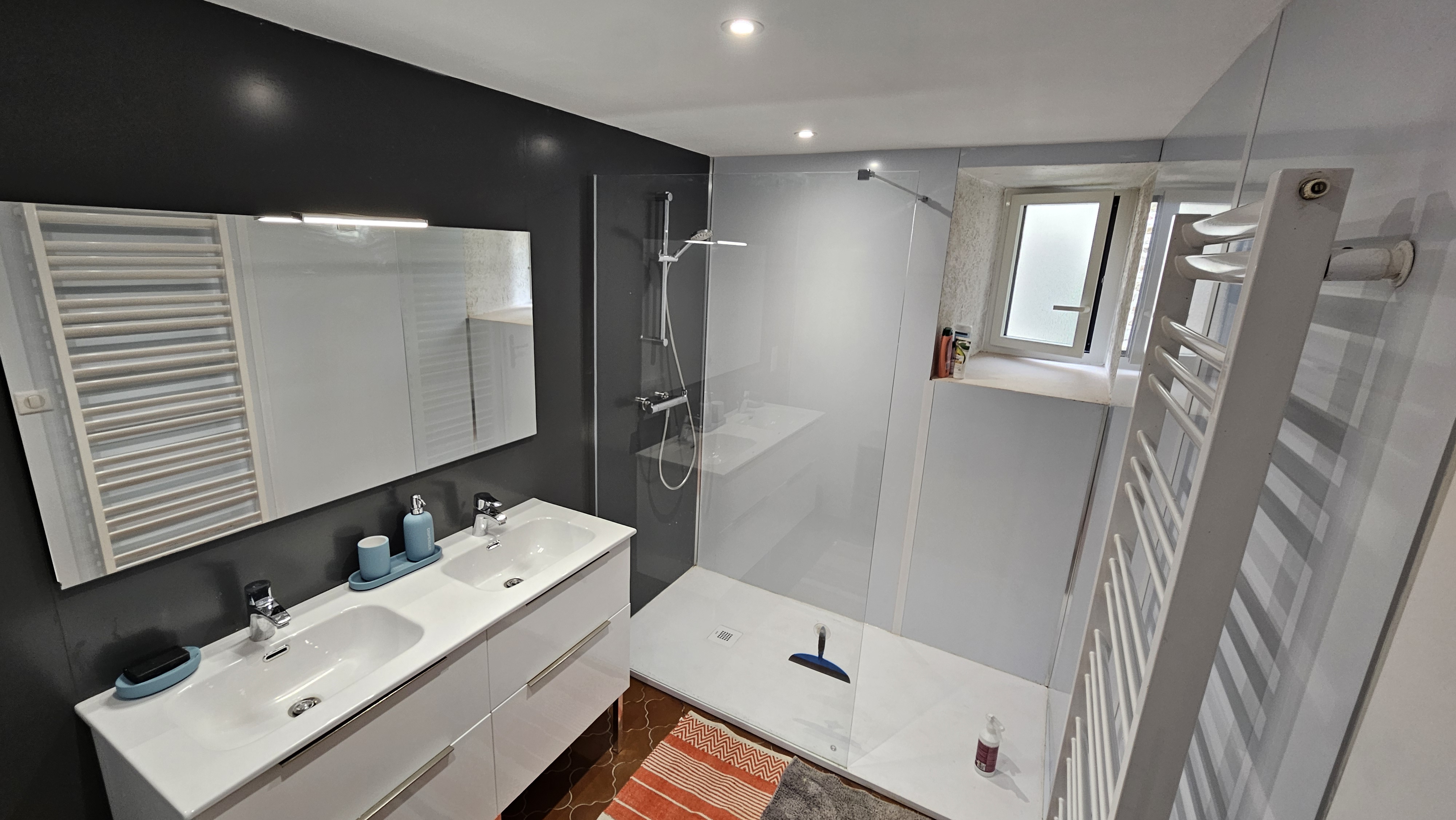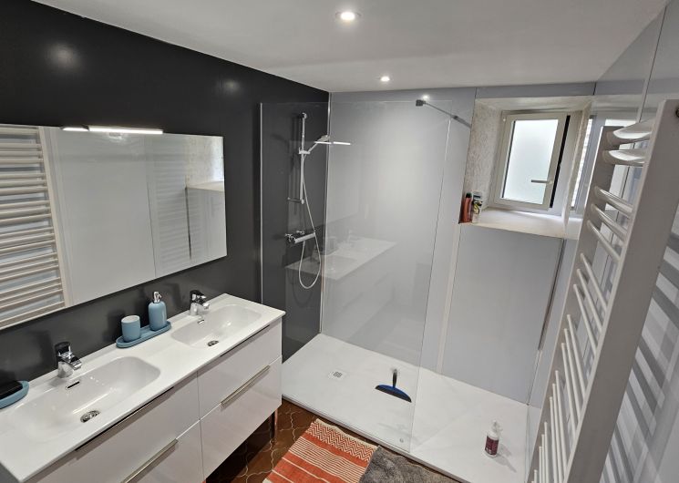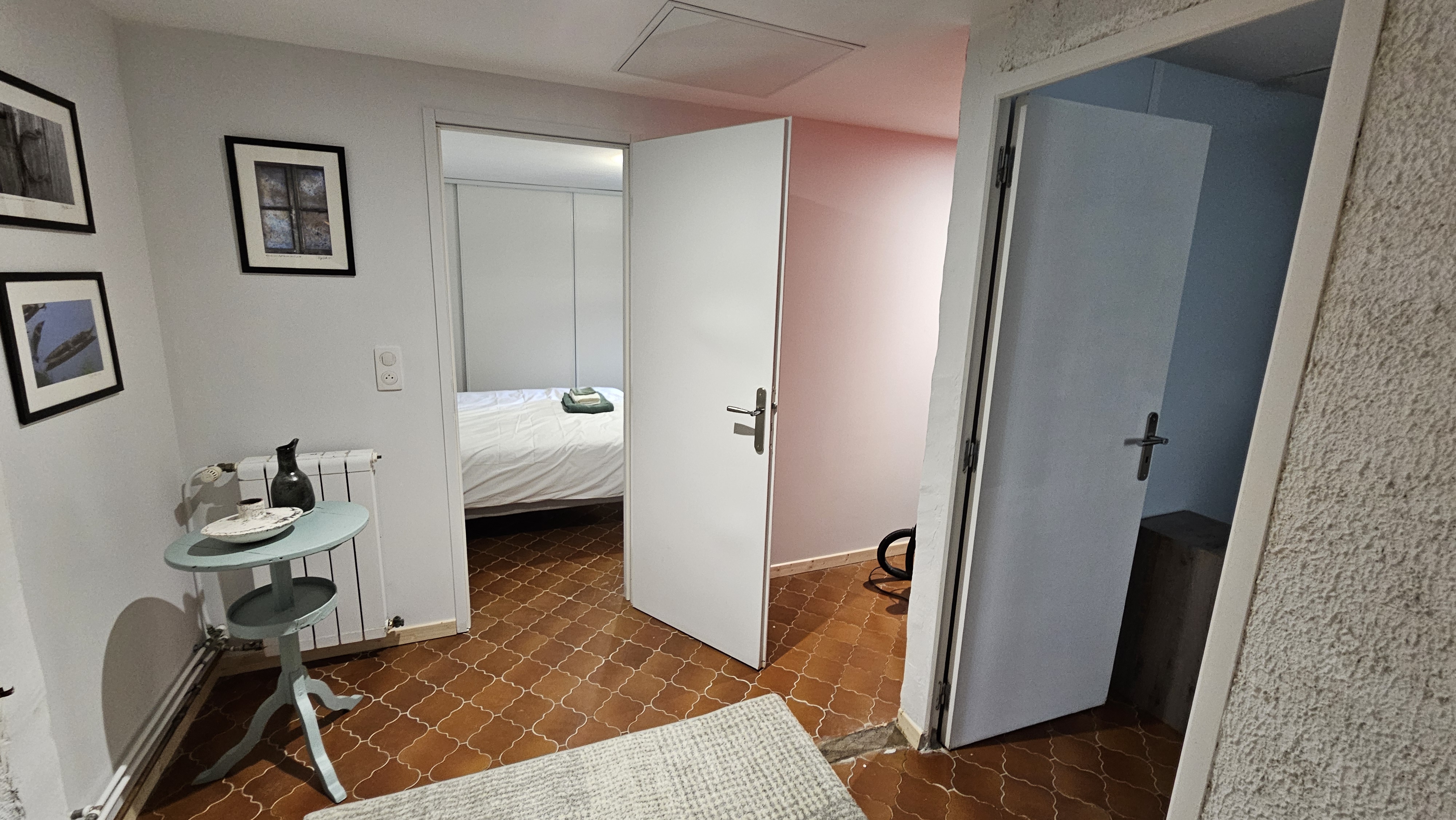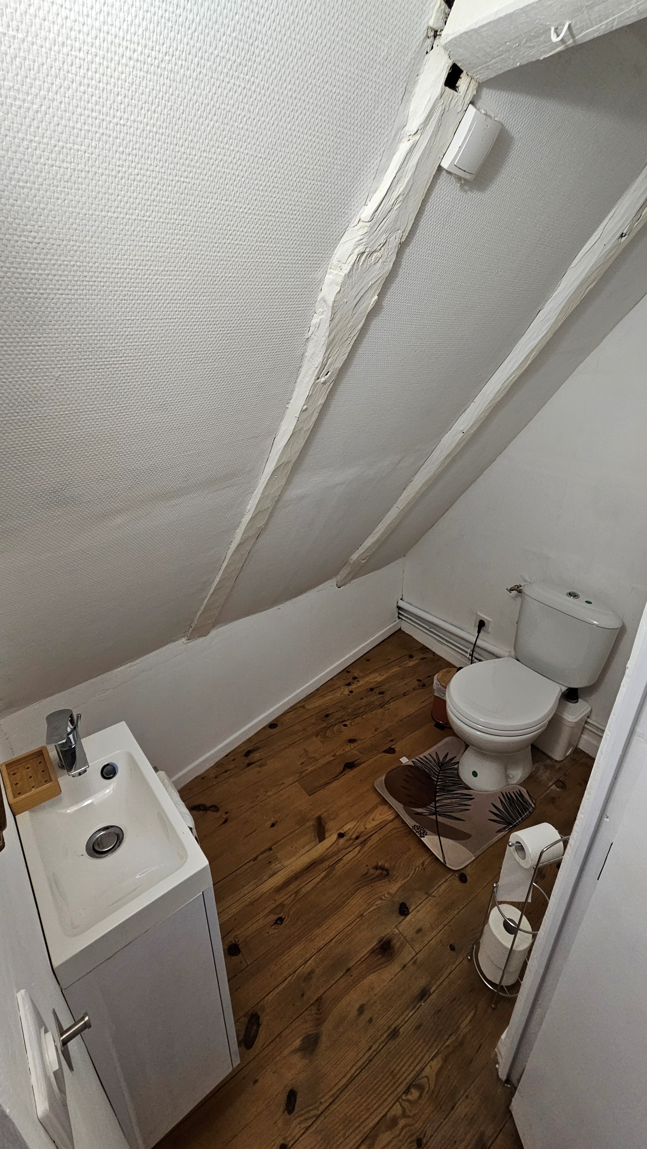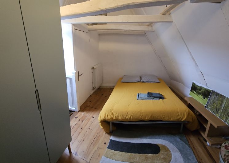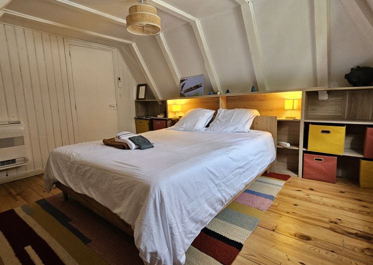 RDC inférieur, se trouve une chambre, meublée d’un lit queen size, d’une armoire de rangement avec penderie. Une porte permet d’accéder vers l’extérieur. Ce niveau accueille une vaste salle d’eau munie de deux vasques et d’une douche à l’italienne. WC séparé. Buanderie avec lave-linge, nécessaire de repassage et congélateur. RDC supérieur , la pièce de vie se compose d’un coin salon (canapé, fauteuils, télévision, WIFI, cheminée). Un bar en briquettes sépare la cuisine du coin repas. Vous disposez de tout l’équipement nécessaire à la vie quotidienne : réfrigérateur, lave-vaisselle, four, plaques à induction, micro-ondes, bouilloire, cafetière filtre et cafetière Nexpresso… 1er étage, une chambre, lit, queen size, climatisation . Sur le palier un couchage (Convertible 140). La pièce est équipée d’une armoire de rangement, d’un Vélux occultant. Un second WC est situé à cet étage.