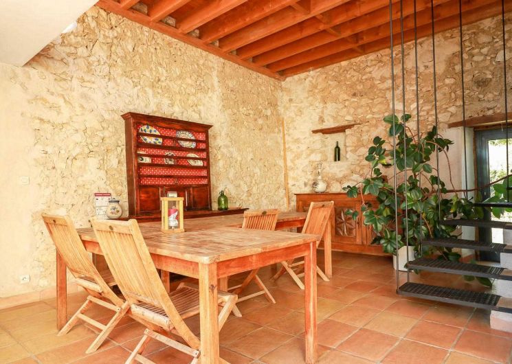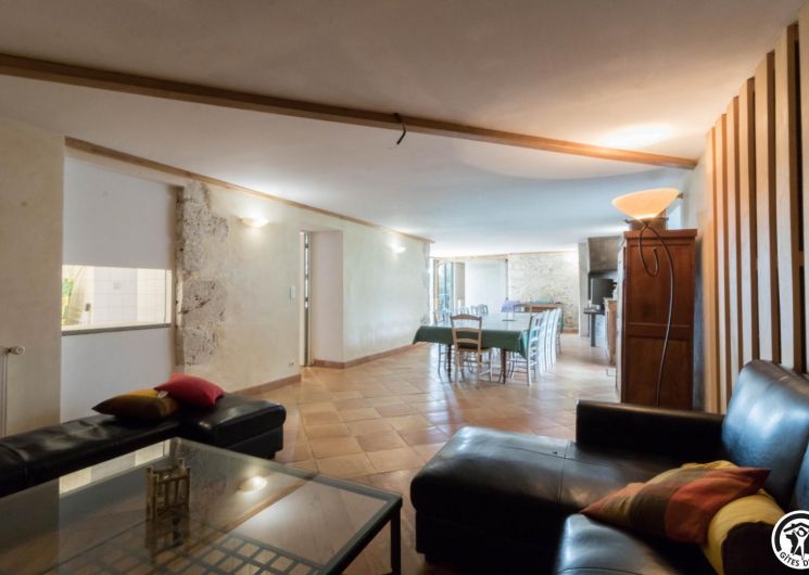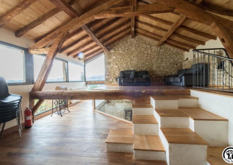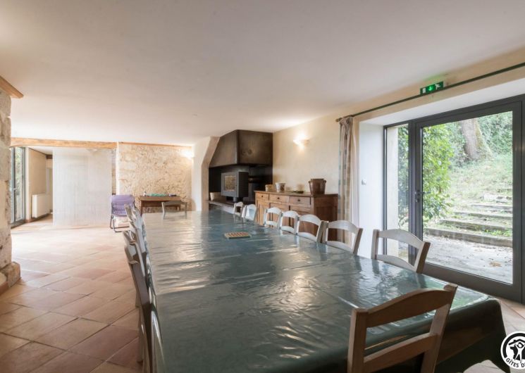 Gîte de groupe de caractère, alliant les matériaux traditionnels (pierre, terre, bois) et des aménagements contemporains (grandes baies vitrées, escaliers, cheminées, métal…).