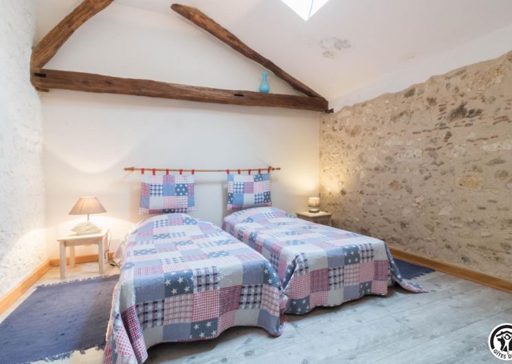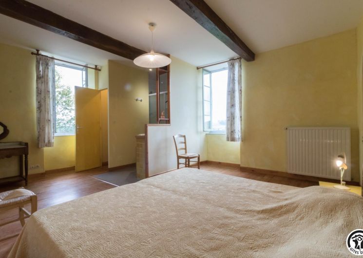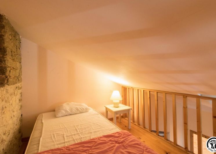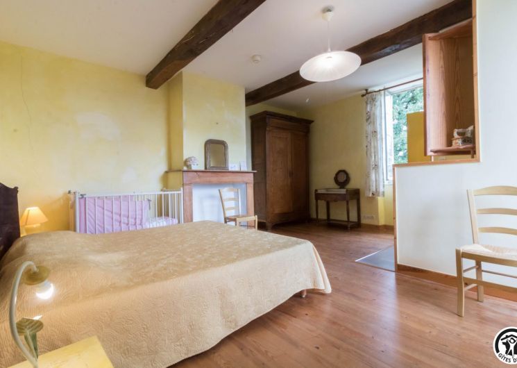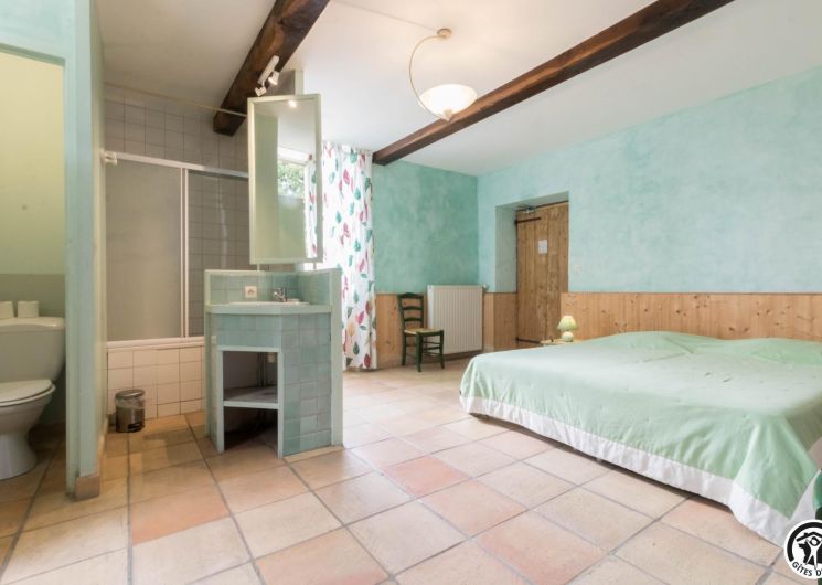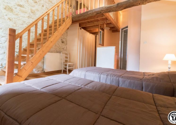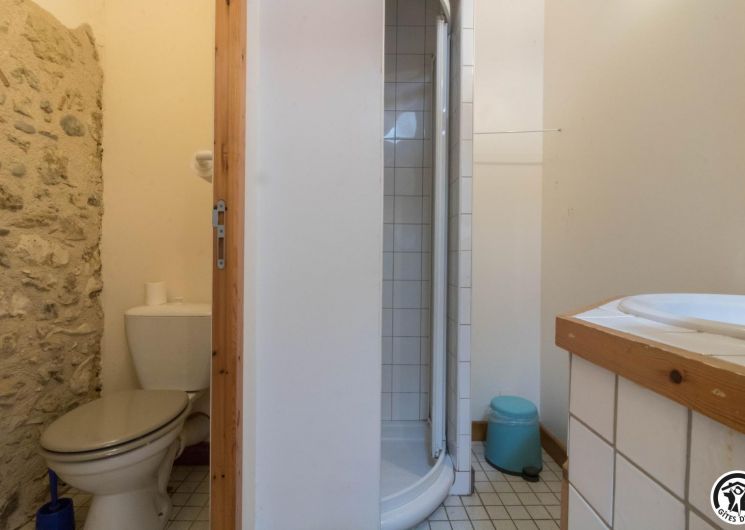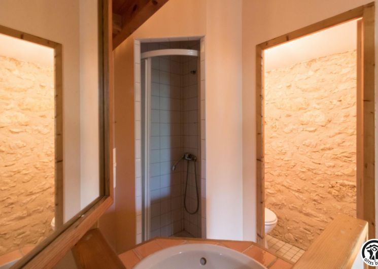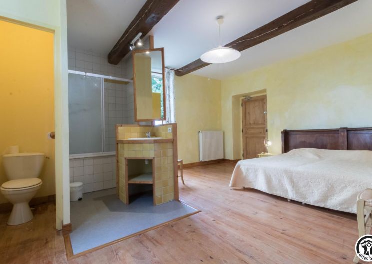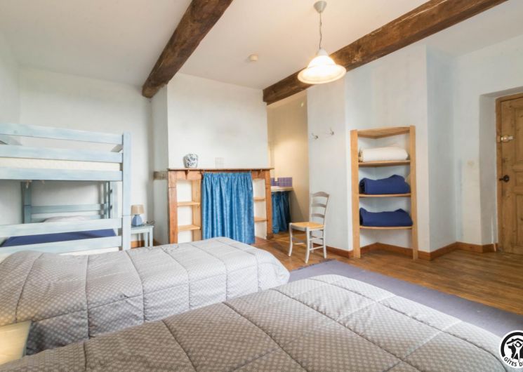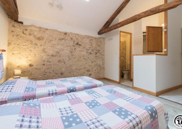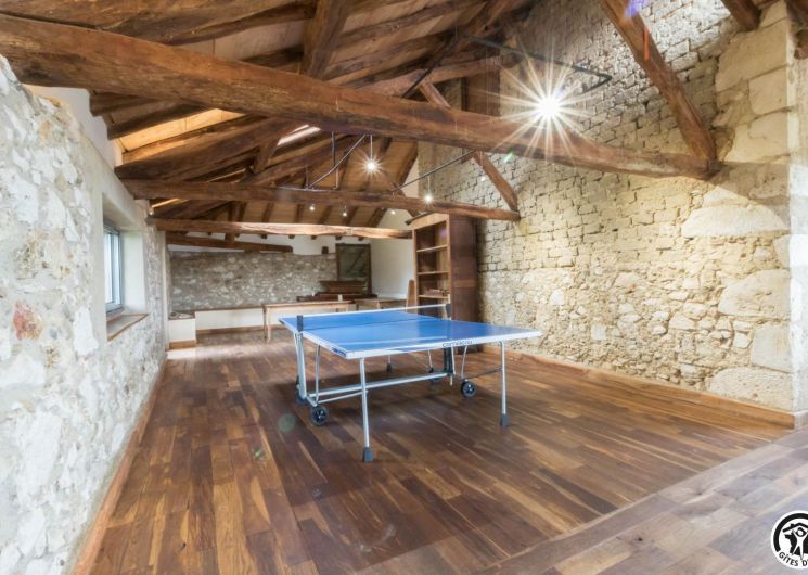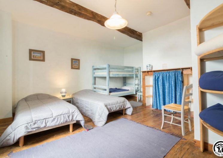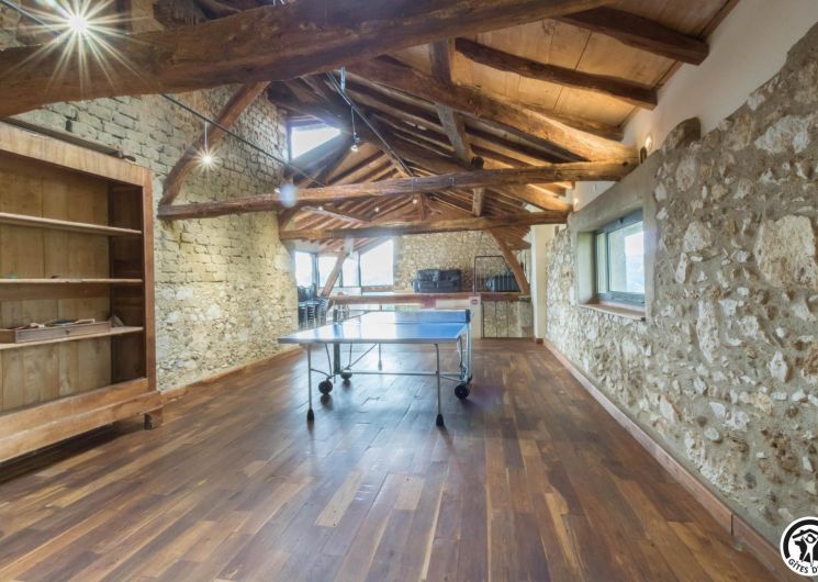 – A l’étage, salle d’animation sous les toits avec table de ping-pong, charpente apparente (réunions, séminaires, fêtes…), accessible depuis la salle à manger du rez-de-chaussée, accès direct sur la piscine. 4 chambres (2 lits en 90*190cm)(2 lits en 90*190cm et lit bébé)(2 lits en 90*190cm et 1 lit en 90*190cm en mezzanine, escalier raide et faible hauteur sous le plafond)(2 lits en 90*190cm et 2 lits en 90*190cm, superposés). Chaque chambre est équipée d’une douche et d’une vasque ouvertes sur l’espace nuit, et d’un WC séparé fermé. 5 lits pliables sont à votre disposition également.