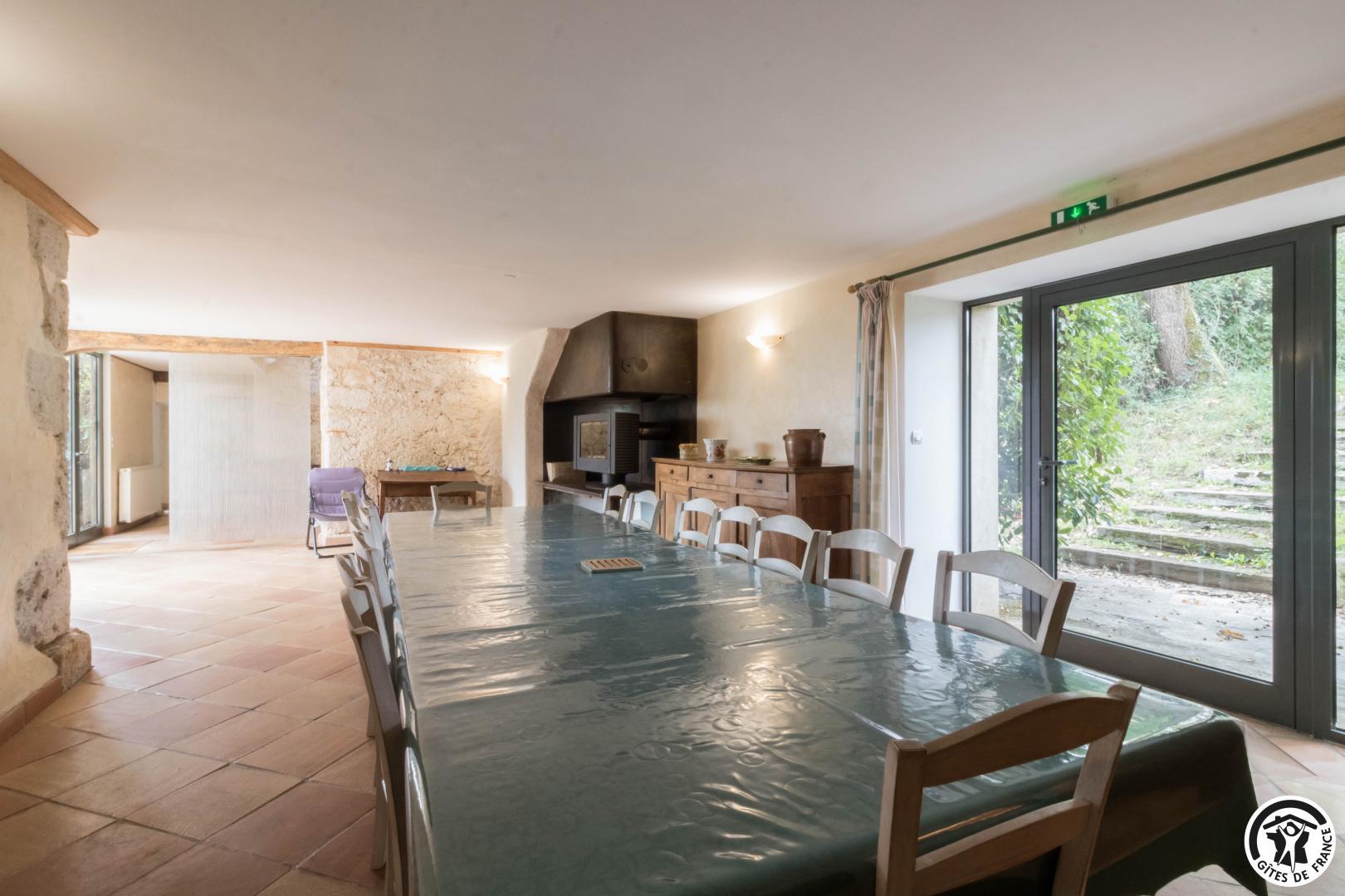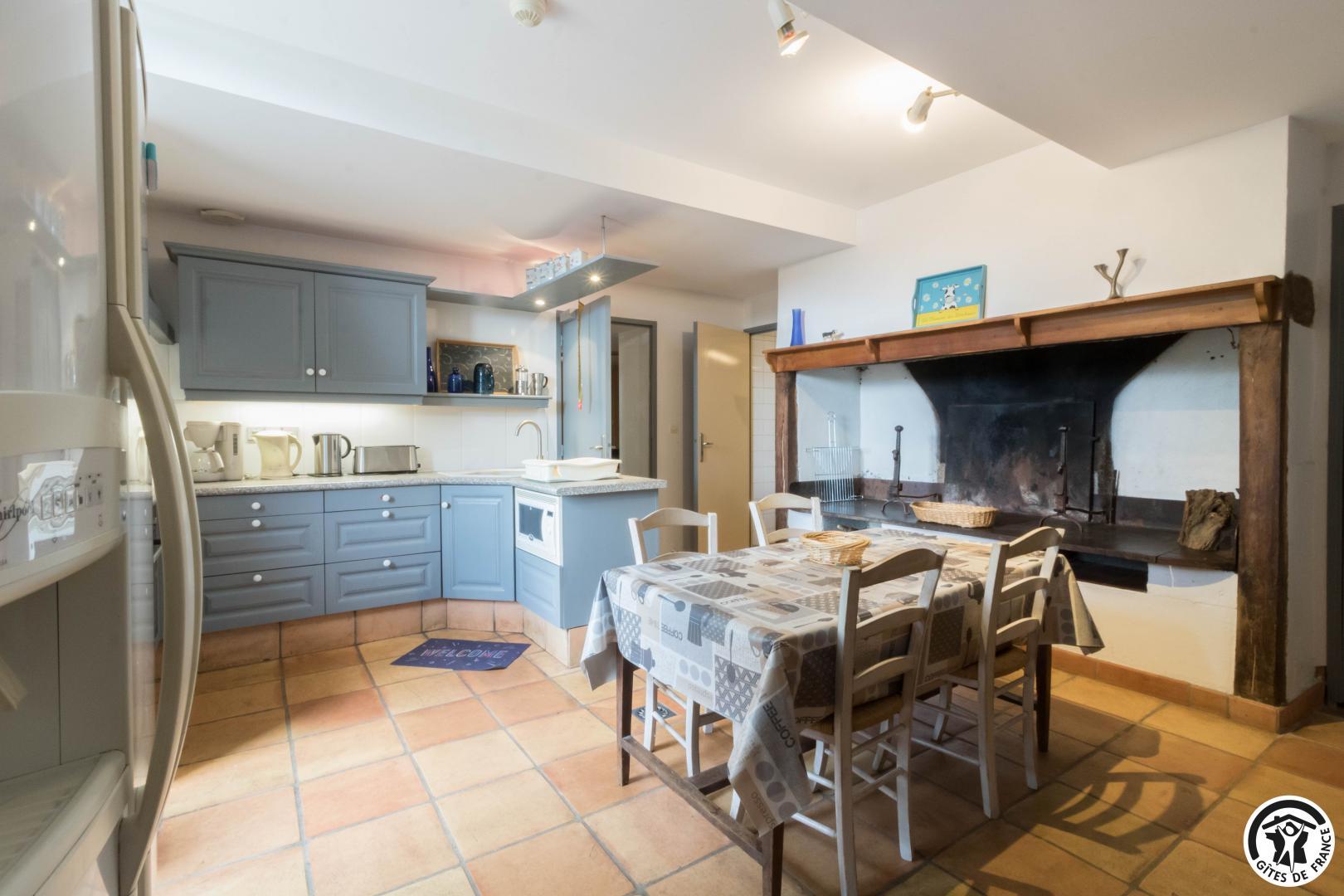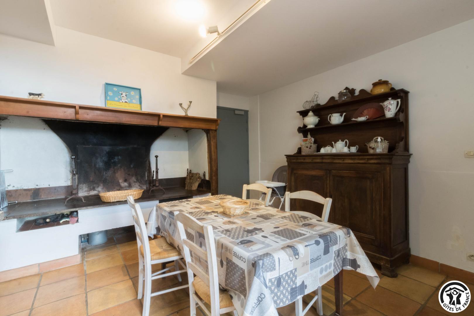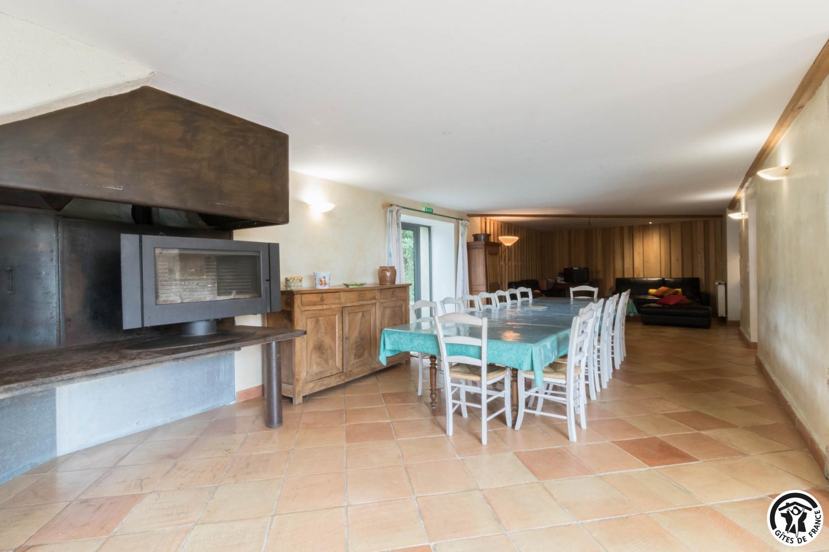 – Rez-de-chaussée : cuisine traditionnelle, avec local plonge séparé (lave-vaisselle et lave-linge), dotée d’une grande cheminée. Salle à manger de 85 m² avec cheminée et espace TV/lecture pour 40 personnes, accès sur l’extérieur. 2 chambres avec chacune 2 lits en 90*190cm, jumelables. Toilettes spacieux pour les lieux communs (2 lavabos, 2 WC, 2 miroirs, 1 douche). Accessible aux personnes handicapées.