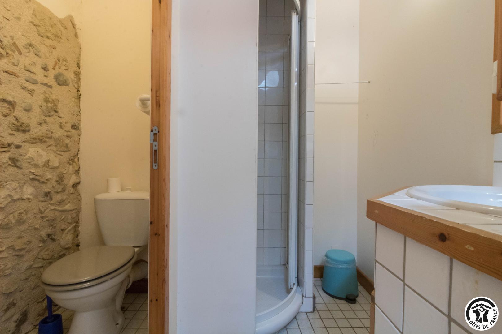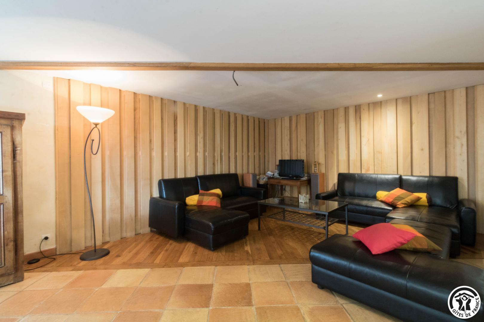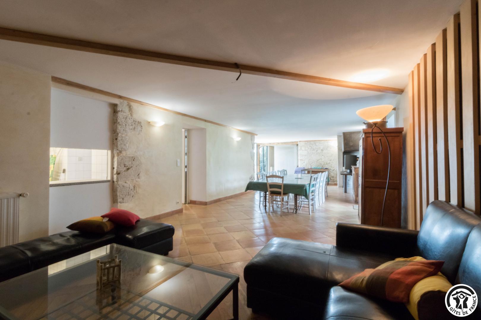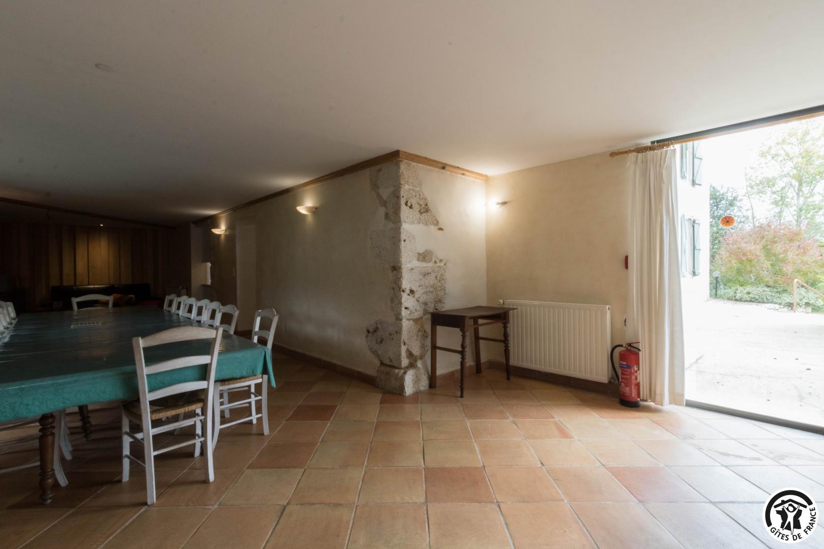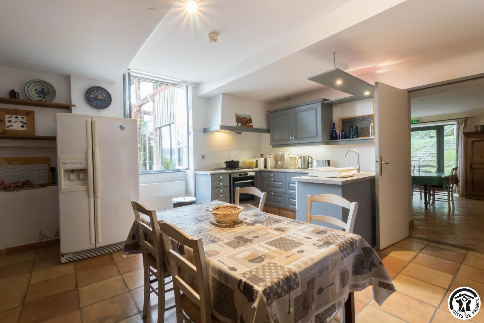 – Rez-de-chaussée : cuisine traditionnelle, avec local plonge séparé (lave-vaisselle et lave-linge), dotée d’une grande cheminée. Salle à manger de 85 m² avec cheminée et espace TV/lecture pour 40 personnes, accès sur l’extérieur. 2 chambres avec chacune 2 lits en 90*190cm, jumelables. Toilettes spacieux pour les lieux communs (2 lavabos, 2 WC, 2 miroirs, 1 douche). Accessible aux personnes handicapées.