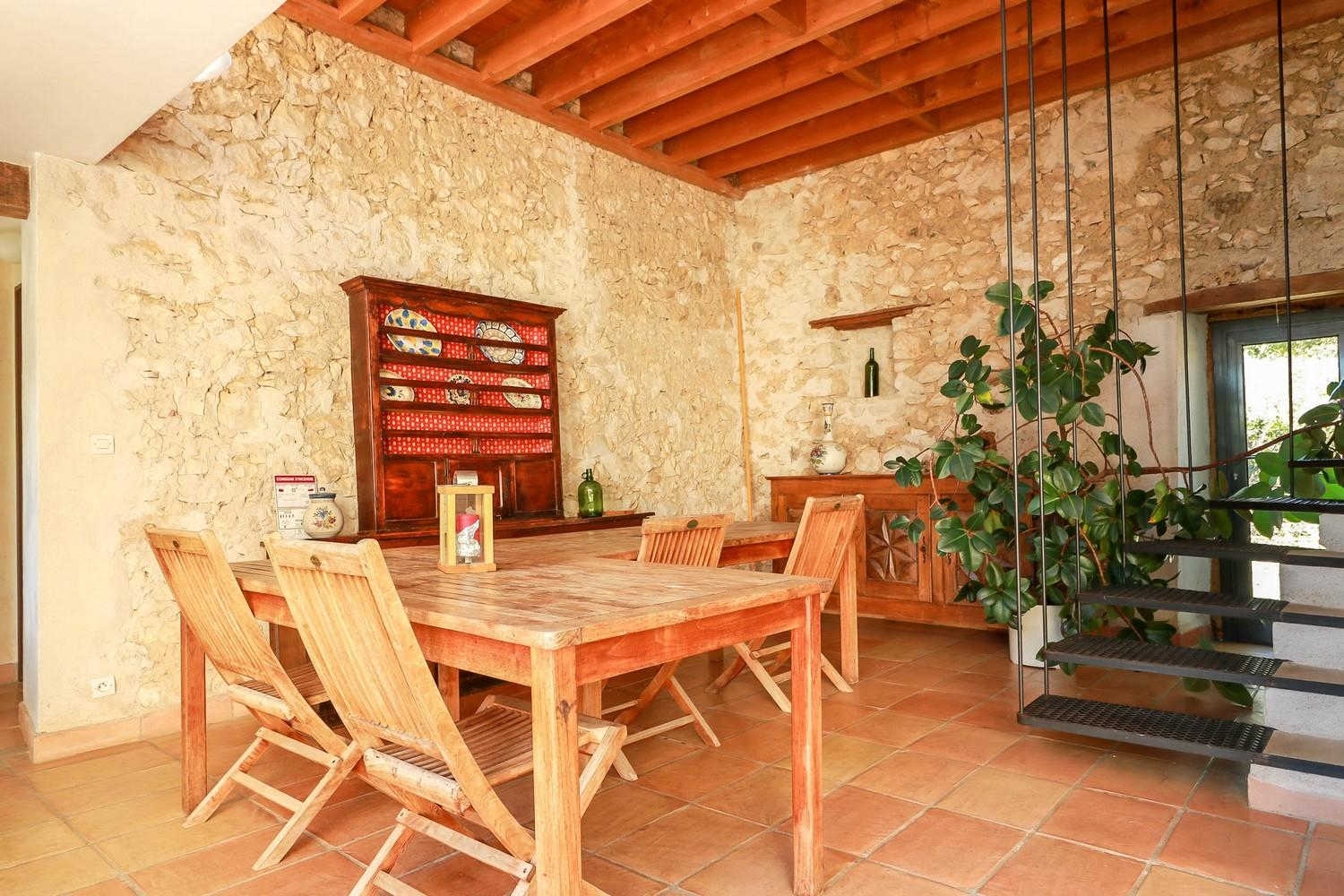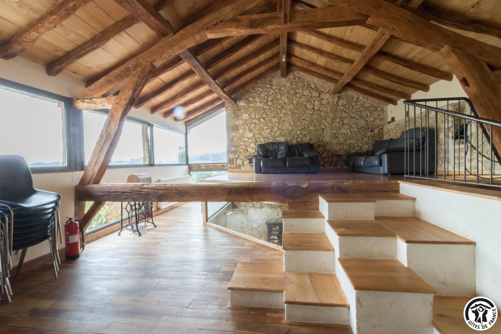 Gîte de groupe de caractère, alliant les matériaux traditionnels (pierre, terre, bois) et des aménagements contemporains (grandes baies vitrées, escaliers, cheminées, métal…).