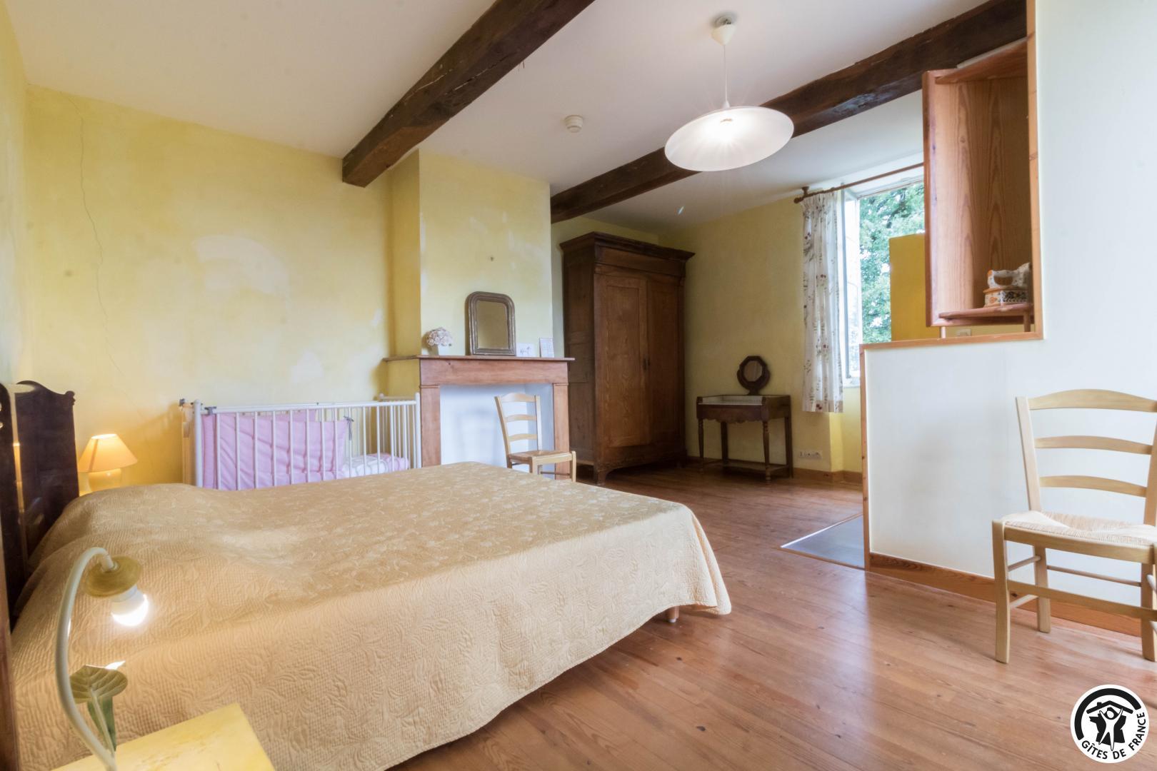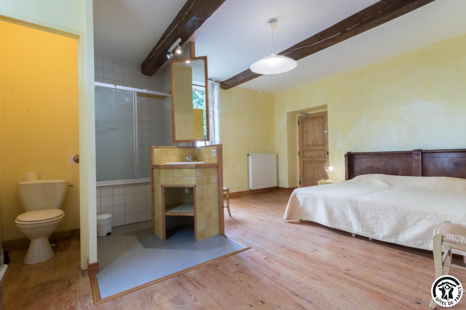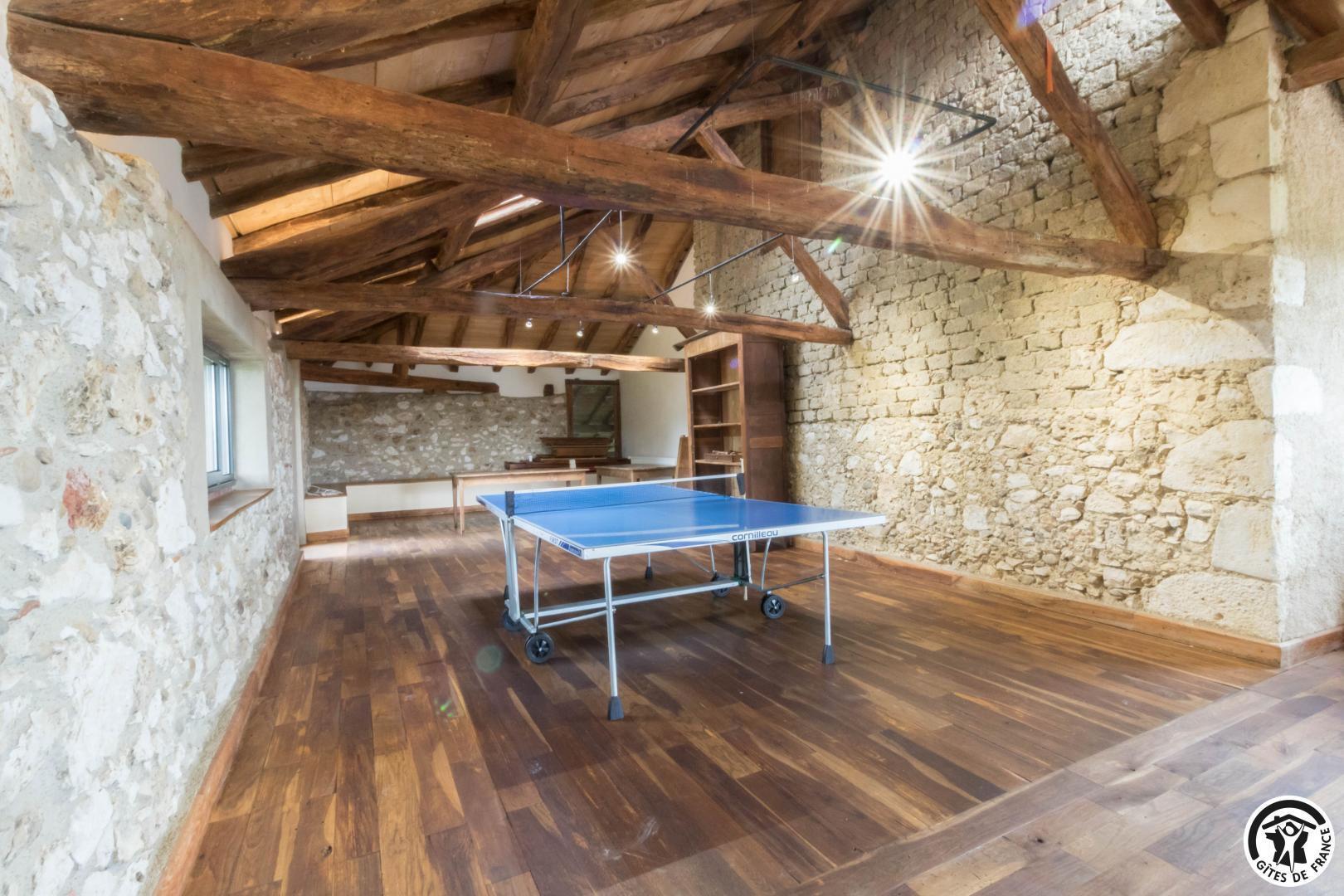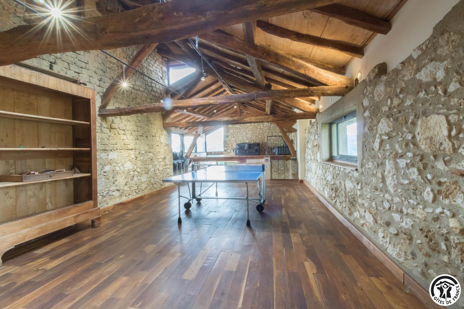 – A l’étage, salle d’animation sous les toits avec table de ping-pong, charpente apparente (réunions, séminaires, fêtes…), accessible depuis la salle à manger du rez-de-chaussée, accès direct sur la piscine. 4 chambres (2 lits en 90*190cm)(2 lits en 90*190cm et lit bébé)(2 lits en 90*190cm et 1 lit en 90*190cm en mezzanine, escalier raide et faible hauteur sous le plafond)(2 lits en 90*190cm et 2 lits en 90*190cm, superposés). Chaque chambre est équipée d’une douche et d’une vasque ouvertes sur l’espace nuit, et d’un WC séparé fermé. 5 lits pliables sont à votre disposition également.