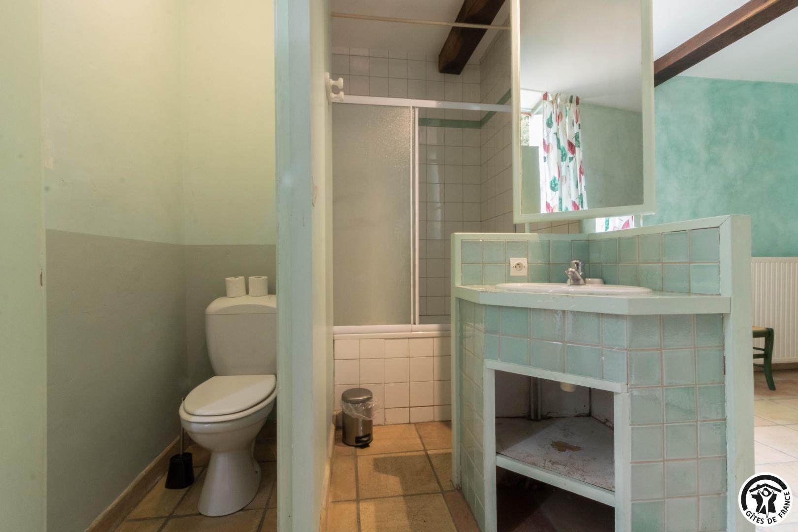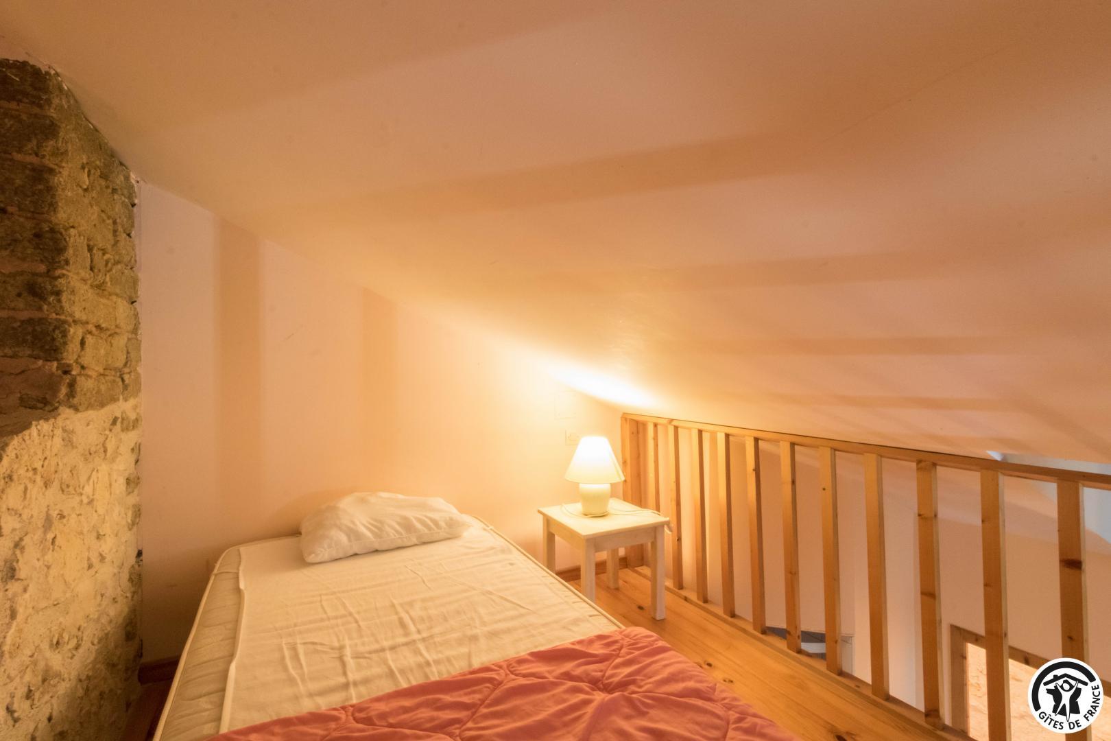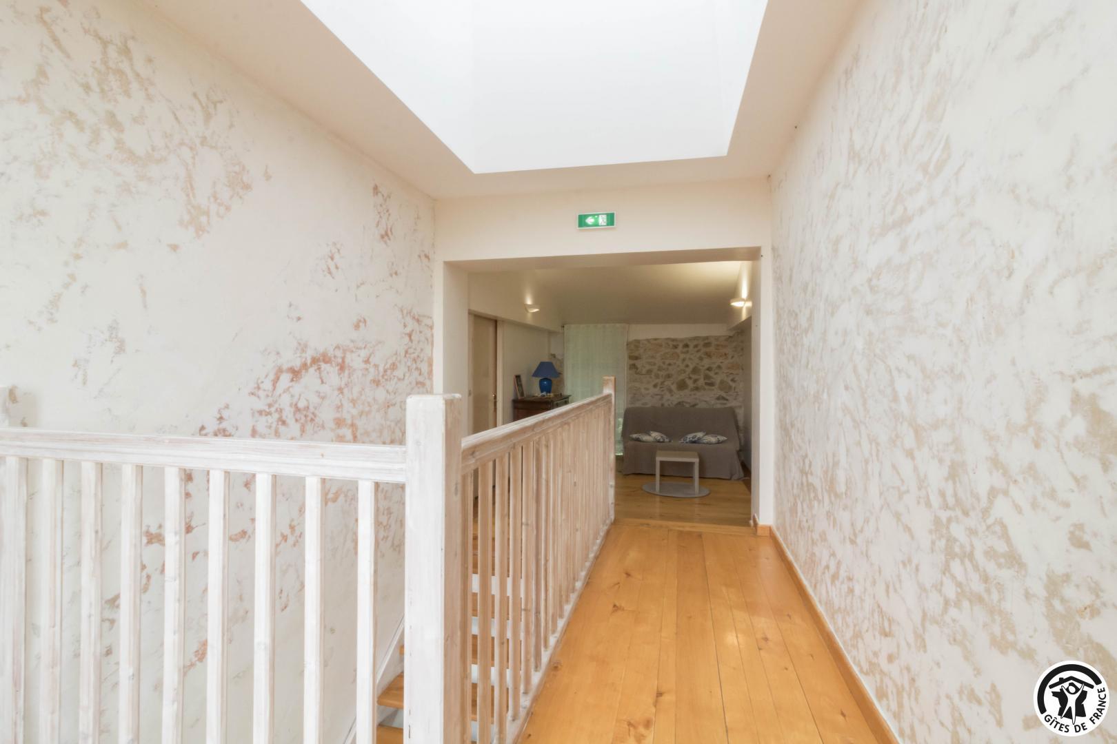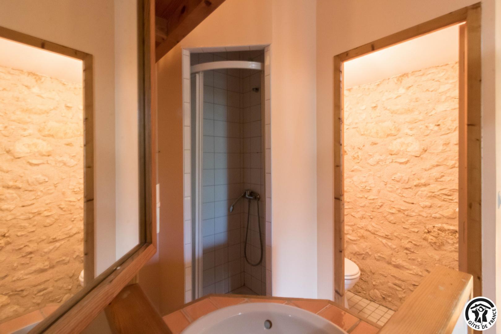 – A l’étage, salle d’animation sous les toits avec table de ping-pong, charpente apparente (réunions, séminaires, fêtes…), accessible depuis la salle à manger du rez-de-chaussée, accès direct sur la piscine. 4 chambres (2 lits en 90*190cm)(2 lits en 90*190cm et lit bébé)(2 lits en 90*190cm et 1 lit en 90*190cm en mezzanine, escalier raide et faible hauteur sous le plafond)(2 lits en 90*190cm et 2 lits en 90*190cm, superposés). Chaque chambre est équipée d’une douche et d’une vasque ouvertes sur l’espace nuit, et d’un WC séparé fermé. 5 lits pliables sont à votre disposition également.