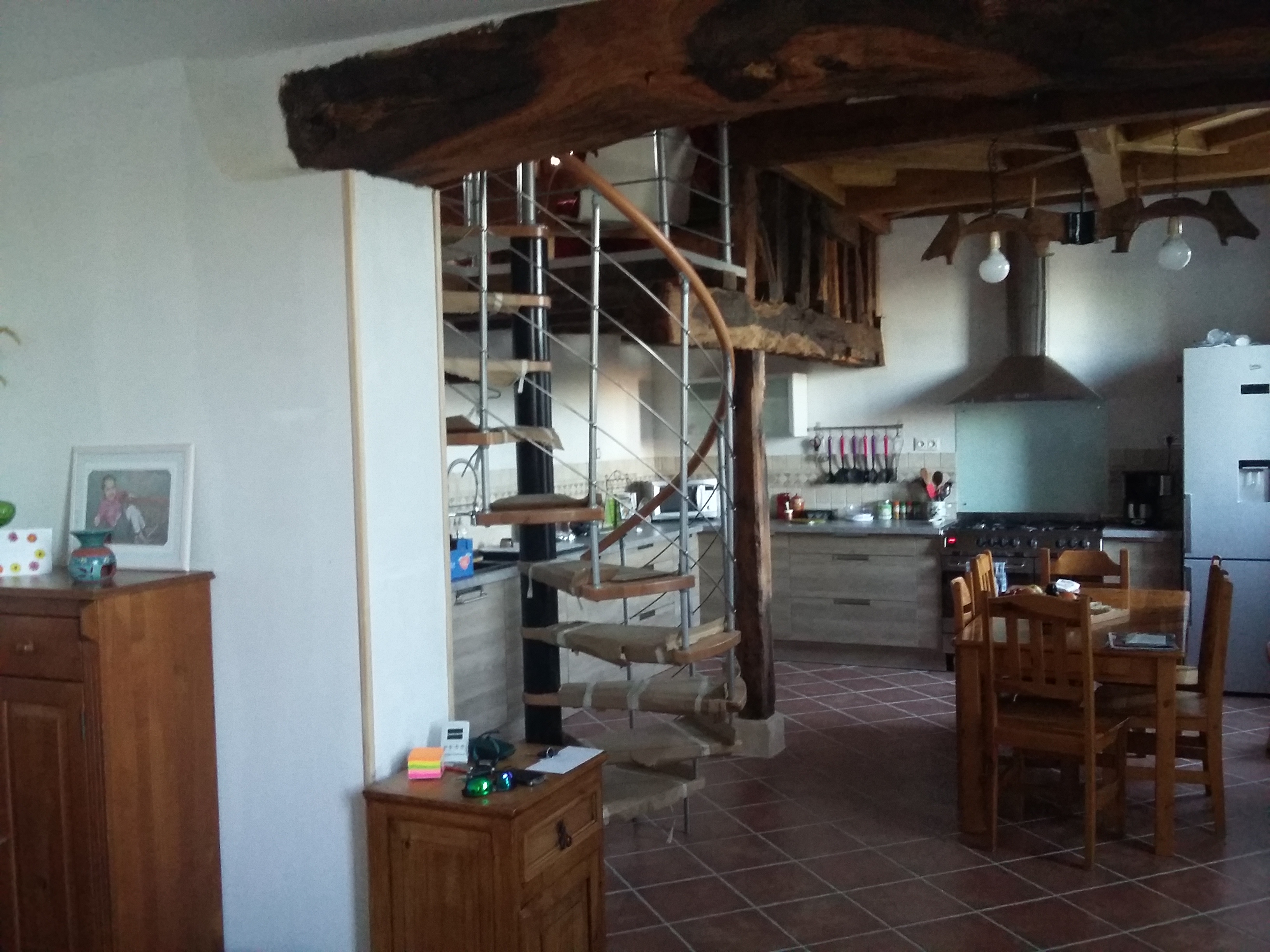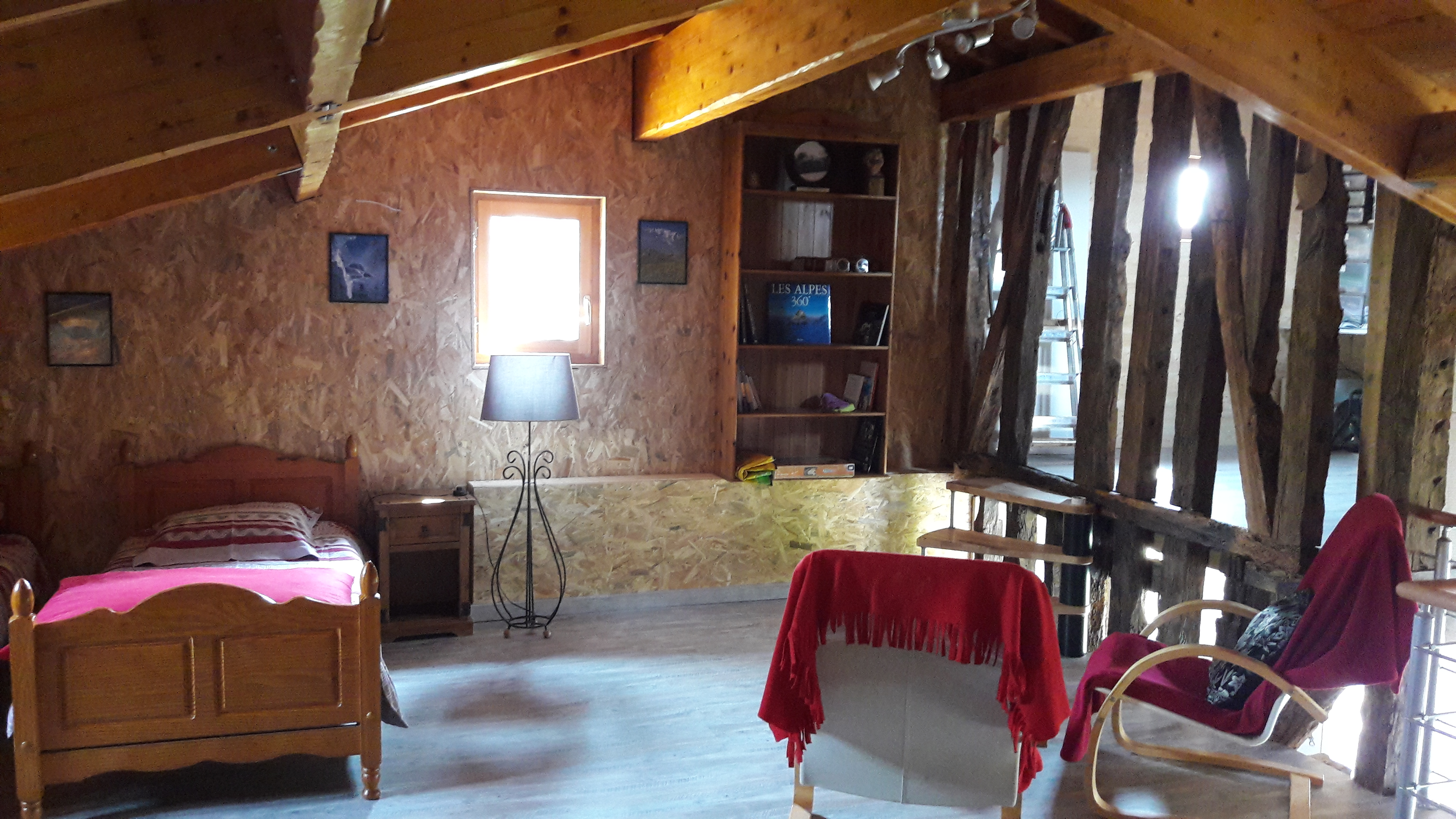 Le gîte est bien aménagé, à l’entrée la cuisine entièrement équipée, laisse place à quelques poutres anciennes avec une vue impressionnante sur la mezzanine où l’univers montagnard se fait ressentir au milieu des colombages.