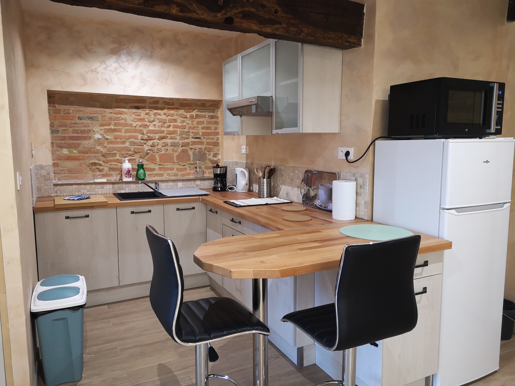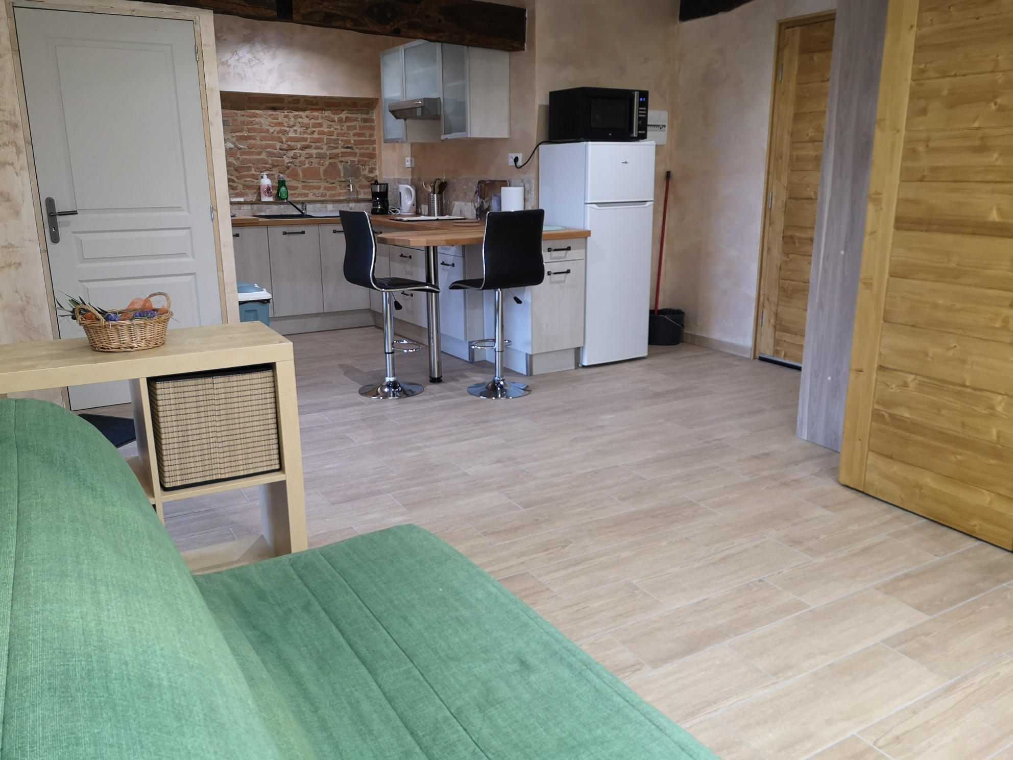 Dans l’ancienne étable , studio d’environ 25 m² dispose d’un canapé convertible, avec vue sur la campagne gersoise, et une cuisine aménagée avec plaques chauffantes, réfrigérateur, four, grille-pain…