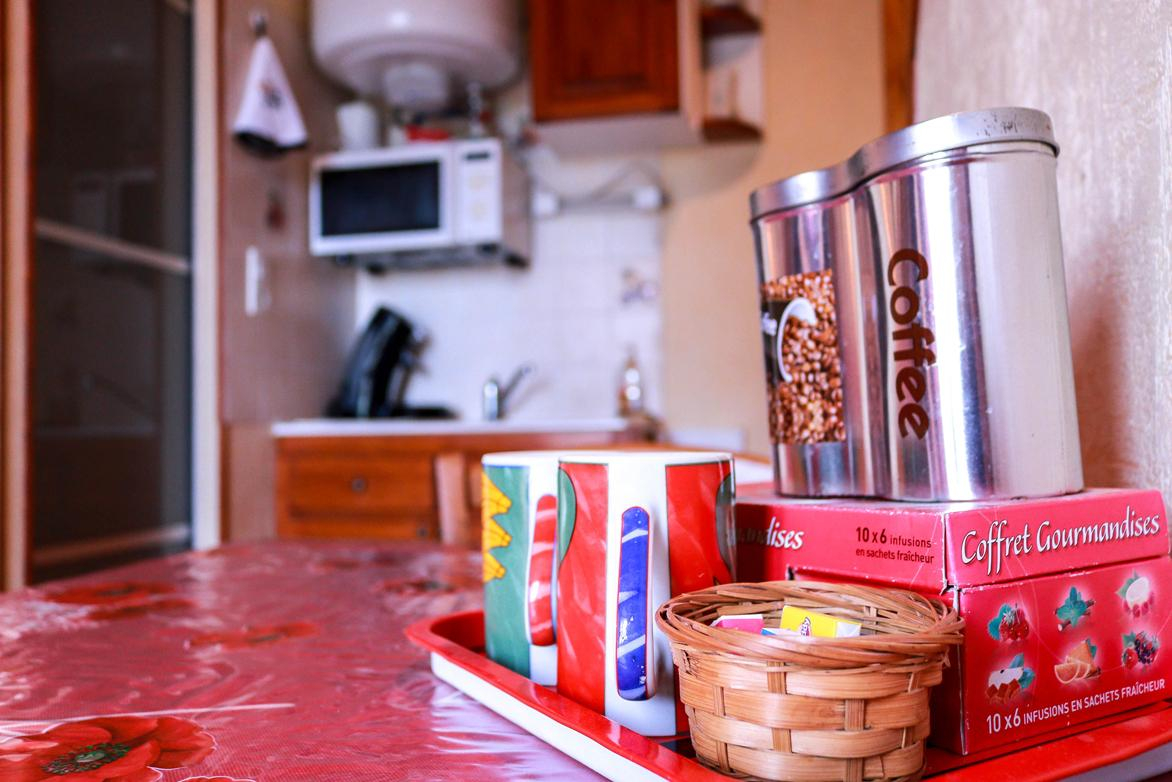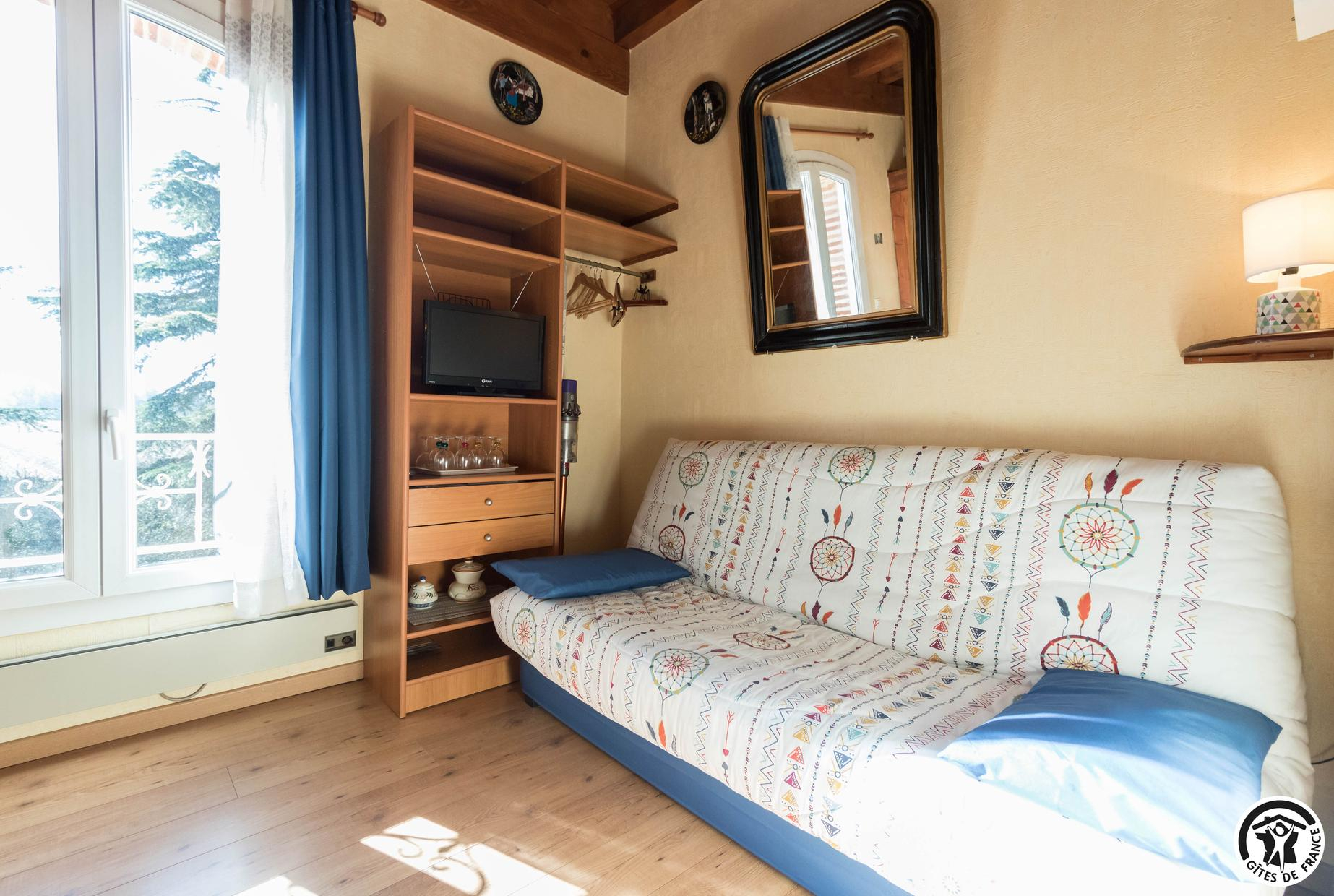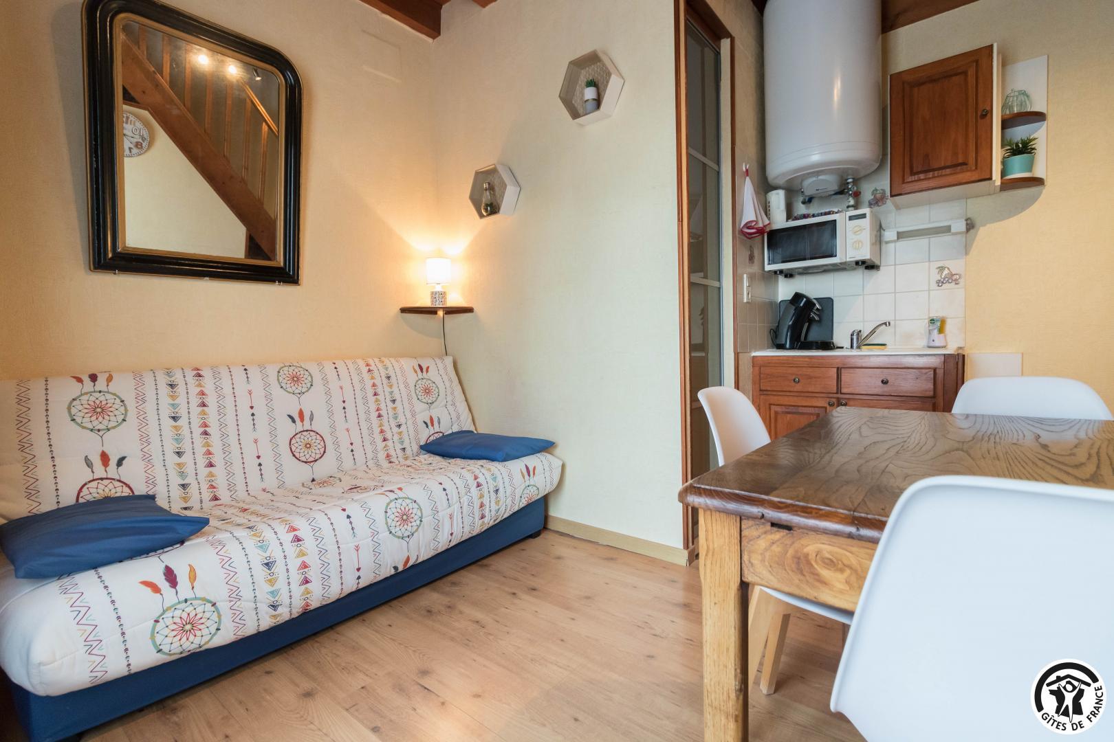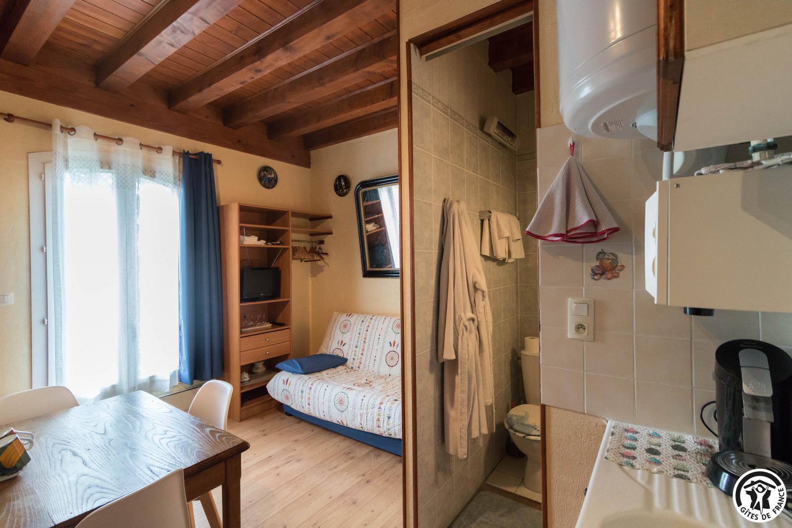 – au premier étage : chambre d’appoint avec clic-clac en 140cm, petite salle d’eau/WC, coin cuisine (micro-ondes, cafetière à dosettes, bouilloire, casseroles, poêles et vaisselles)