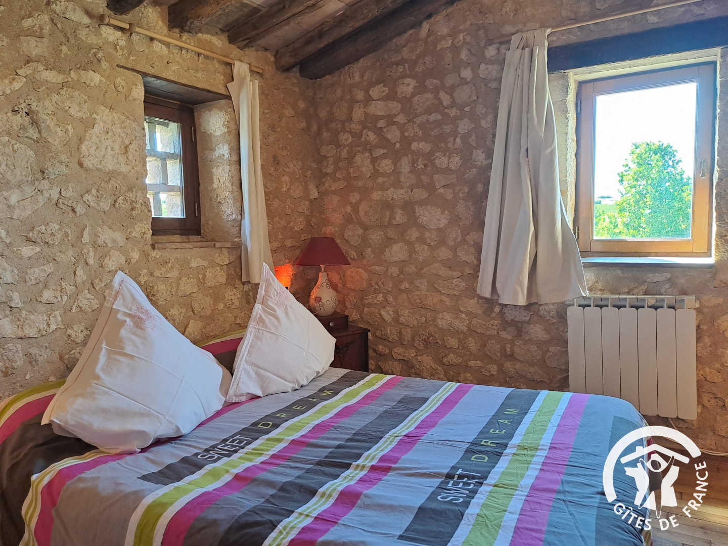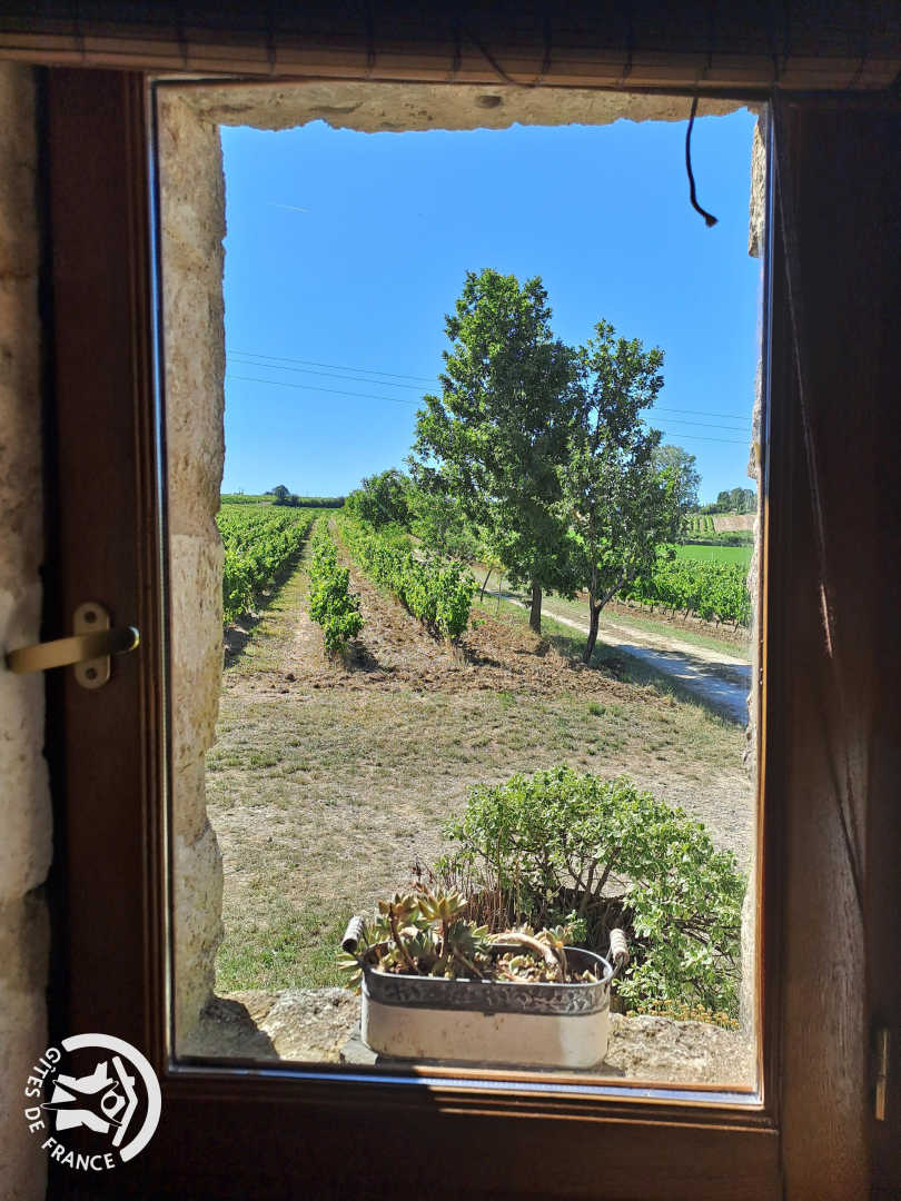A l’étage, au-dessus du salon, dans l’ancien pigeonnier lui-même se trouve la seconde chambre surplombant les vignes, avec un lit double en 140x190cm.