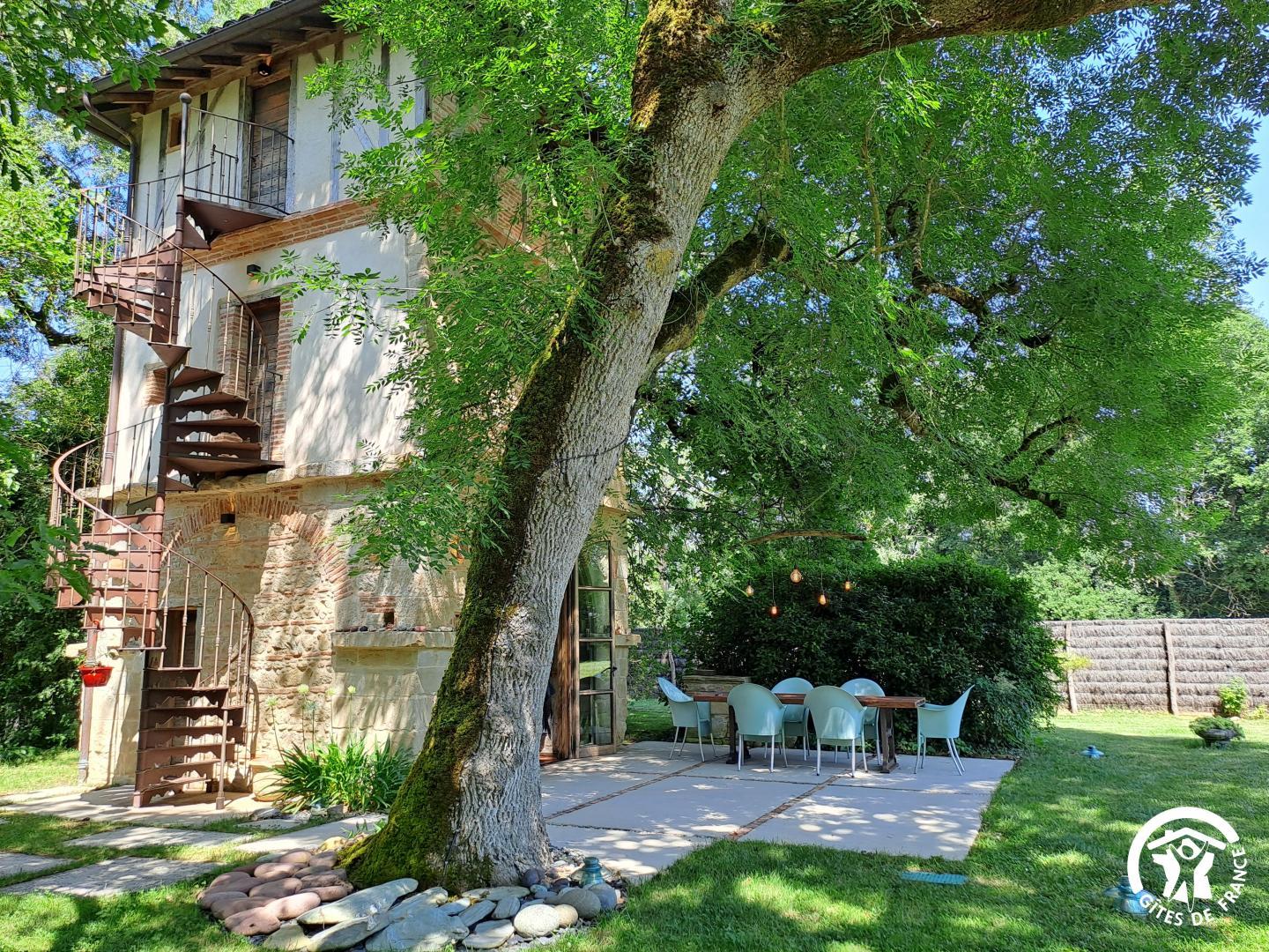 À l’extérieur, la grande terrasse ombragée par un arbre imposant est idéale pour vos repas. La nuit, l’éclairage doux crée une ambiance magique. Le jardin arboré, bien que non clos, vous garantit tranquillité et intimité. Vous y entendrez le chant des oiseaux, et peut-être apercevrez-vous des chevreuils au petit matin.