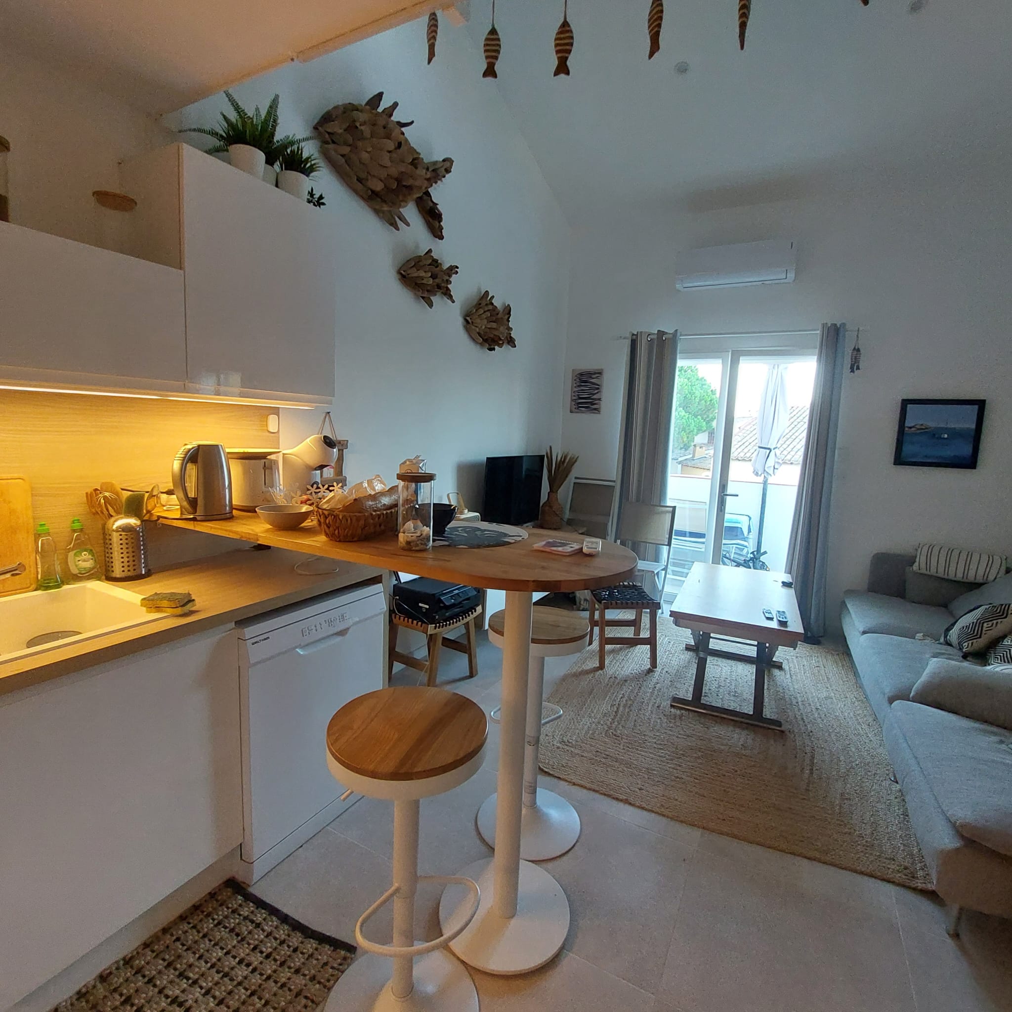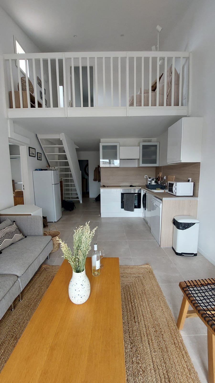 ✨ Un espace de vie lumineux et moderne, avec une cuisine équipée haut de gamme : plaques induction, four, cafetière, grille-pain, bouilloire… Le plan de travail bar invite à la convivialité.