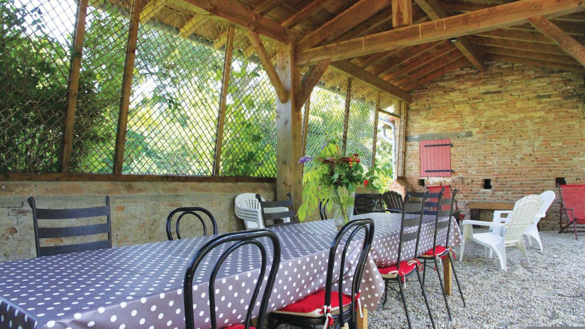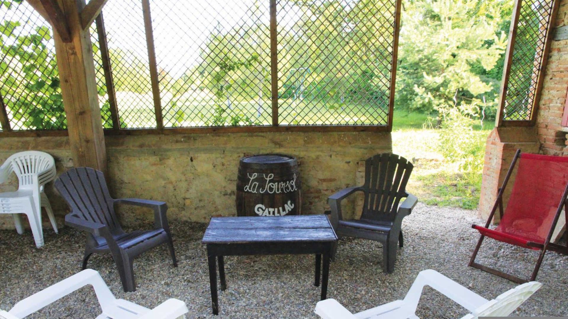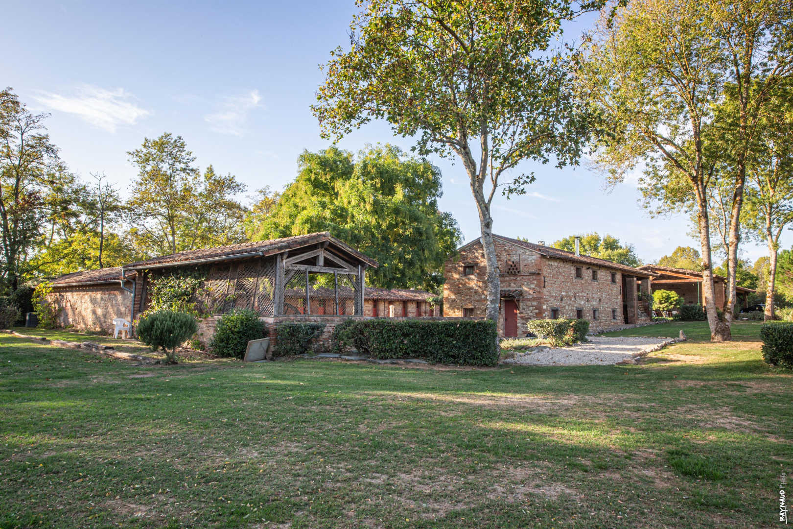 Ces bâtiments d’autrefois, rénovés à l’intérieur et décorés avec soin dans le goût de l’ancien, conservent leurs murs en briques rouges et en galets patiemment piochés dans le lit du Tarn. Le poulailler, le bûcher, la Chapelle, les anciennes porcheries s’organisent autour d’un patio ombragé et engazonné planté d’arbres magnifiques. Les arcades tout autour évoquent l’image d’un cloître.