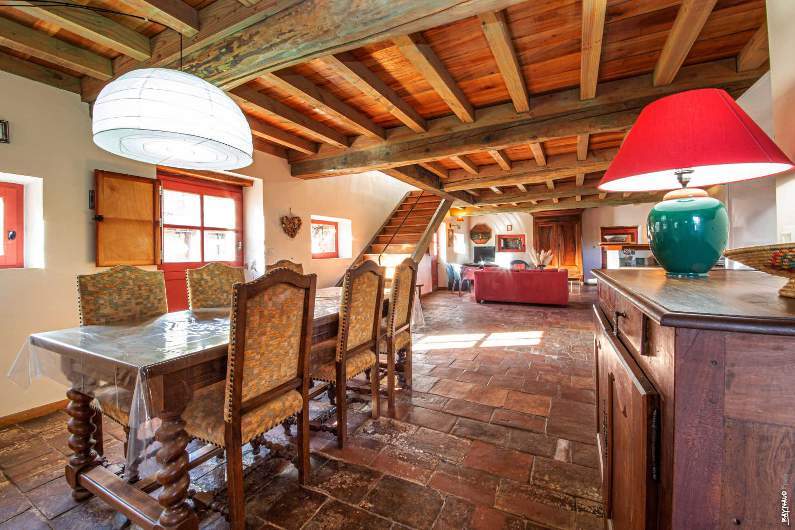 Bâtisse de 150m² avec grande pièce à vivre-cuisine ouverte, table à manger, espace salon avec TV et jeux de société, et wc au rez-de-chaussée.