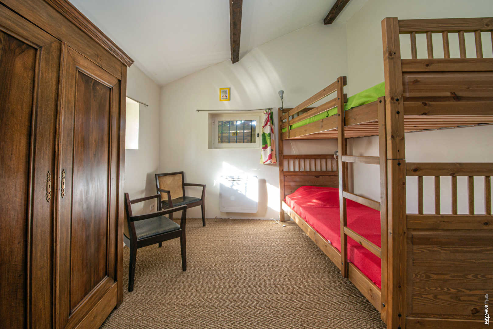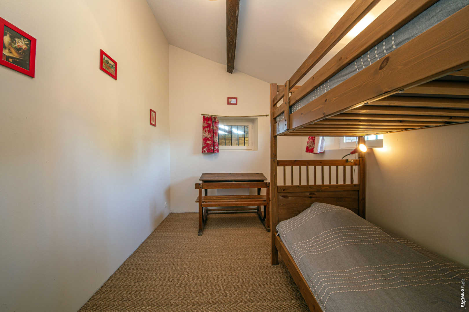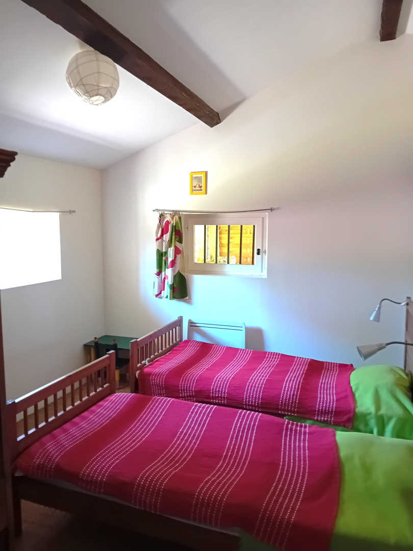A l’étage : trois chambres (deux avec lits superposés en 90x190cm et une troisième chambre avec lit en 140x190cm). Salle de bain avec baignoire et vasque.