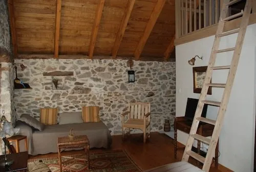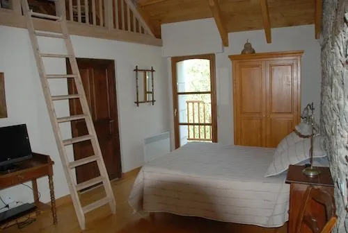 A l’étage : une chambre spacieuse de 24 m² avec charpente et pierres apparentes. Elle comprend un lit de 140, un lit de 90 et une armoire avec étagère et penderie, balcon avec vue sur la vallée, une salle de bains avec douche, lavabo, sèche-serviettes électrique, WC. Une petite mezzanine peut accueillir un couchage supplémentaire. TV et lecteur DVD. Wi-Fi.