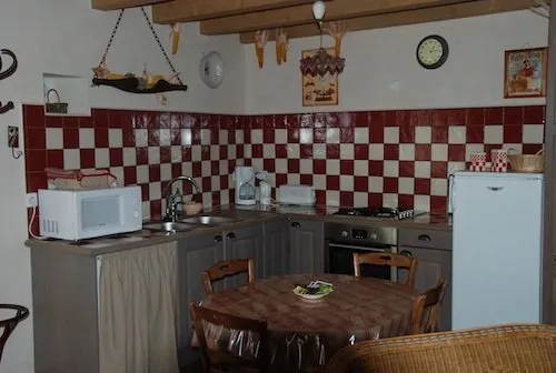 Au rez-de-chaussée (pièce à vivre de 25 m²) : cuisine entièrement équipée (réfrigérateur avec compartiment congélateur, four encastré, micro-ondes, plaque gaz quatre feux, lave-linge, évier double-bac, cafetière électrique, bouilloire électrique, vaisselle et ustensiles de cuisine …). Petit coin salon autour d’un poêle à bois, chauffage électrique et placard de rangement.