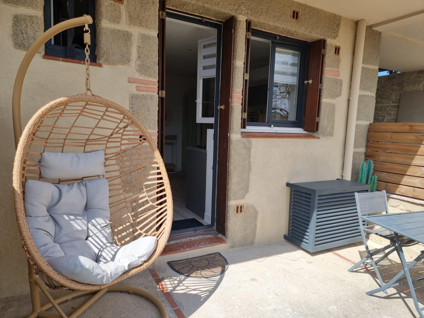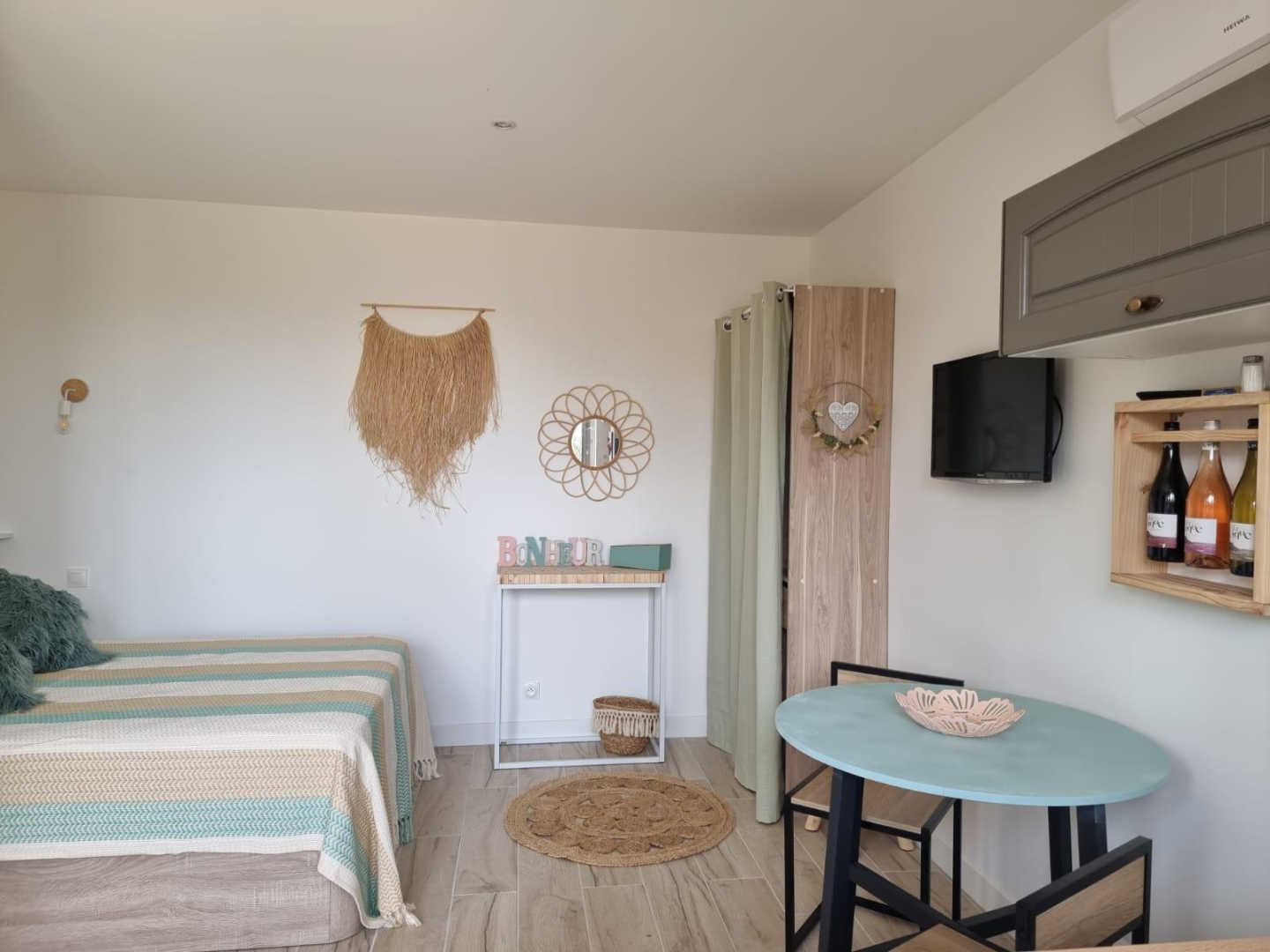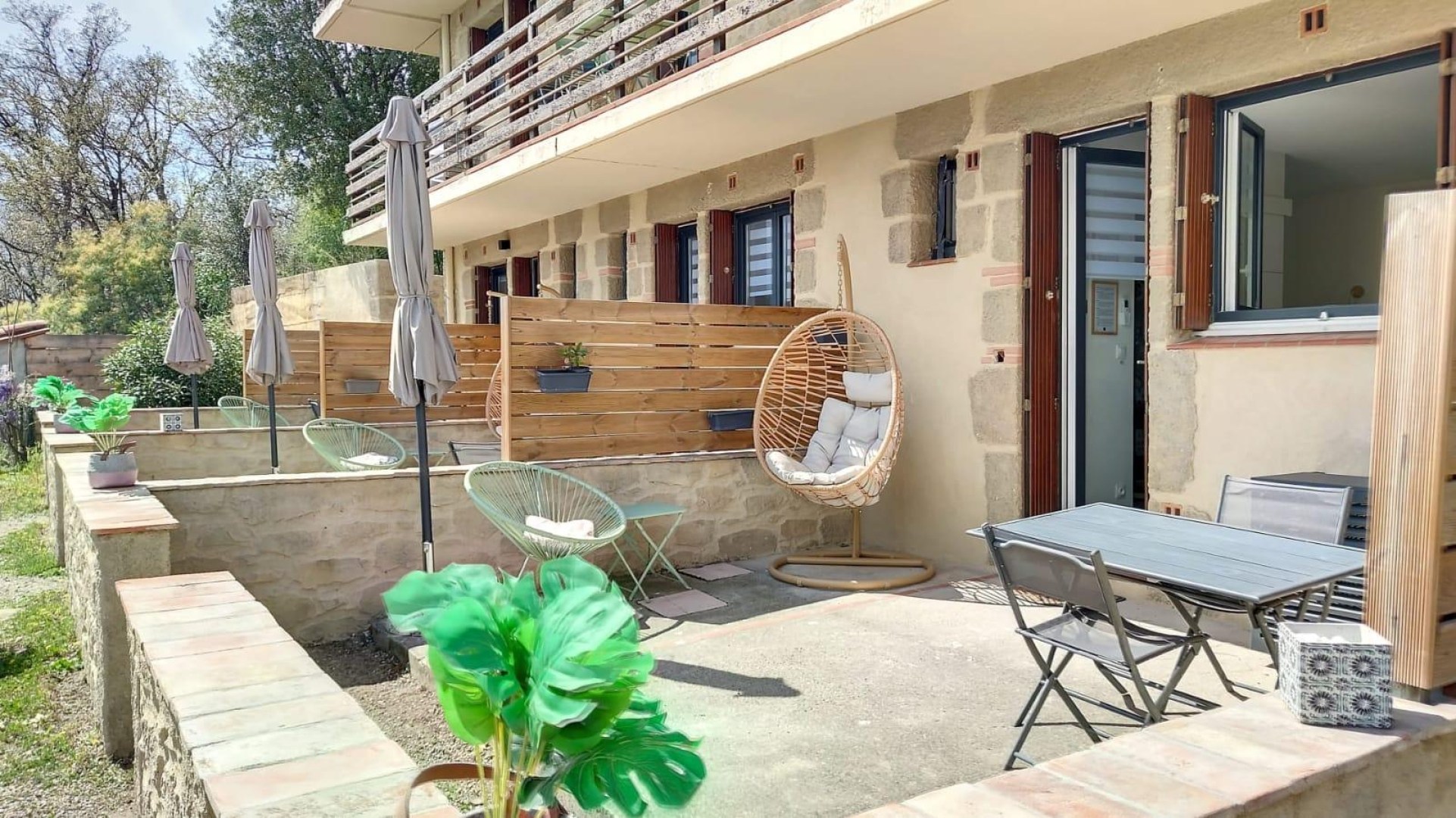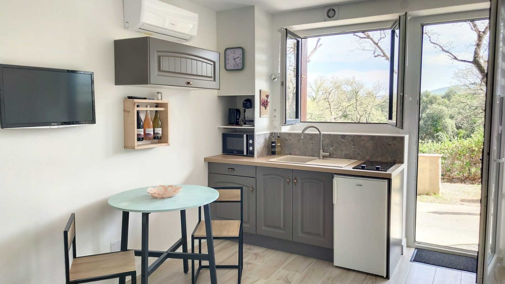 Vous apprécierez les grands espaces extérieurs de plus de 1,5 ha non clôturés, arborés de chênes lièges et d’oliviers. Studio, appartement ou villa…., choisissez ! En famille, entre amis, ce village de gîtes vous attend ! Vous séjournerez proche de la nature tout en étant à deux pas de l’animation, des plages et des criques ! La nouvelle piste cyclable EuroVelo8 passe devant le domaine. Pour chaque gîte, une place de parking privative et sécurisée est à votre disposition. En rez de chaussée : Ce joli studio, équipé d’une cuisine avec pièce à vivre (1 lit 140), d’une salle d’eau (wc), est ouvert sur sa terrasse (18 m²) avec vue sur le domaine.