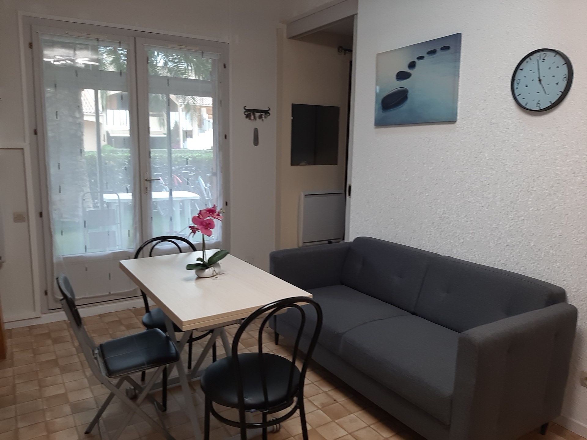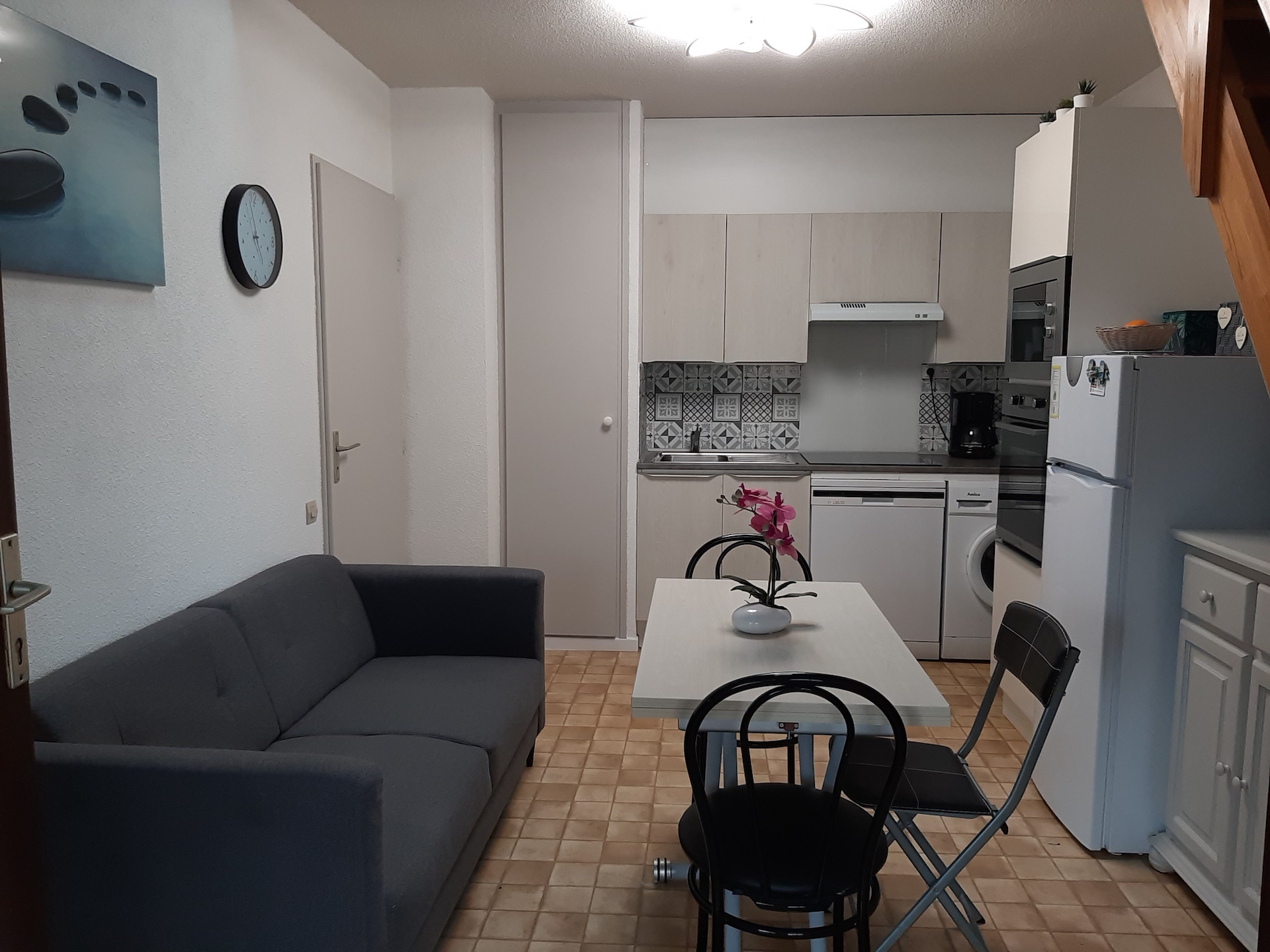 Rez de jardin climatisé en duplex pour 6 personnes tout confort offrant un extérieur d’environ 25m2 avec place de parking privée, piscine à 100m, plage à 400m, accès internet et prêt de vélos.