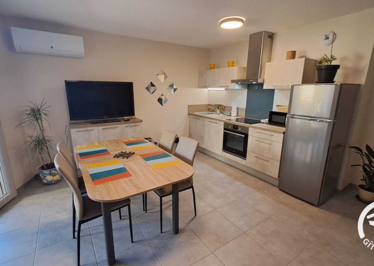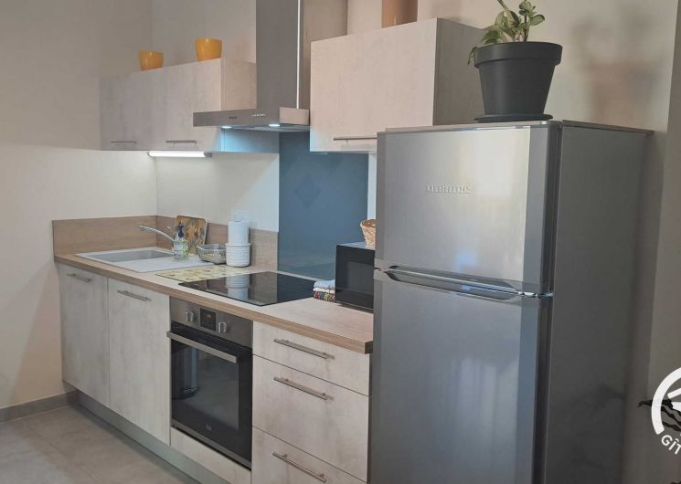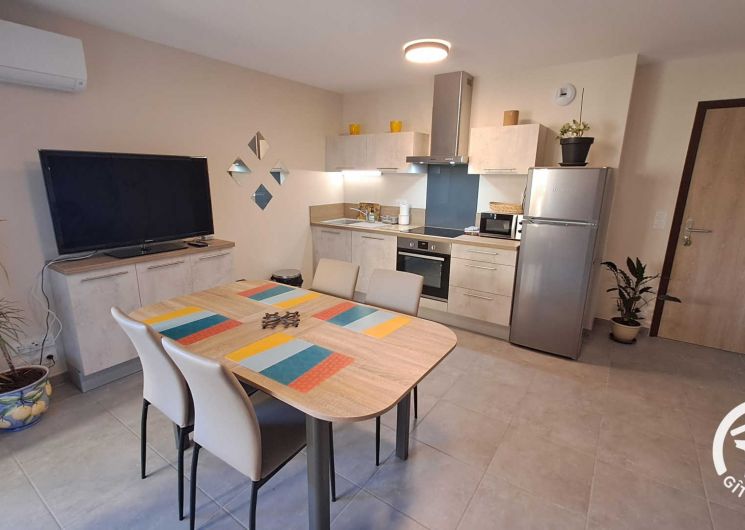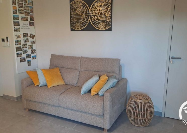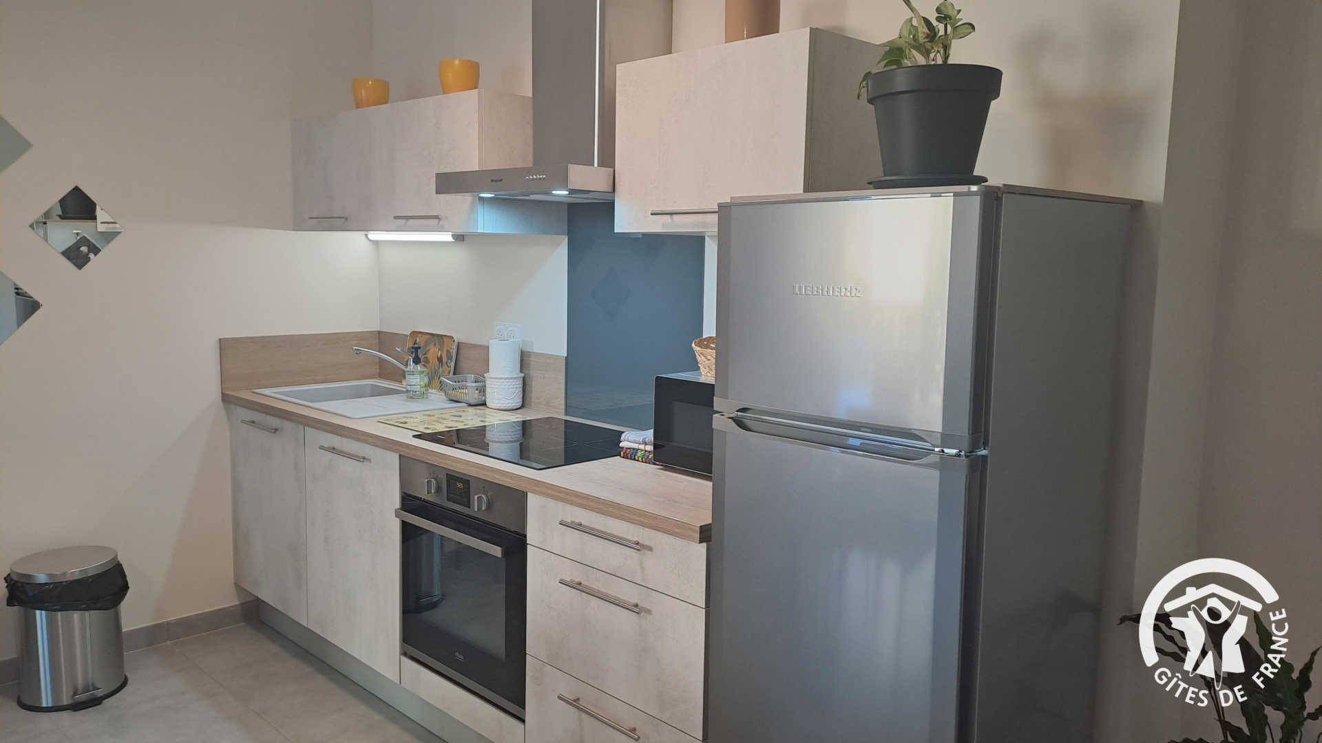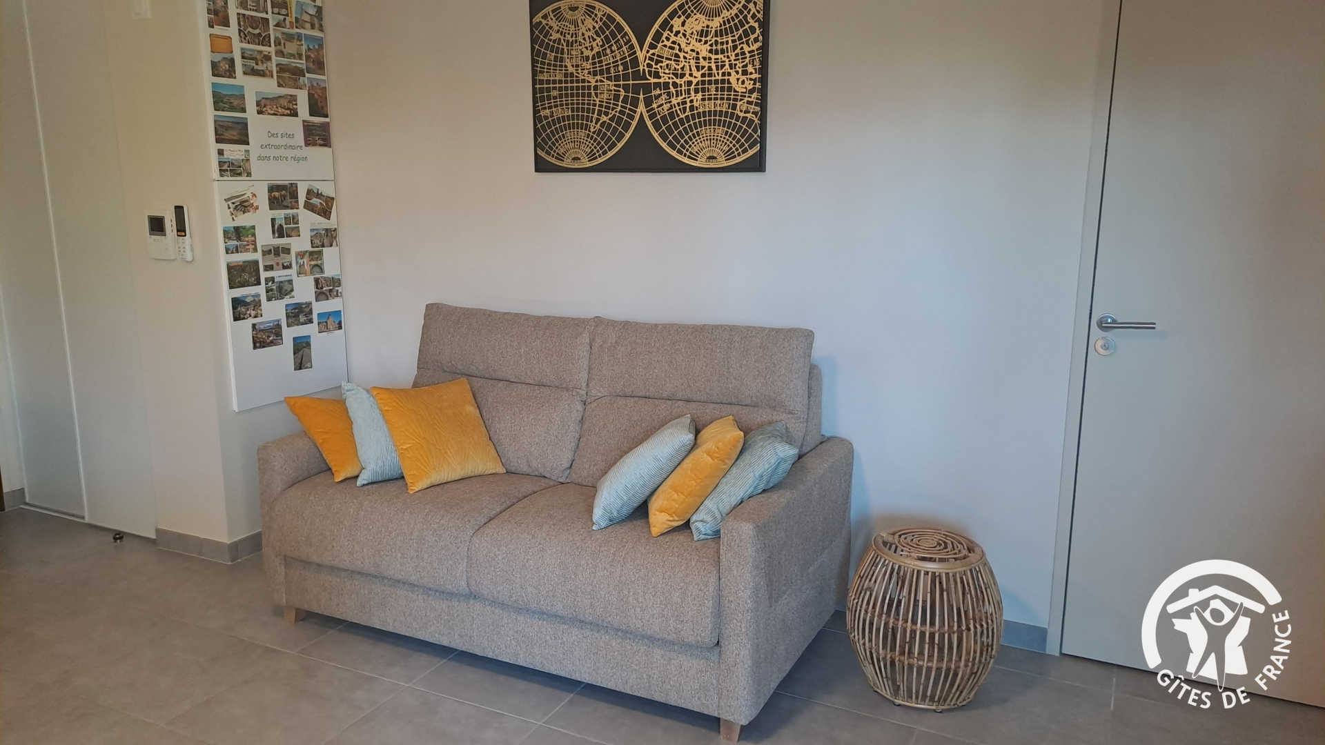 – Depuis l’entrée, se trouve une grande pièce à vivre comportant une cuisine ouverte parfaitement équipée et un salon avec un canapé convertible 2 places.