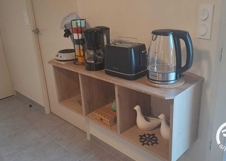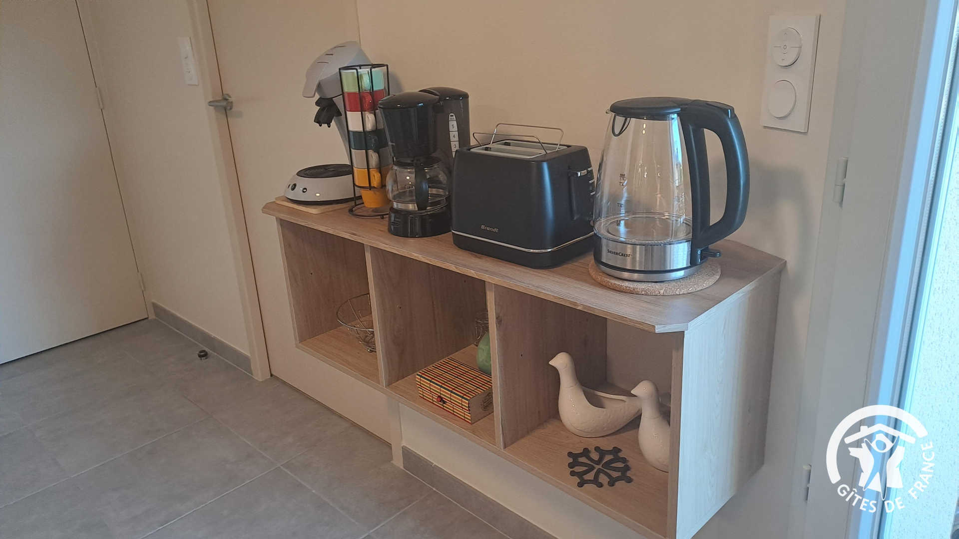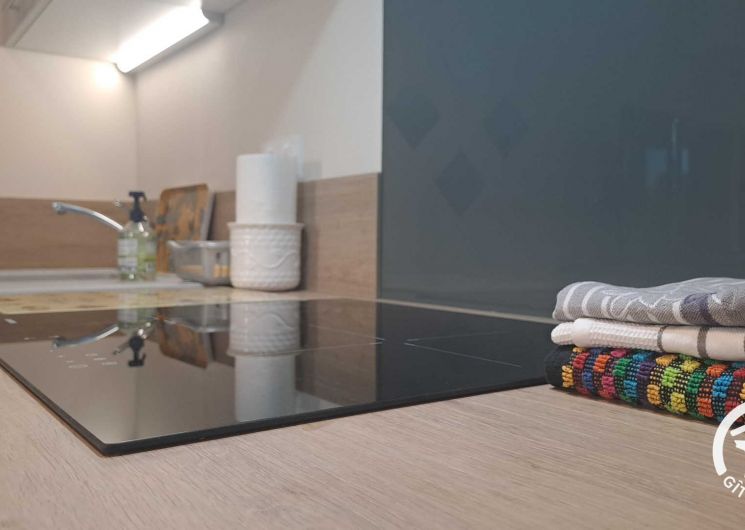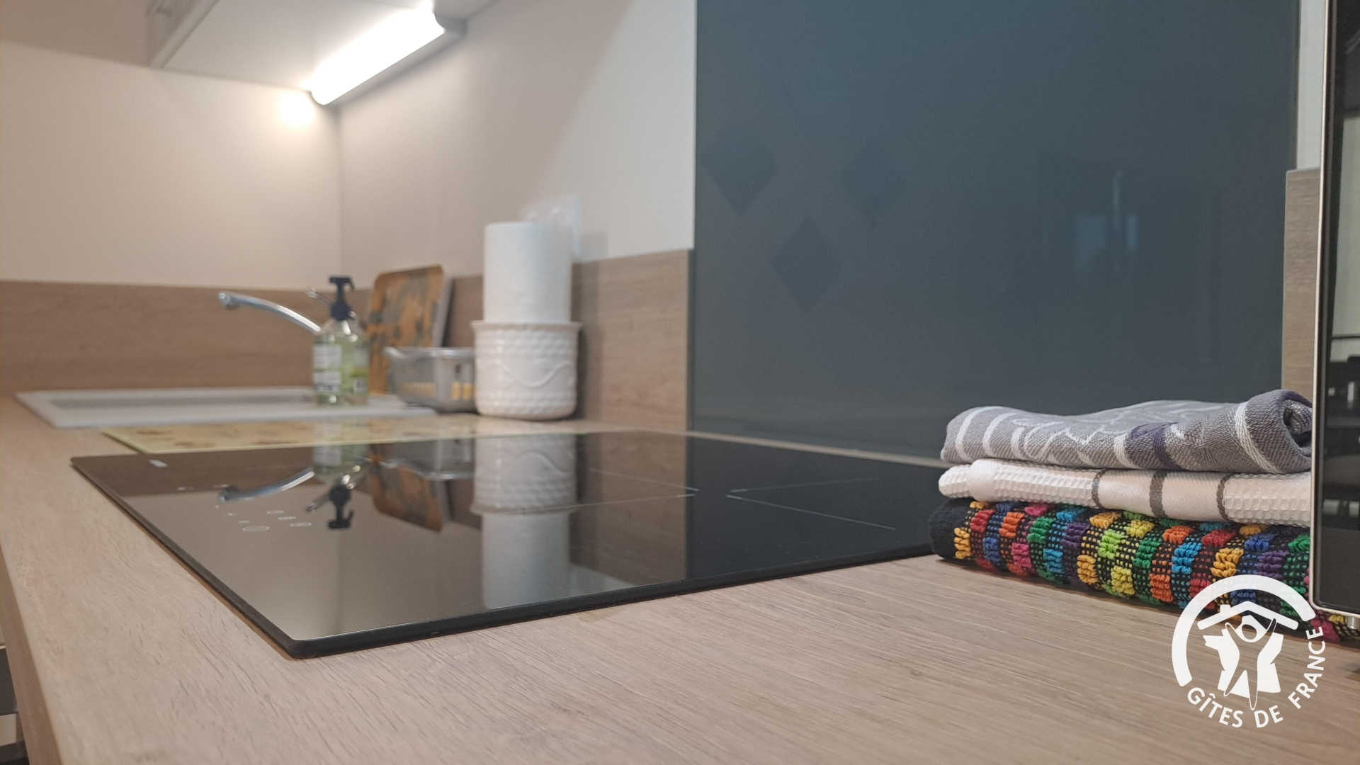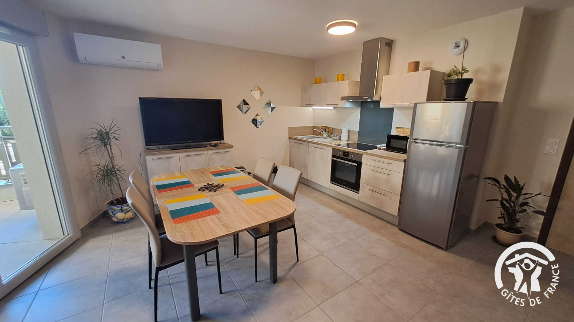 – Depuis l’entrée, se trouve une grande pièce à vivre comportant une cuisine ouverte parfaitement équipée et un salon avec un canapé convertible 2 places.