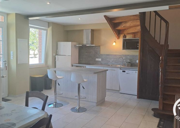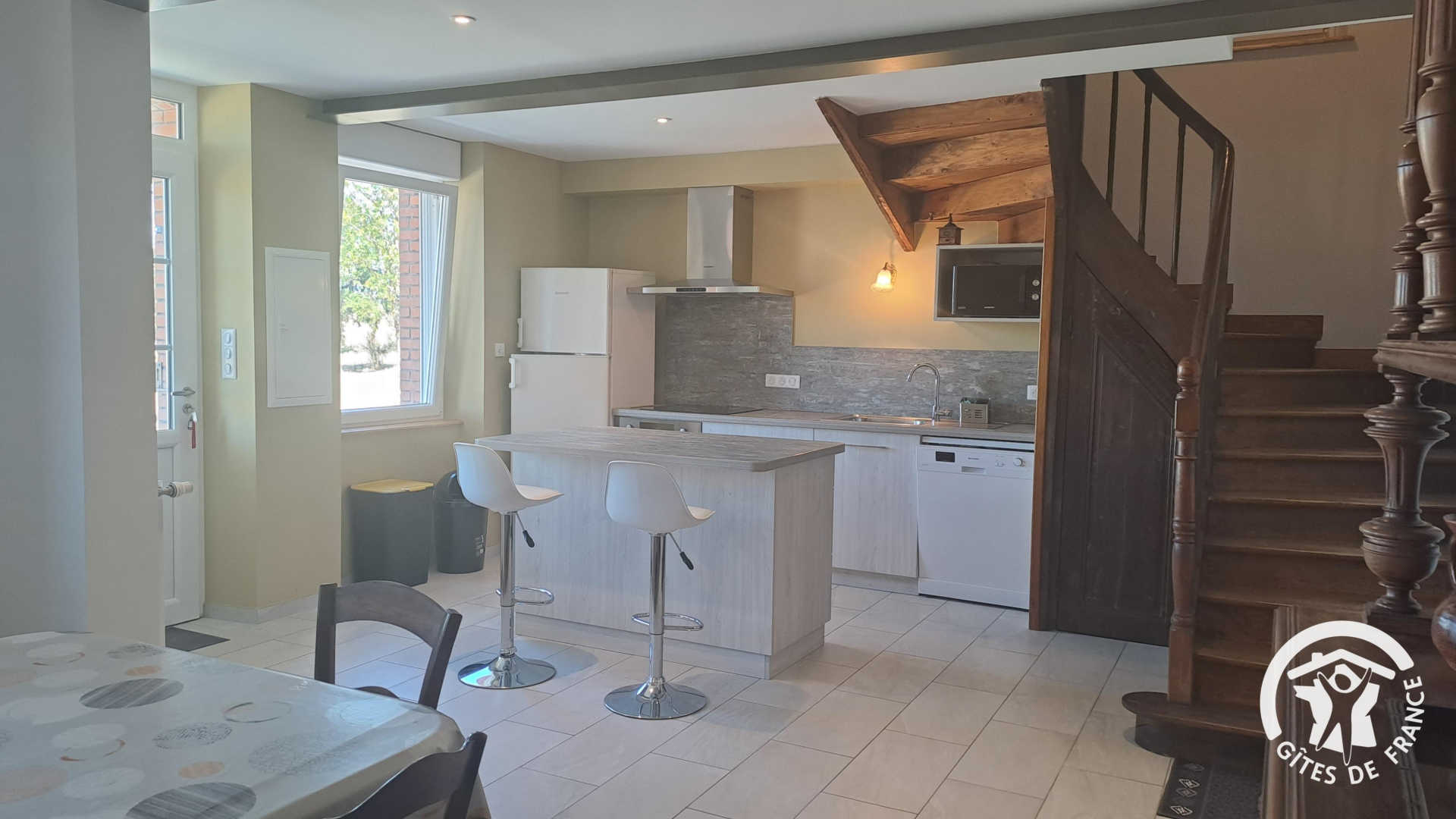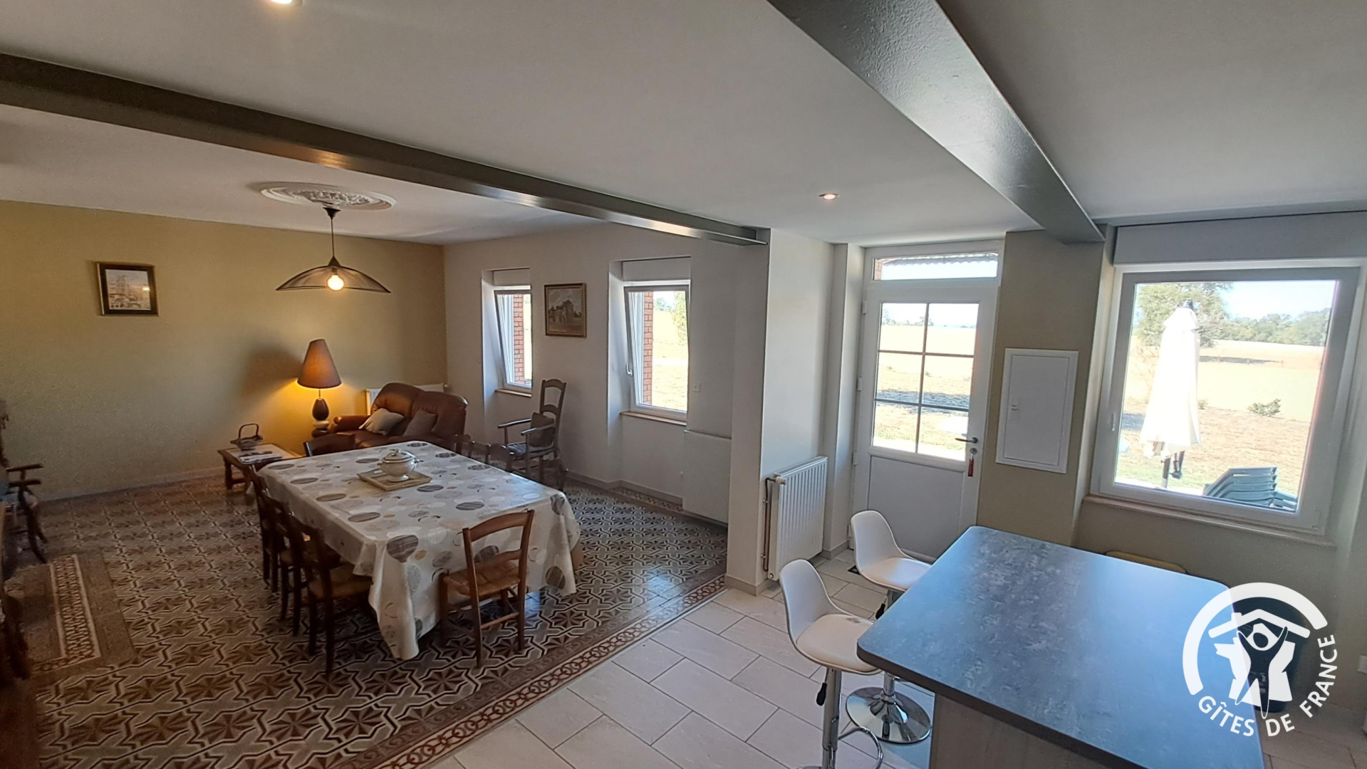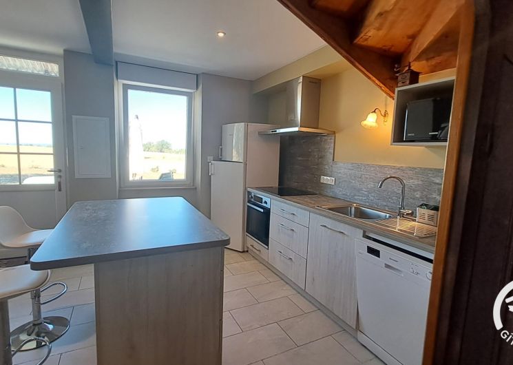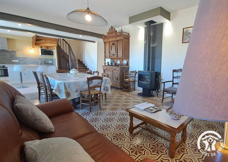 De la terrasse, on entre dans le gîte par la pièce à vivre, très grande, avec coin salle à manger (grande table, canapé, poêle à bois) et cuisine ouverte toute équipée (réfrigérateur-congélateur, four, micro-ondes, Tassimo®, lave-vaisselle, plaque induction…).