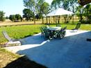 Jardin sur le devant, terrasse, barbecue, transats.