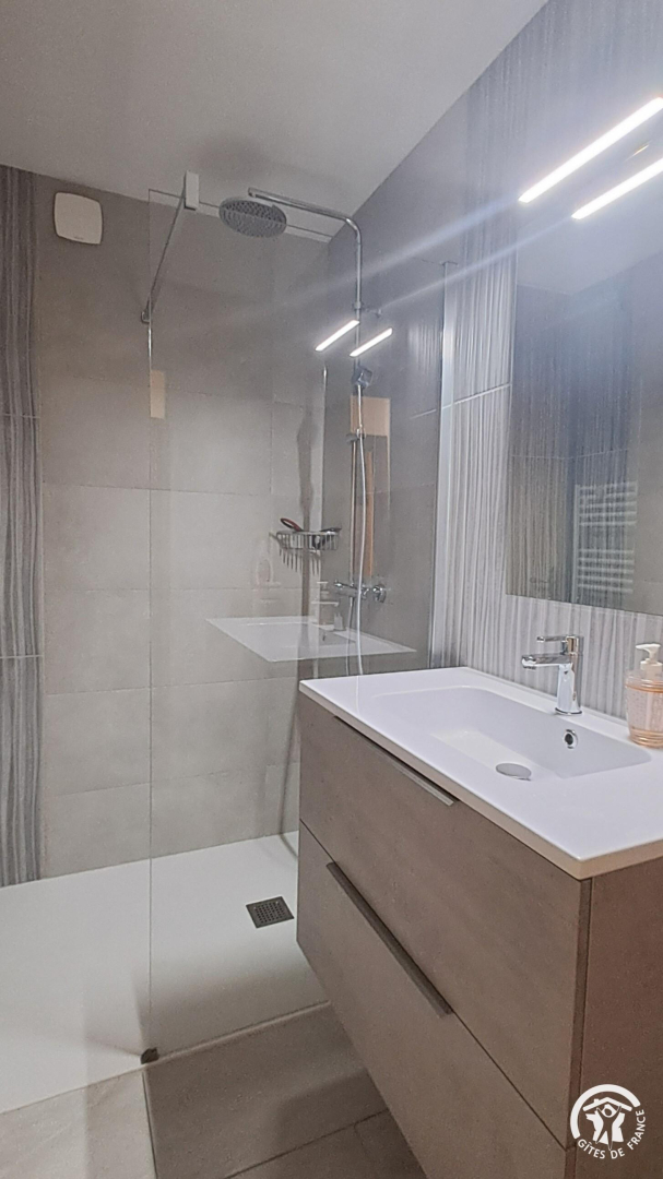 Au rez-de chaussée se trouve également un salon tv, avec un canapé convertible en 140x190cm et une douche, wc indépendant, et un espace rangement avec lave-linge.