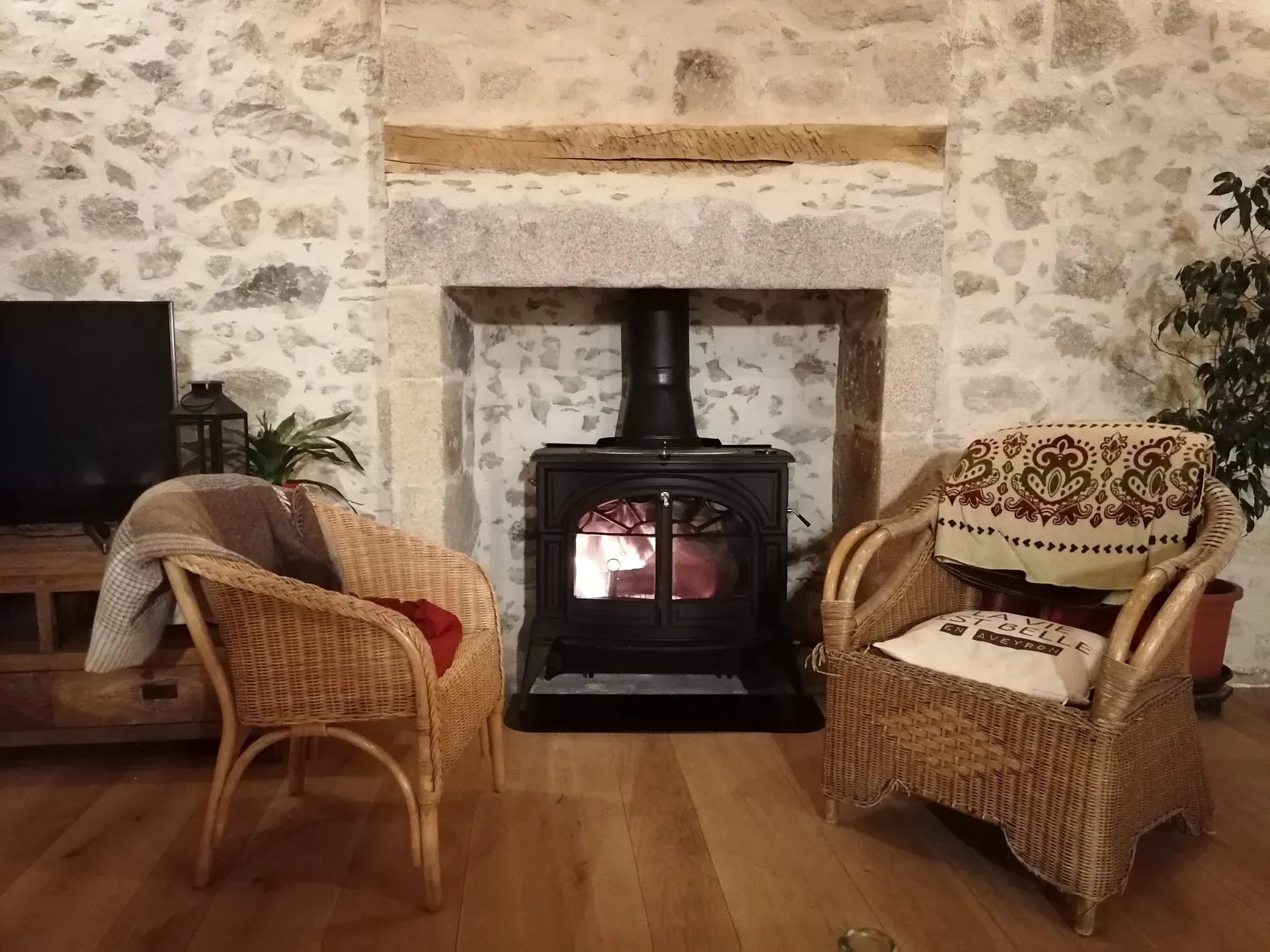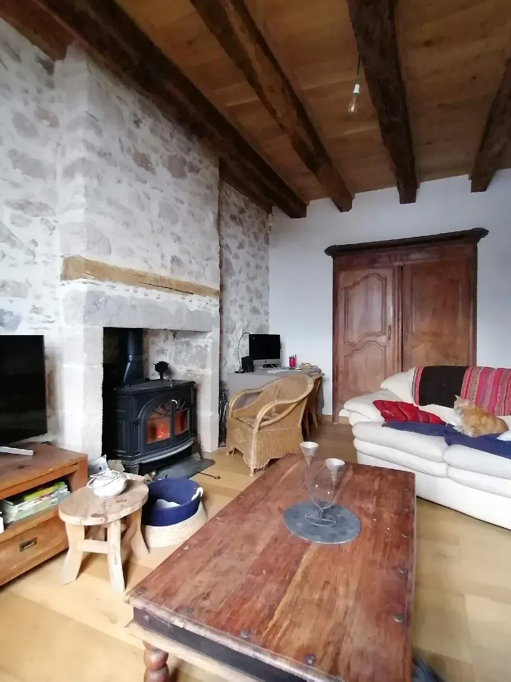 Vous entrez dans une grande pièce agréable de 50m2 avec salon et table à manger. Une nouvelle cuisine et poêle à bois se sont installés. Cette pièce possède 2 armoires anciennes originales. L’escalier mène à 2 chambres, une salle de bains avec douche et baignoire et des toilettes séparées.